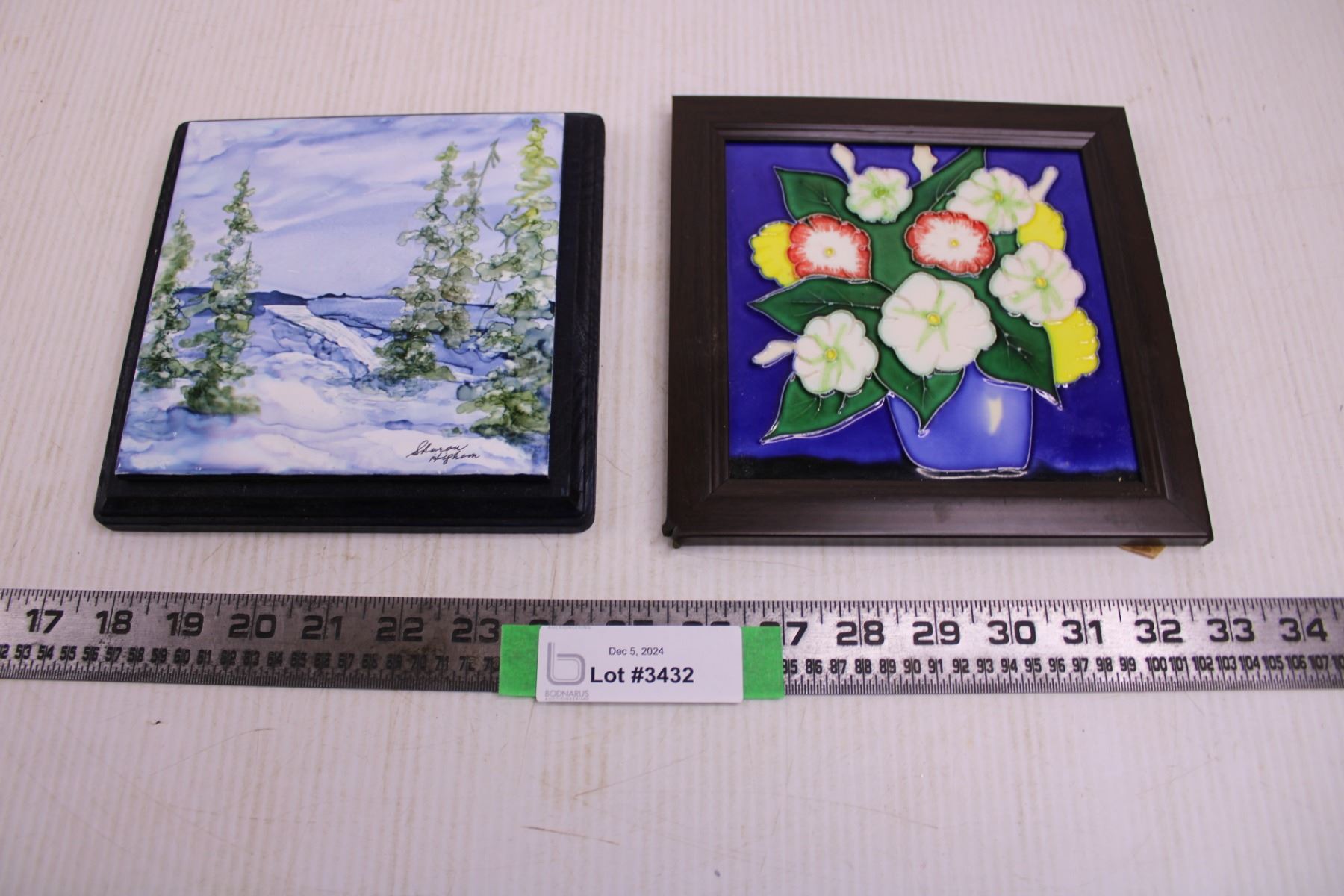 (2) Wooden Plaque Wall Art (Flowers 7.5" x 7.5", "Winter Blues" 7" x 7" - Artist: Sharan Higham)