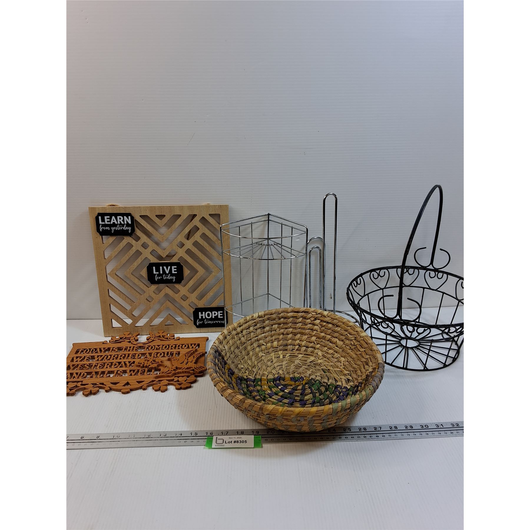 (2) Wooden Signs, Woven Basket, Metal Basket, Misc