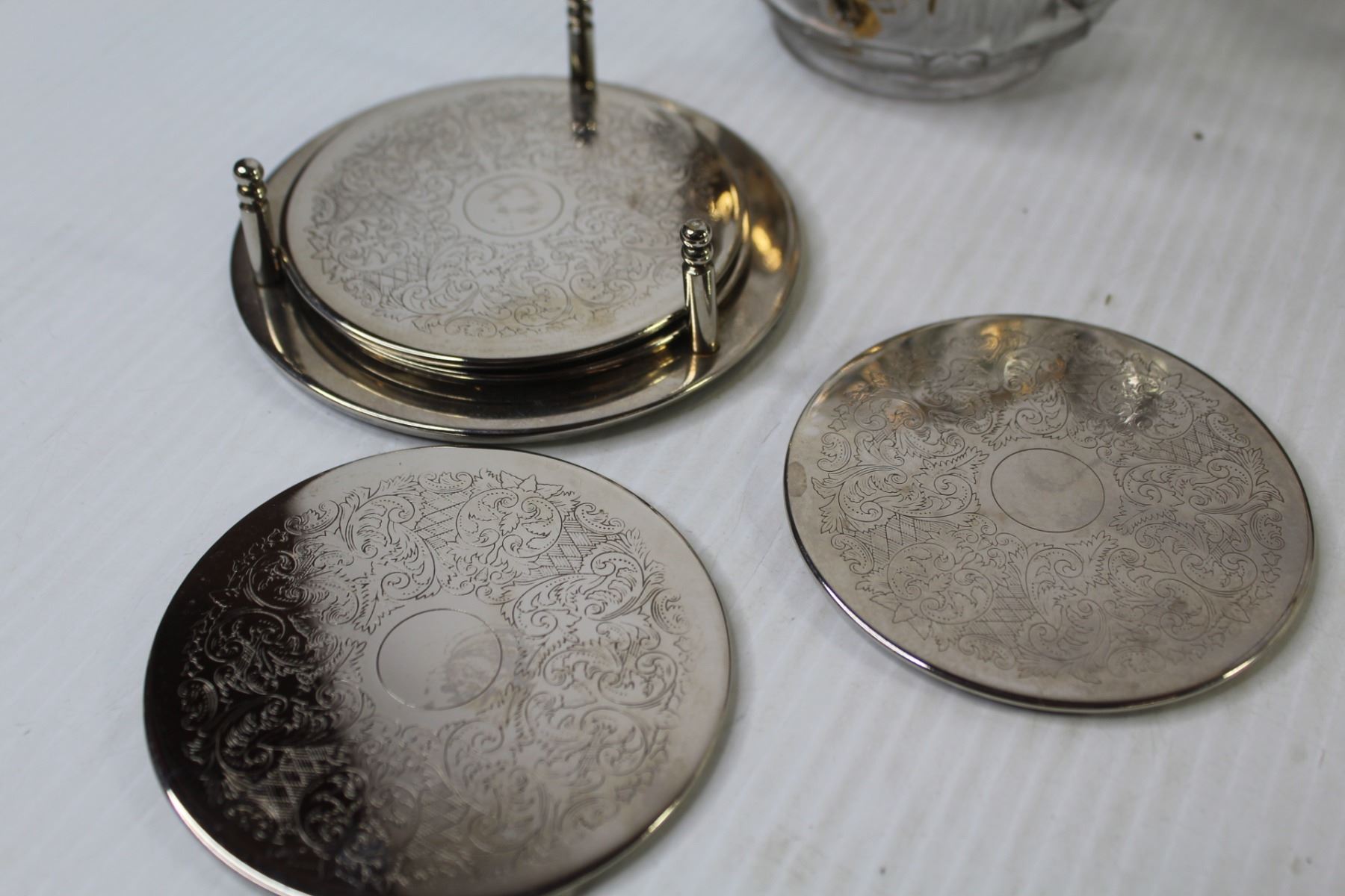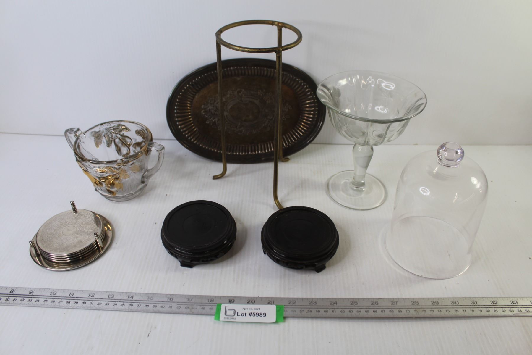 (2) Wooden Stands - Flowered Stemmed Glass Dish - Sugar Bowl - Metal Coasters - Glass Dome Cover - Metal Tray