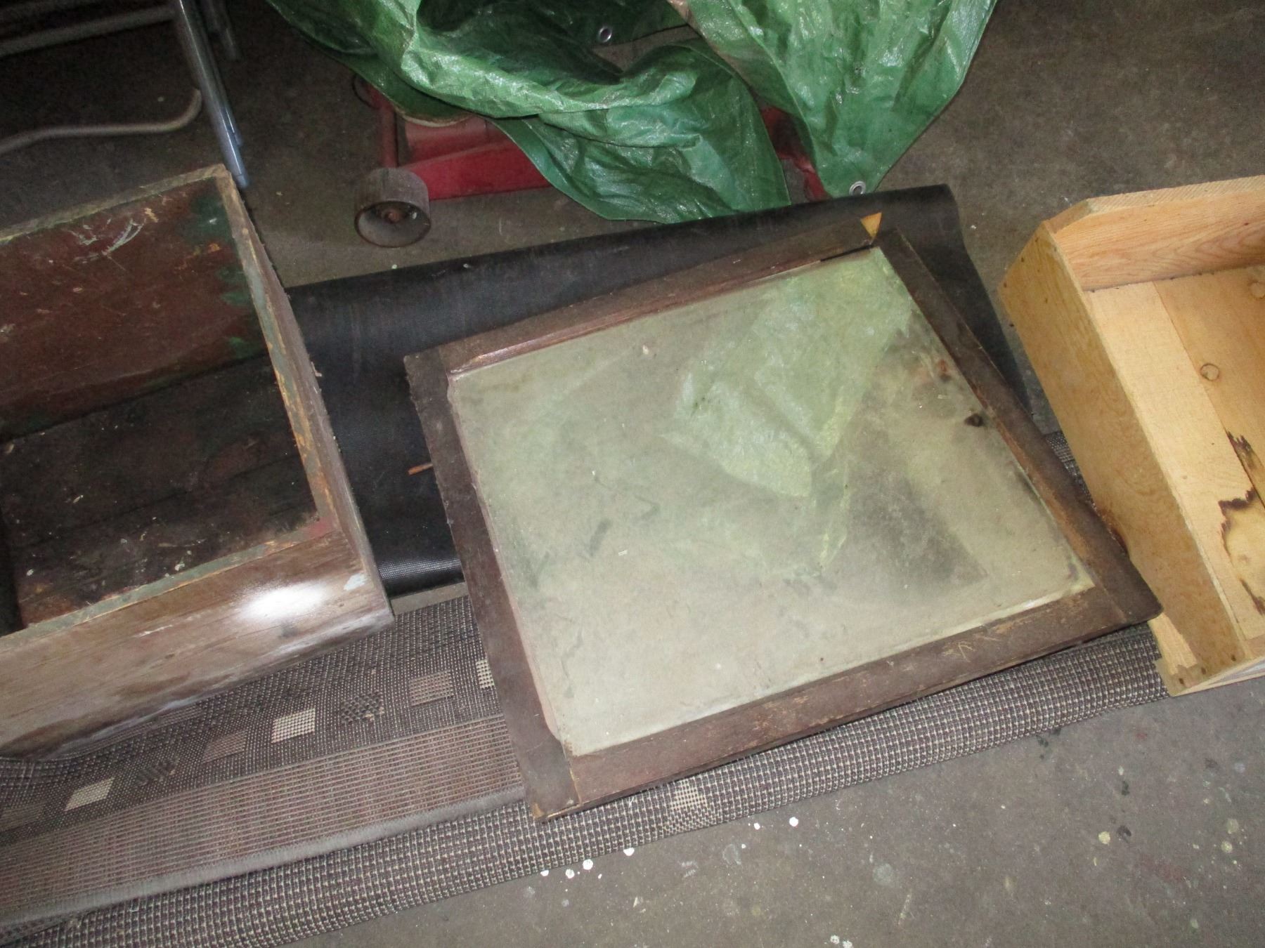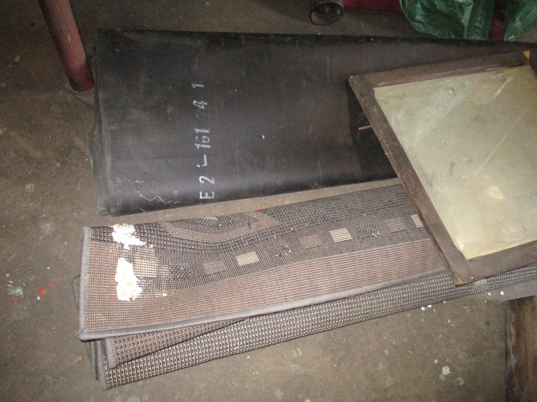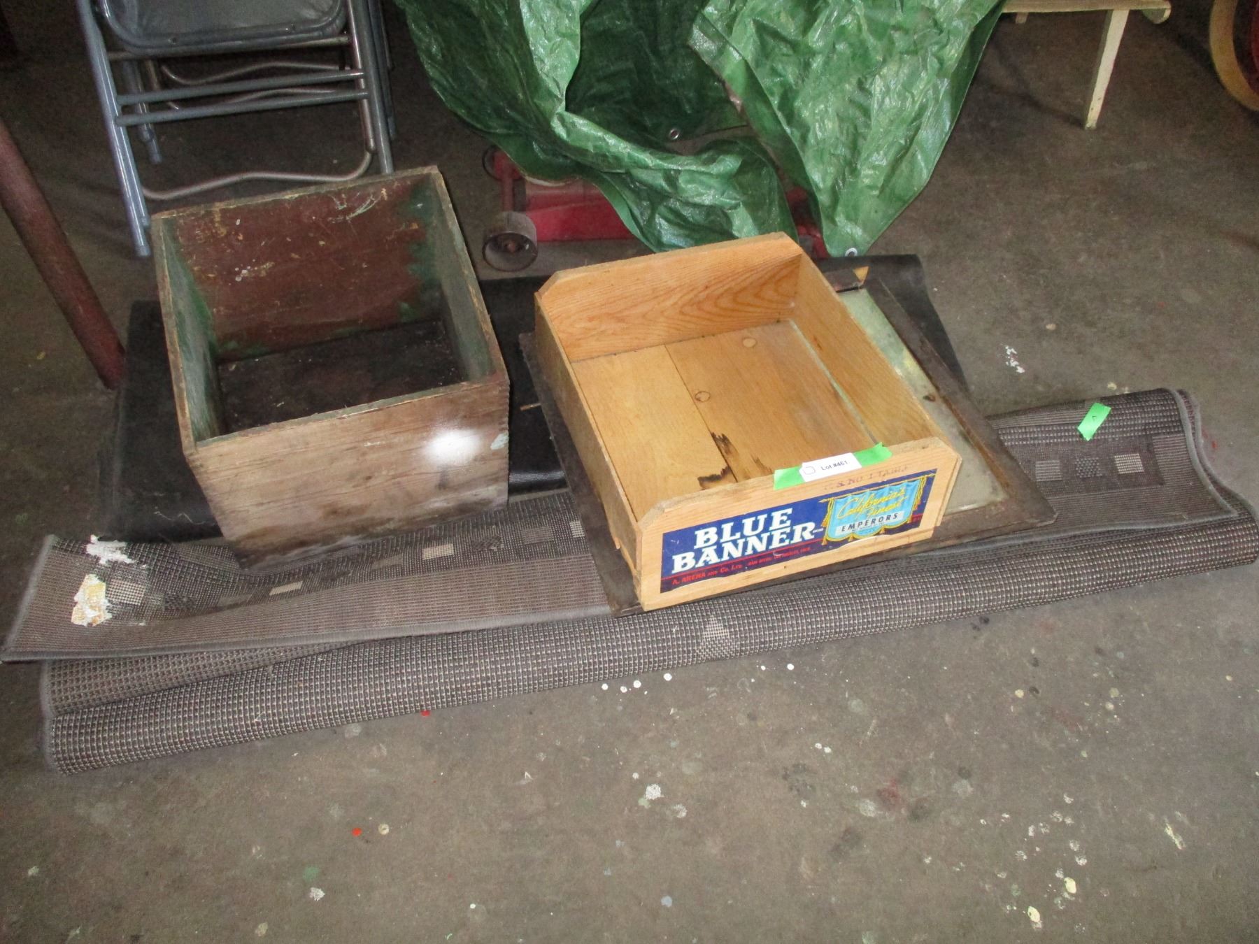 2 area rugs (1 is rubber needs cleaning) wooden box, mirror (needs repair)