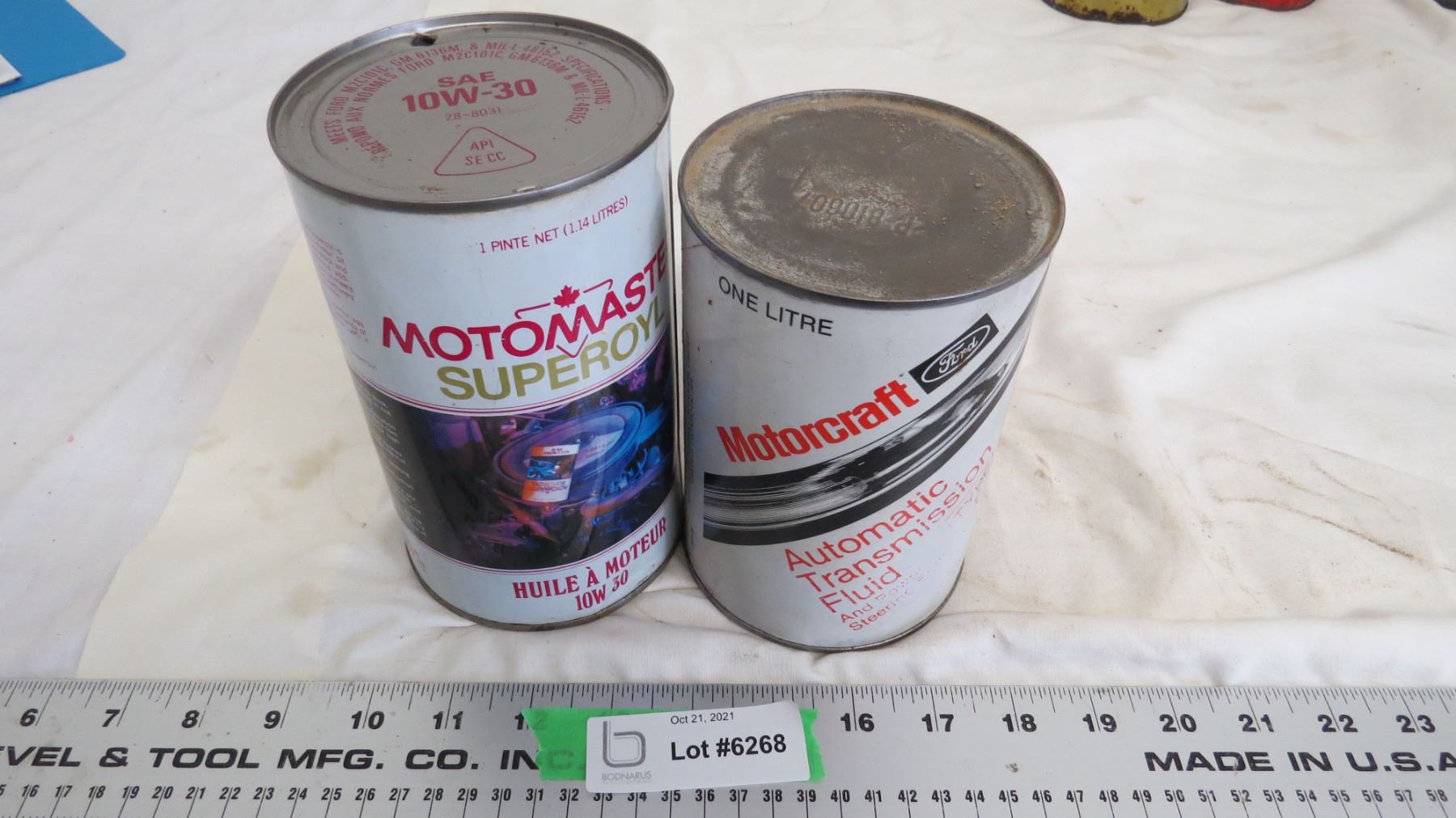 2 motomaster cans(empty), motocraft transmission fluid (full) one litre cardboard can