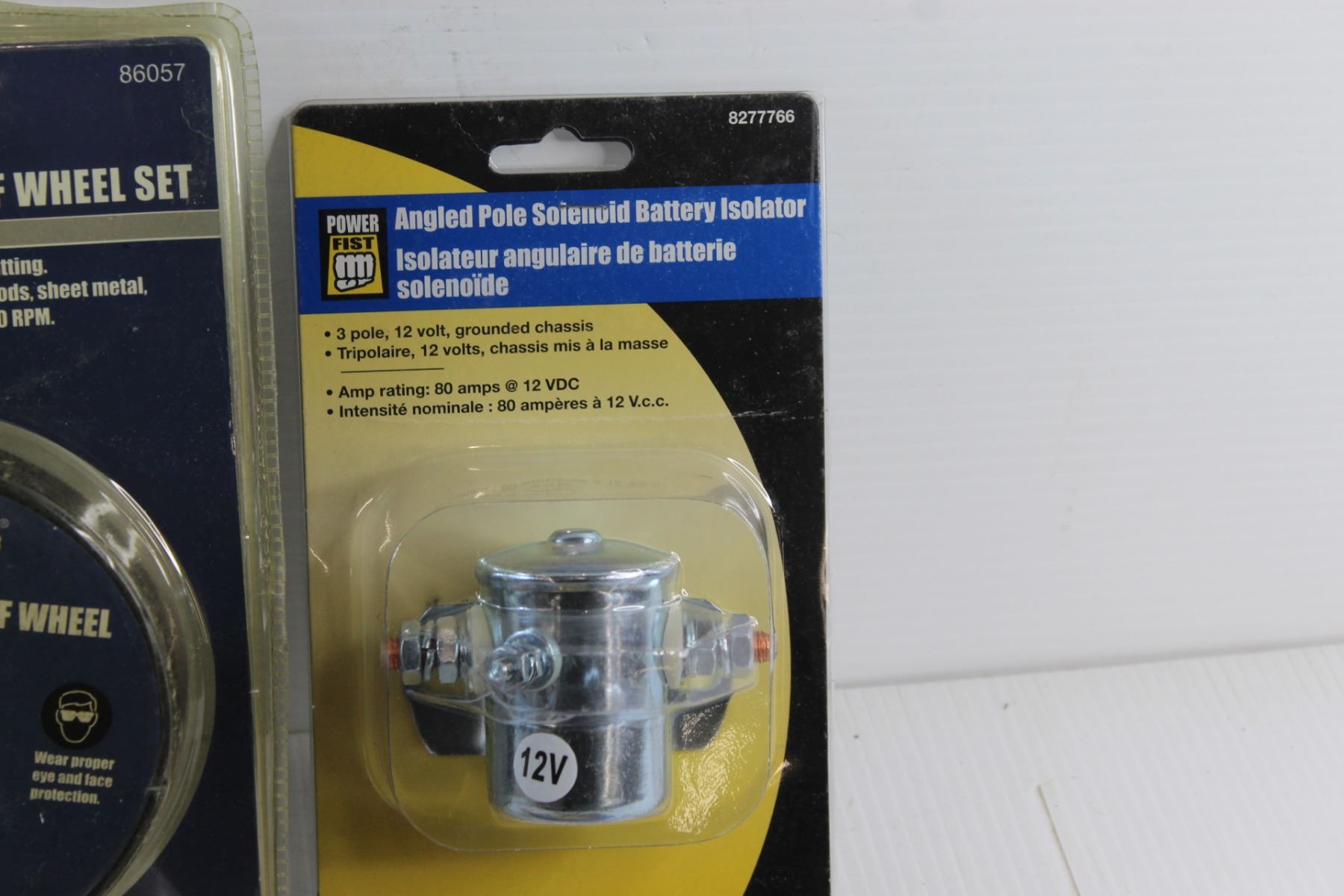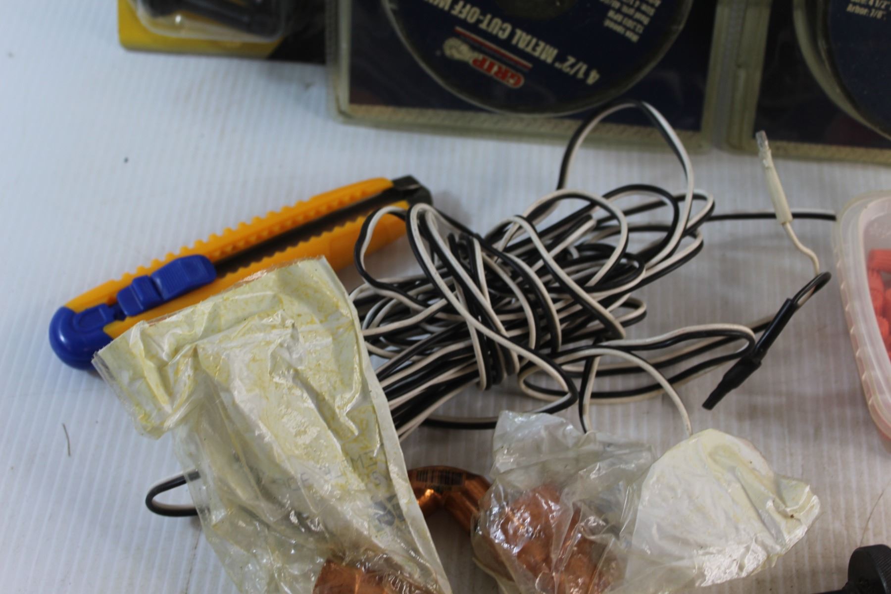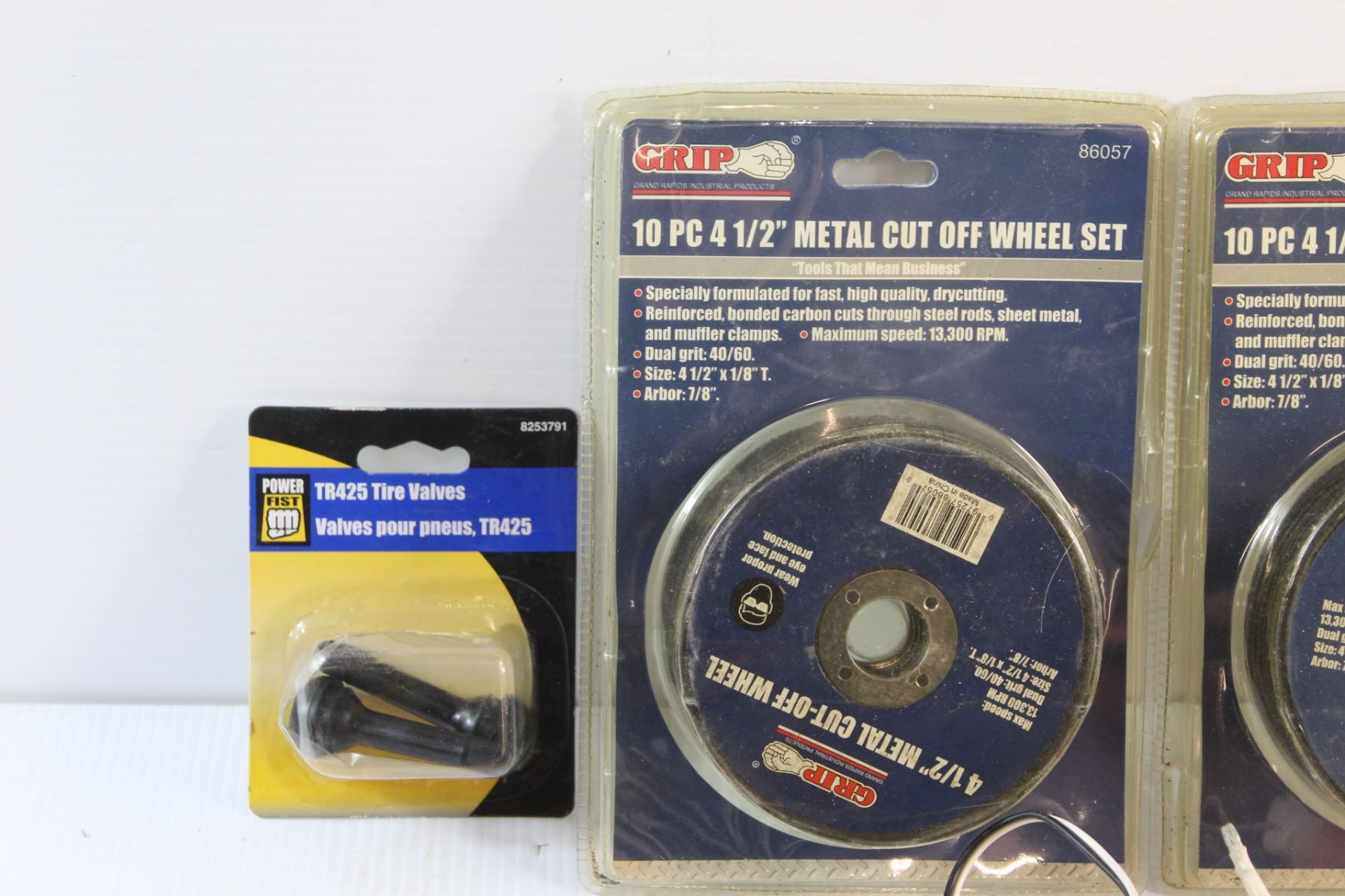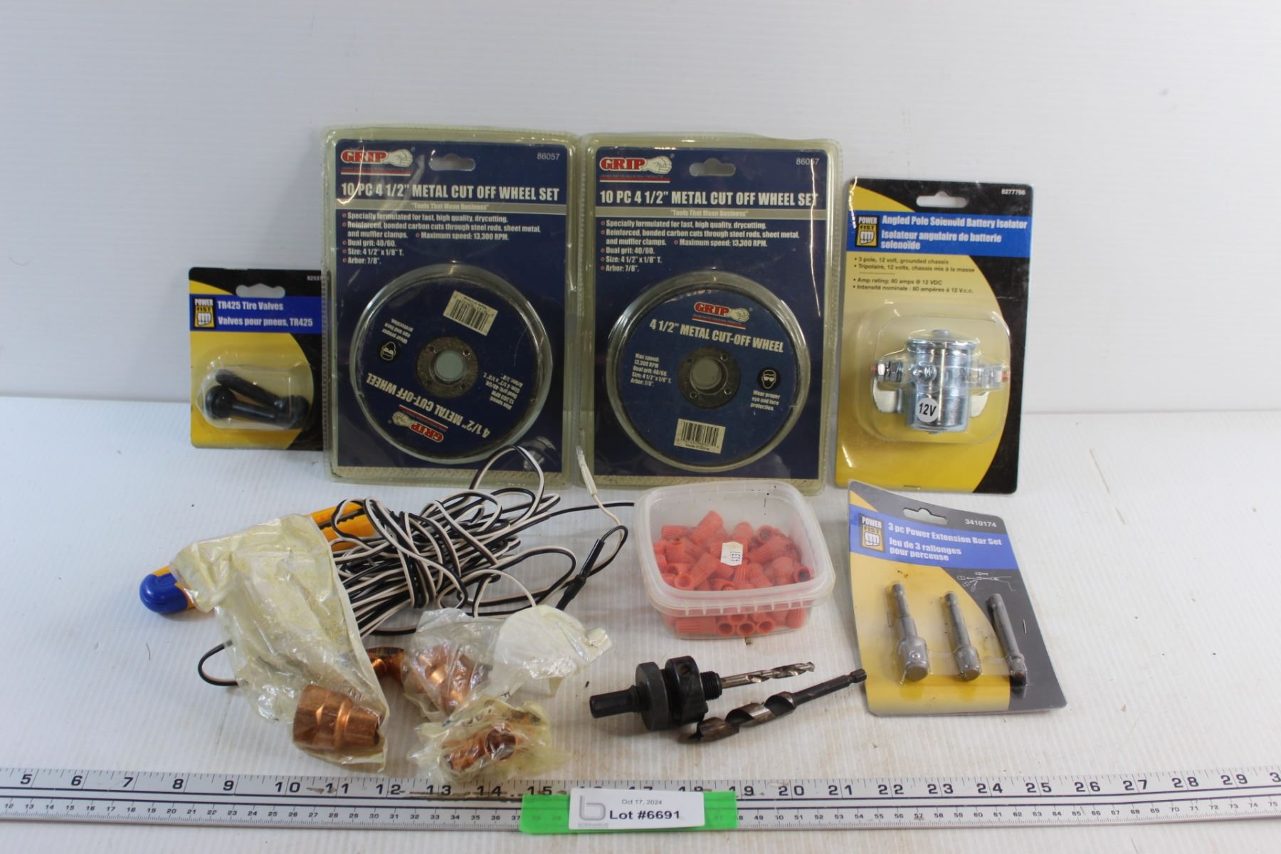 20 pc 4 1/2'' Metal Cut Off Wheel Set, Angled Pole Solenoid Battery Isolator. Tire Valves, Power Extension Bar Set and Assorted Items