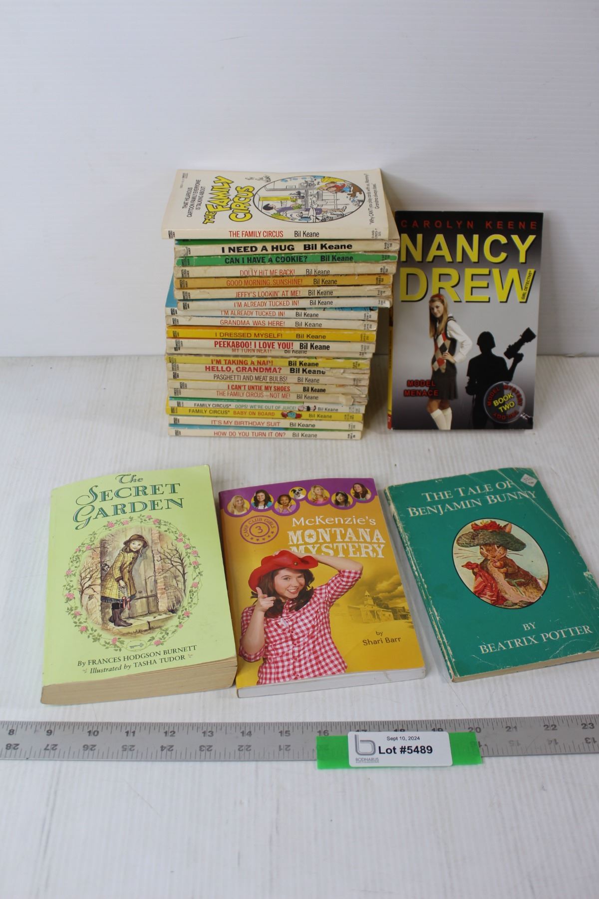 (21) Family Circus Books, The Secret Garden Book, McKenzie's Montana Mystery, Nancy Drew, the Tale Of Benjamin Bunny