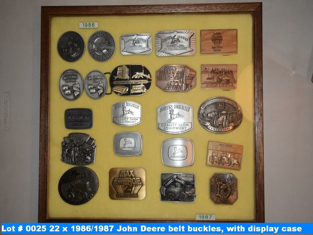 22 x 1986/1987 John Deere belt buckles, with display case