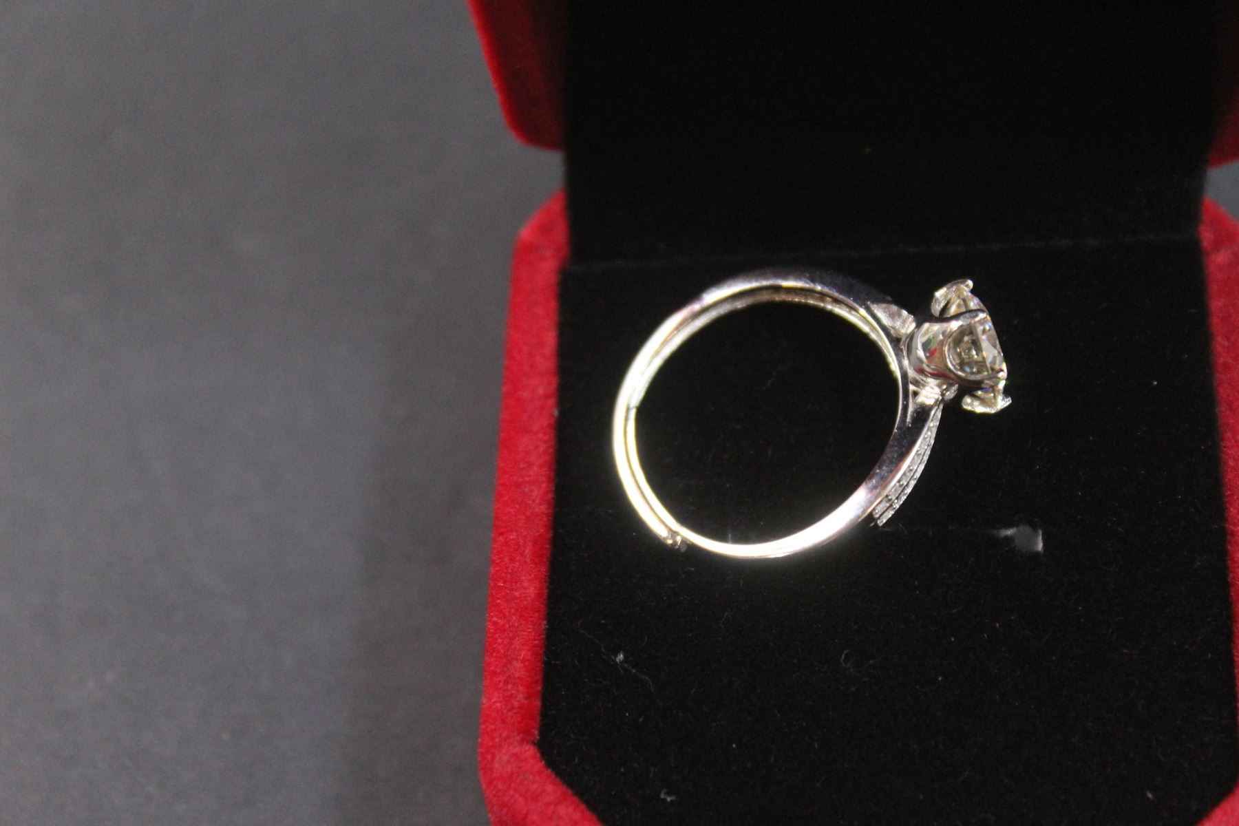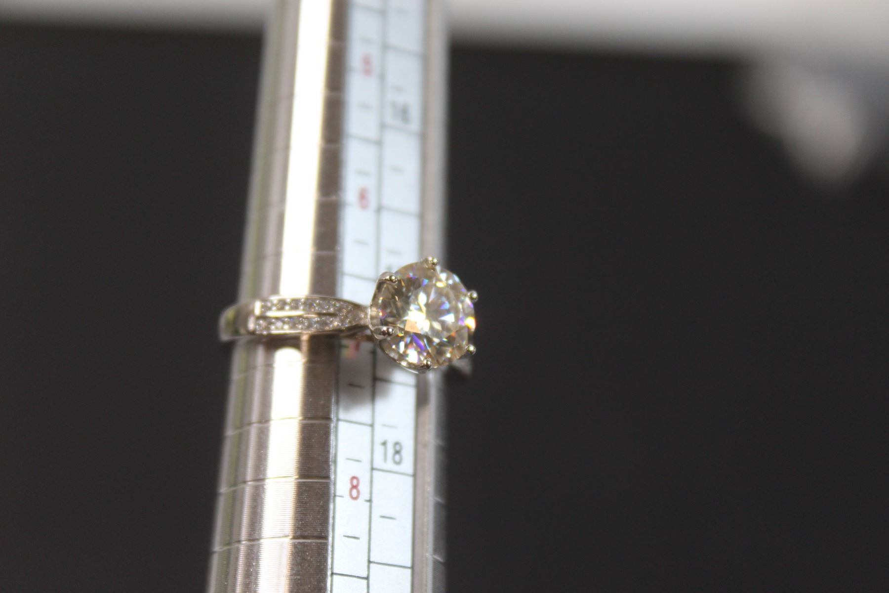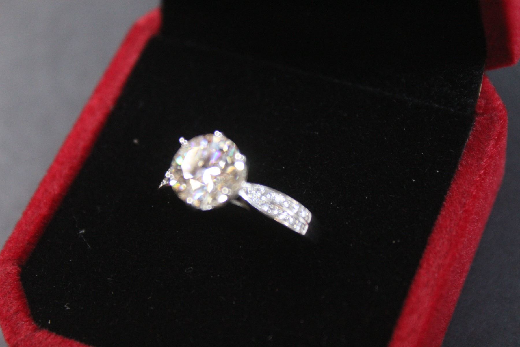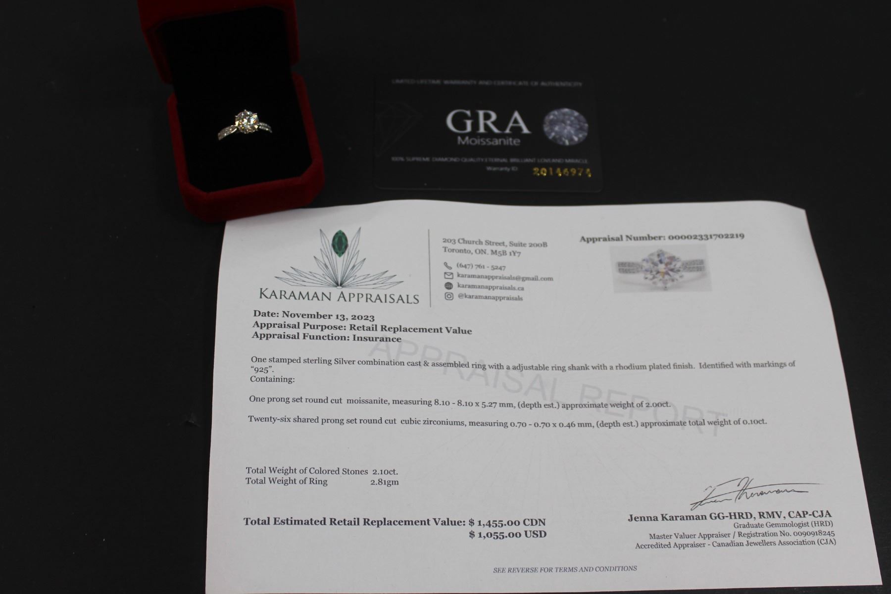 ^ 2ct. GRA Certified Round Brilliant Cut Moissanite Stone VVS D Color w/ (26) Round Brilliant Cut Cubic Zirconia set in Sterling Silver - Ring is Adjustable