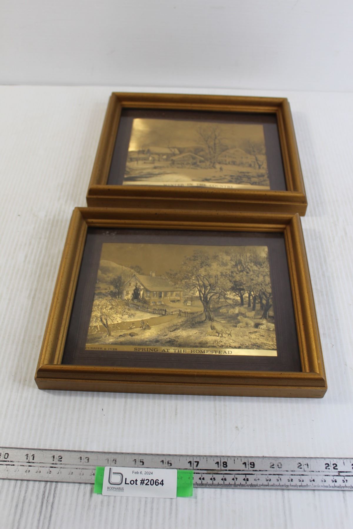 (2x Bid Price) Currier & Ives (Gold Foil?) Framed Vintage Prints - 9" x 11"