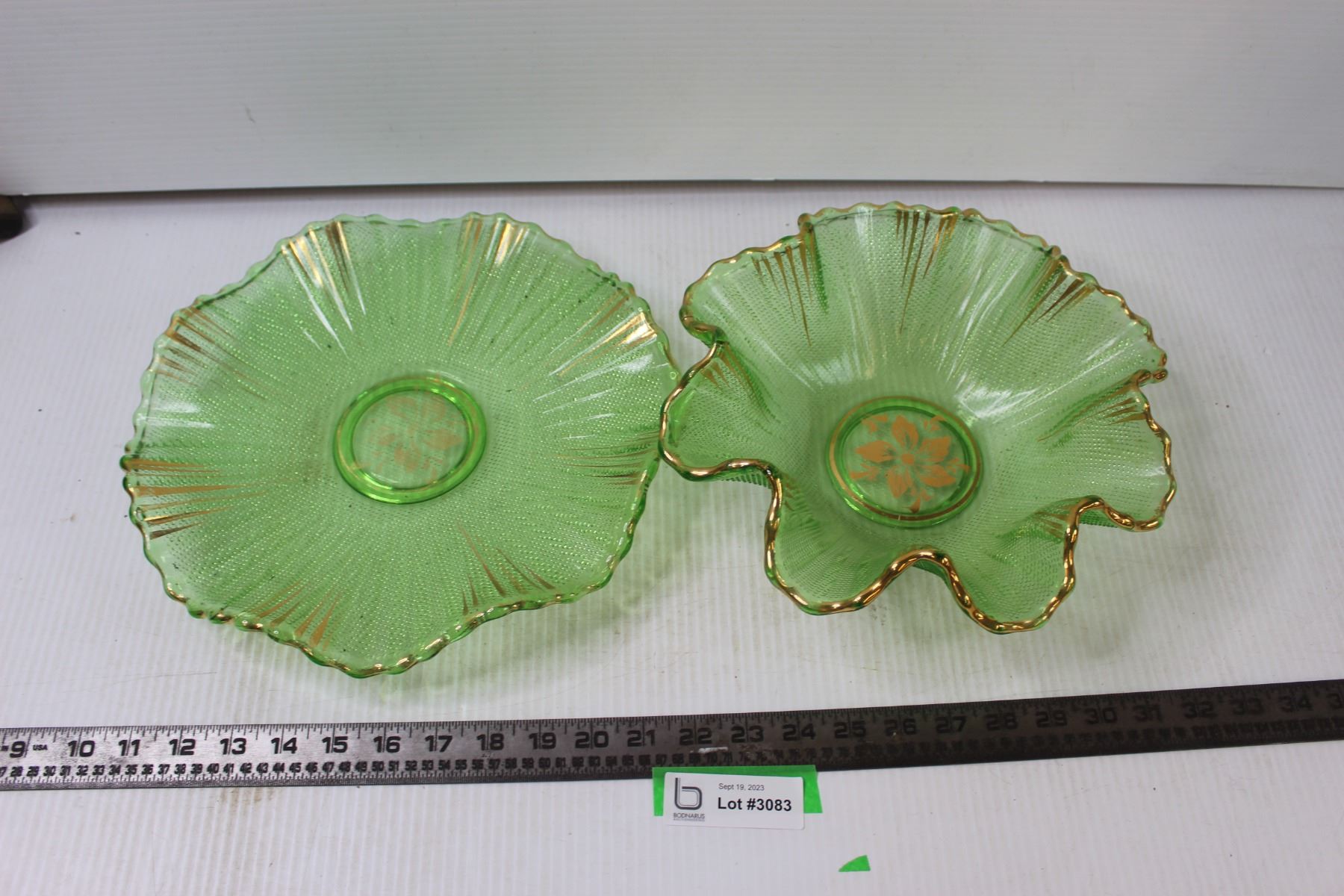 (2x Bid Price) Green Glass Ruffled Bowl and Tray