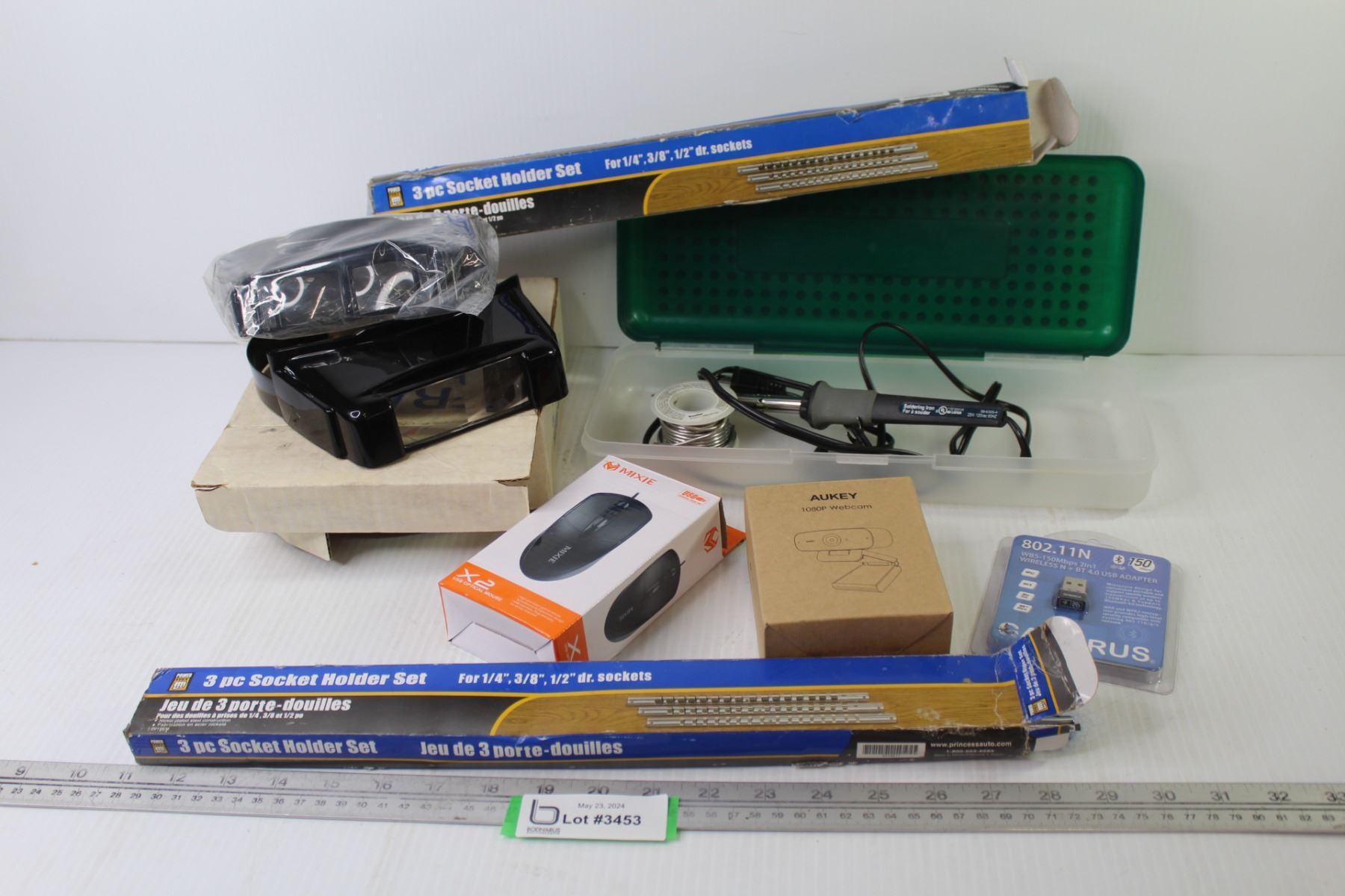 (3) 3 Piece Socket Holder Sets - Soldering Iron - Plastic Case - Aukey 1080 Webcam - Mixed USB Optical Mouse - (2) Slip-on 3-D Binocular Head Sets