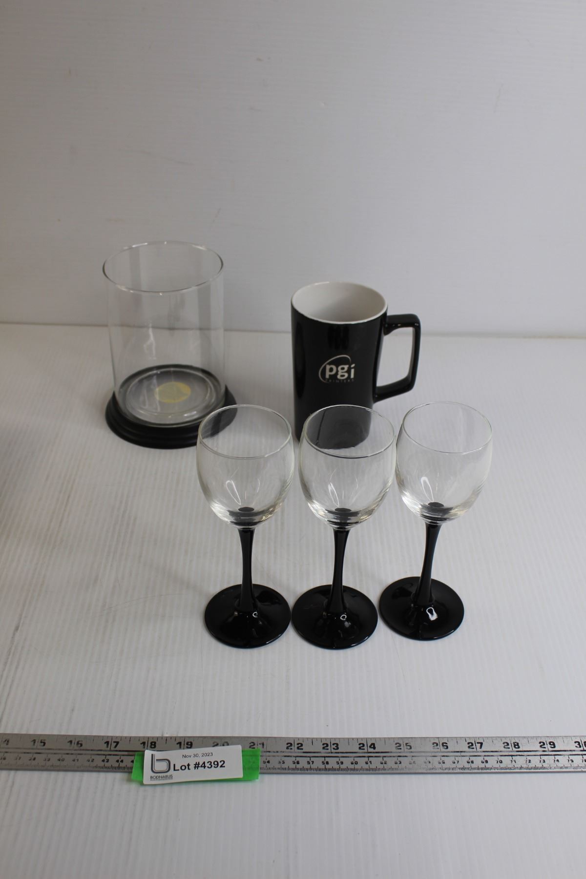 (3) Black and Clear Wine Glasses, Large PGI Mug, Vase with Base