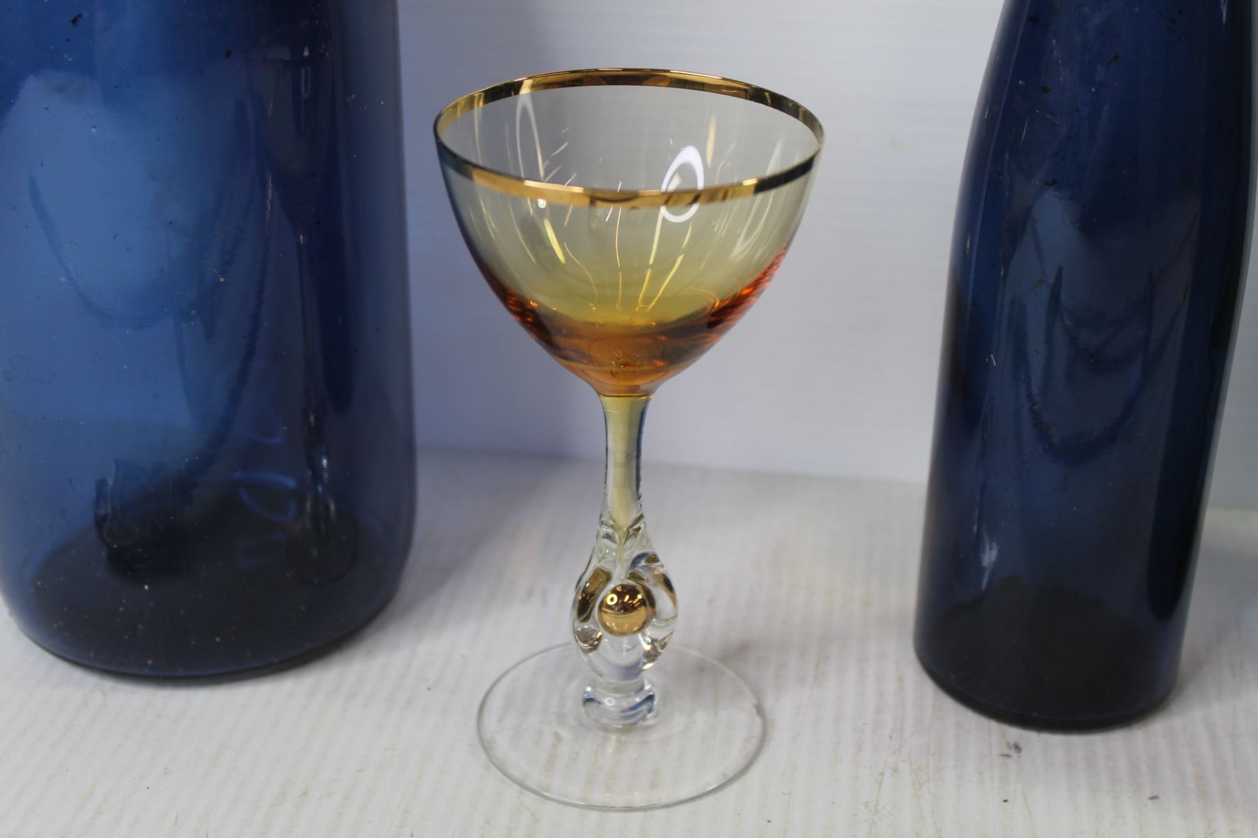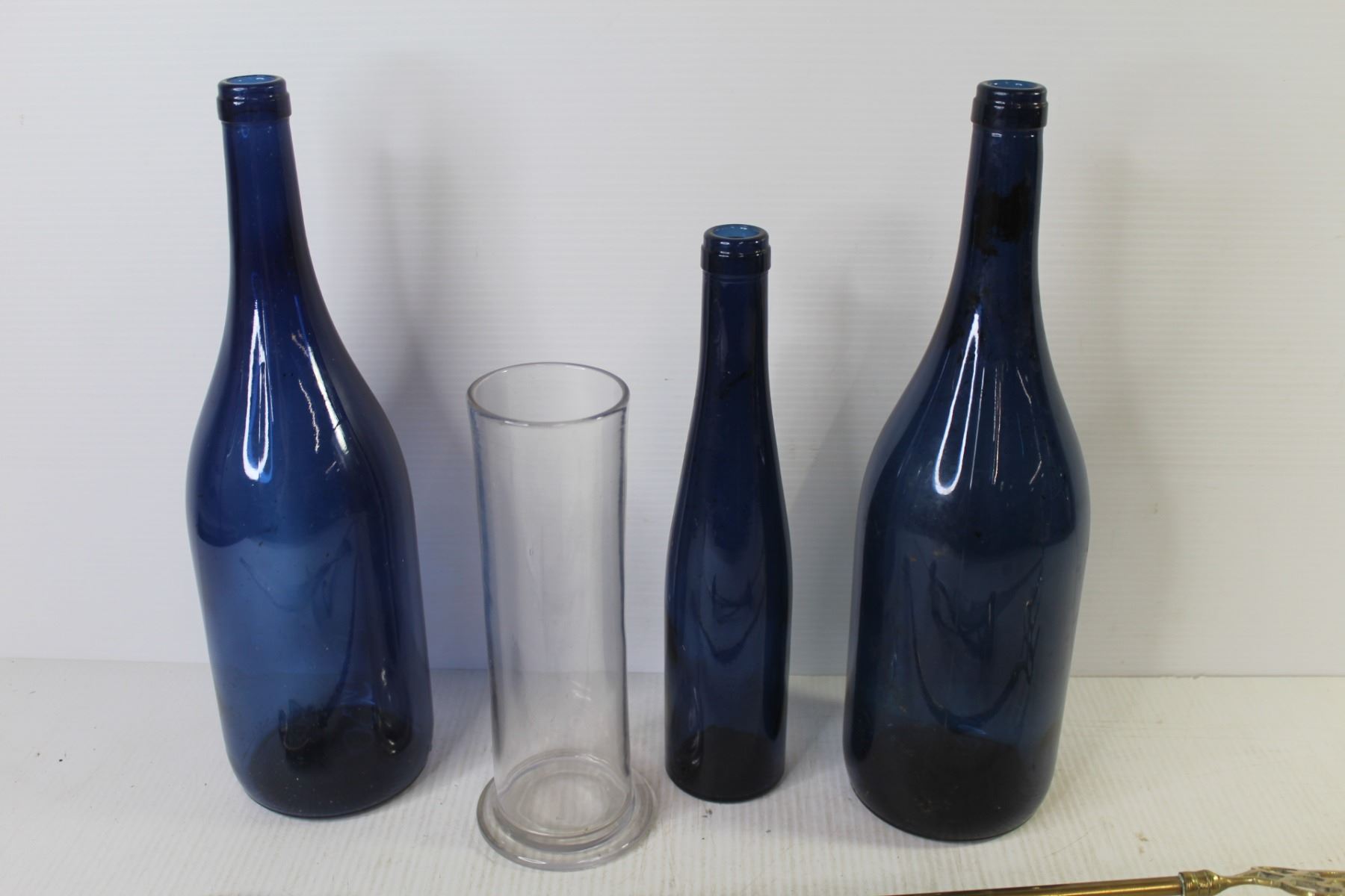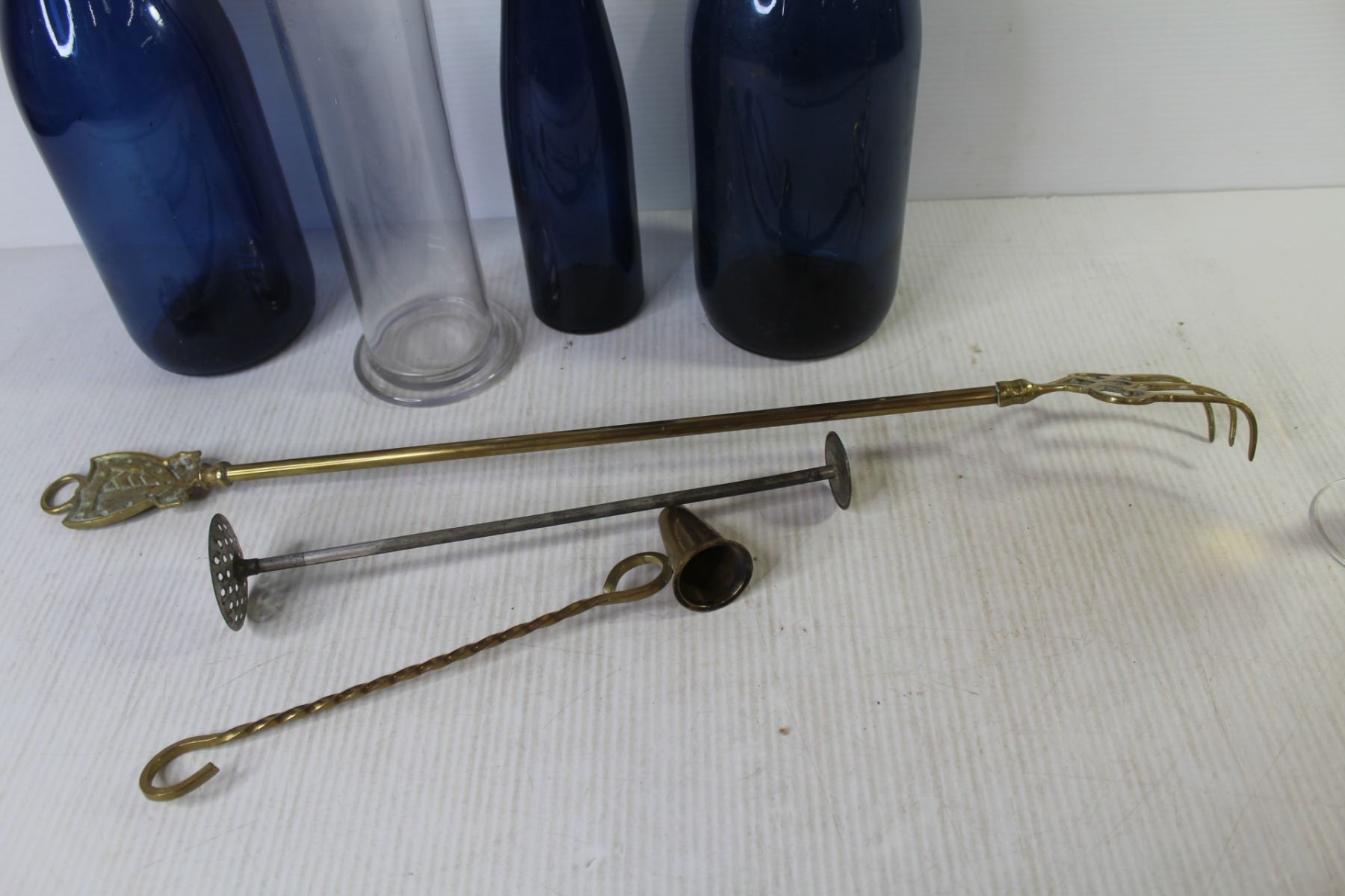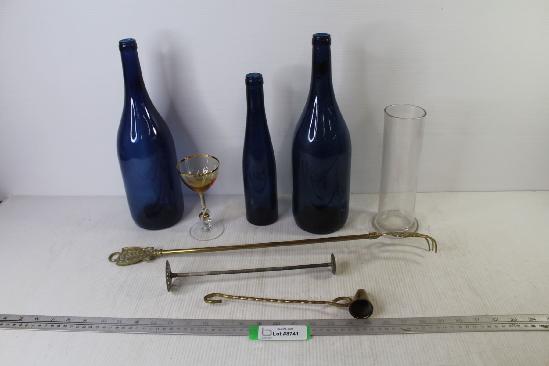 (3) Blue Glass Bottles - Brass Candle Snuffer & Rake - Wine Glass - Glass Vase - Vintage Egg Beater
