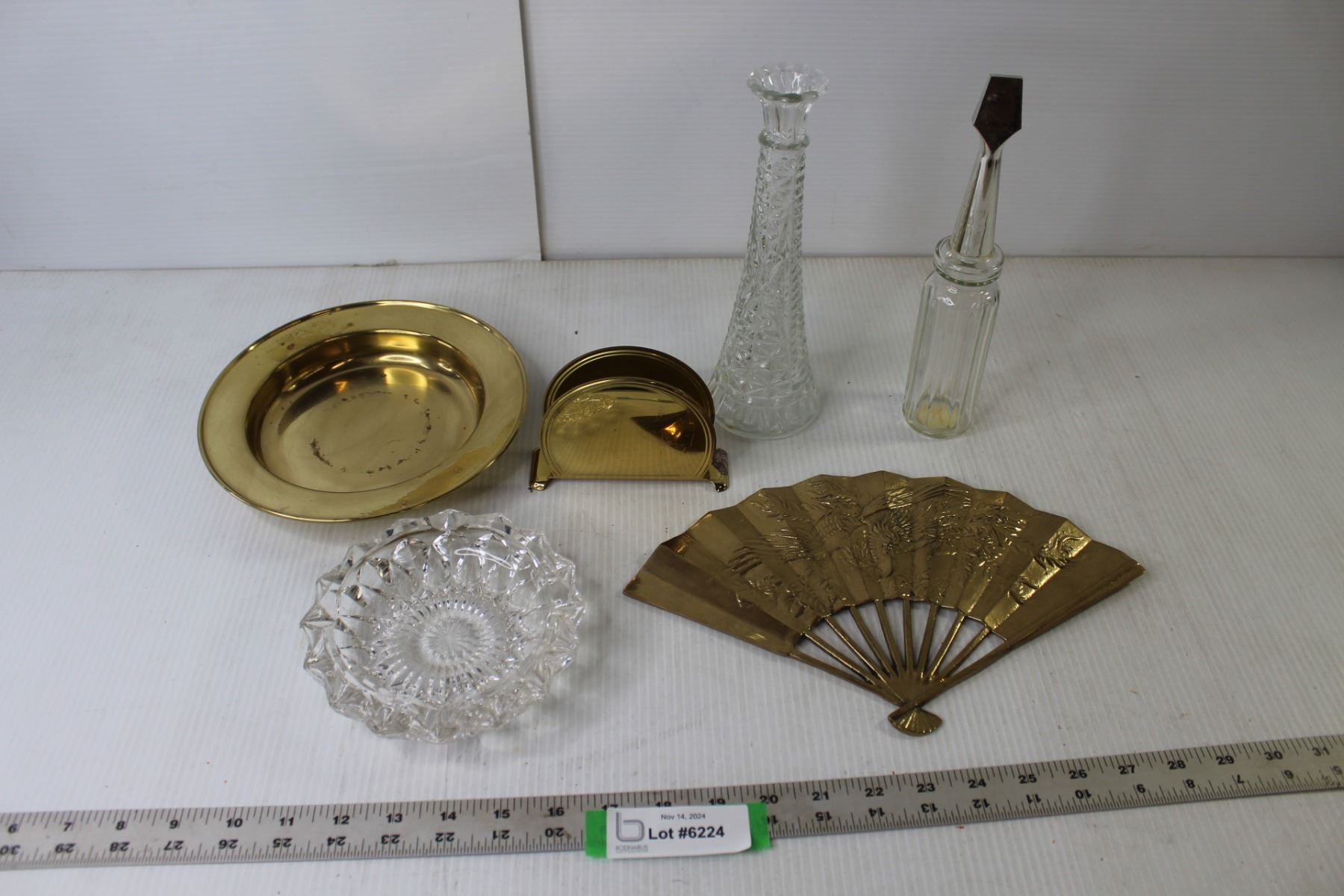 (3) Brass Ornaments (Napkin Holder, Candy Dish, Oriental Theme Fan), Glass Candle Holder, Glass Candy Dish, Avon After Shave "Screwdriver"