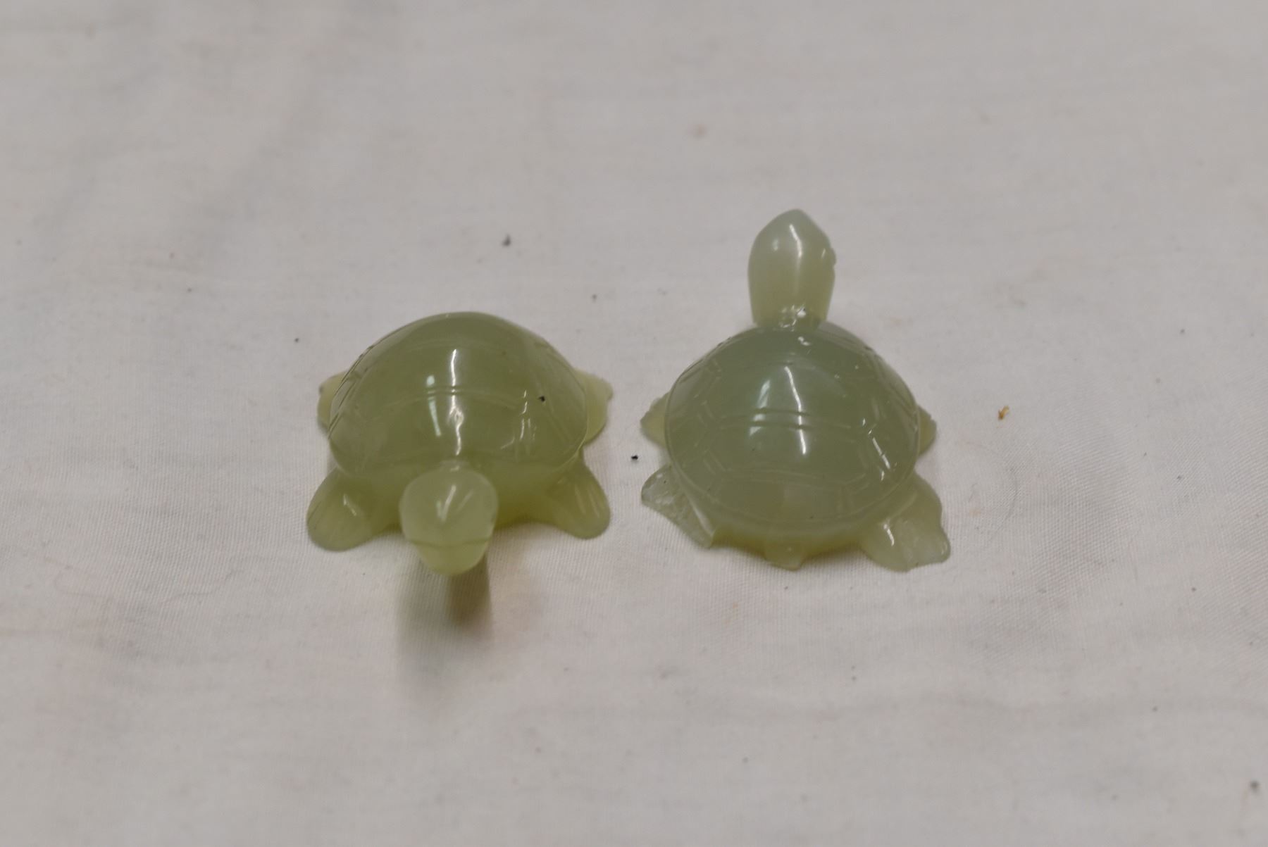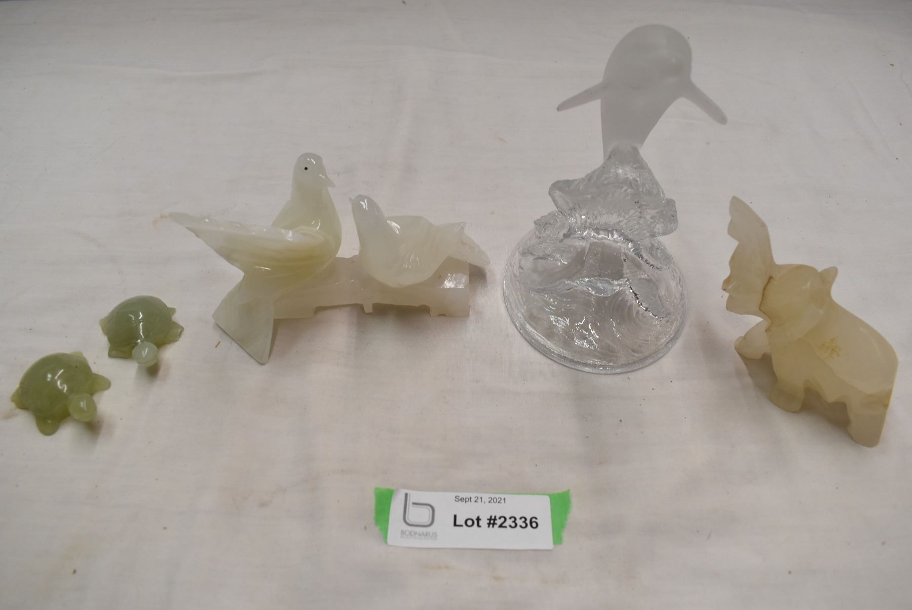 3 Carved marble ornaments, 1 glass dolphin ornament