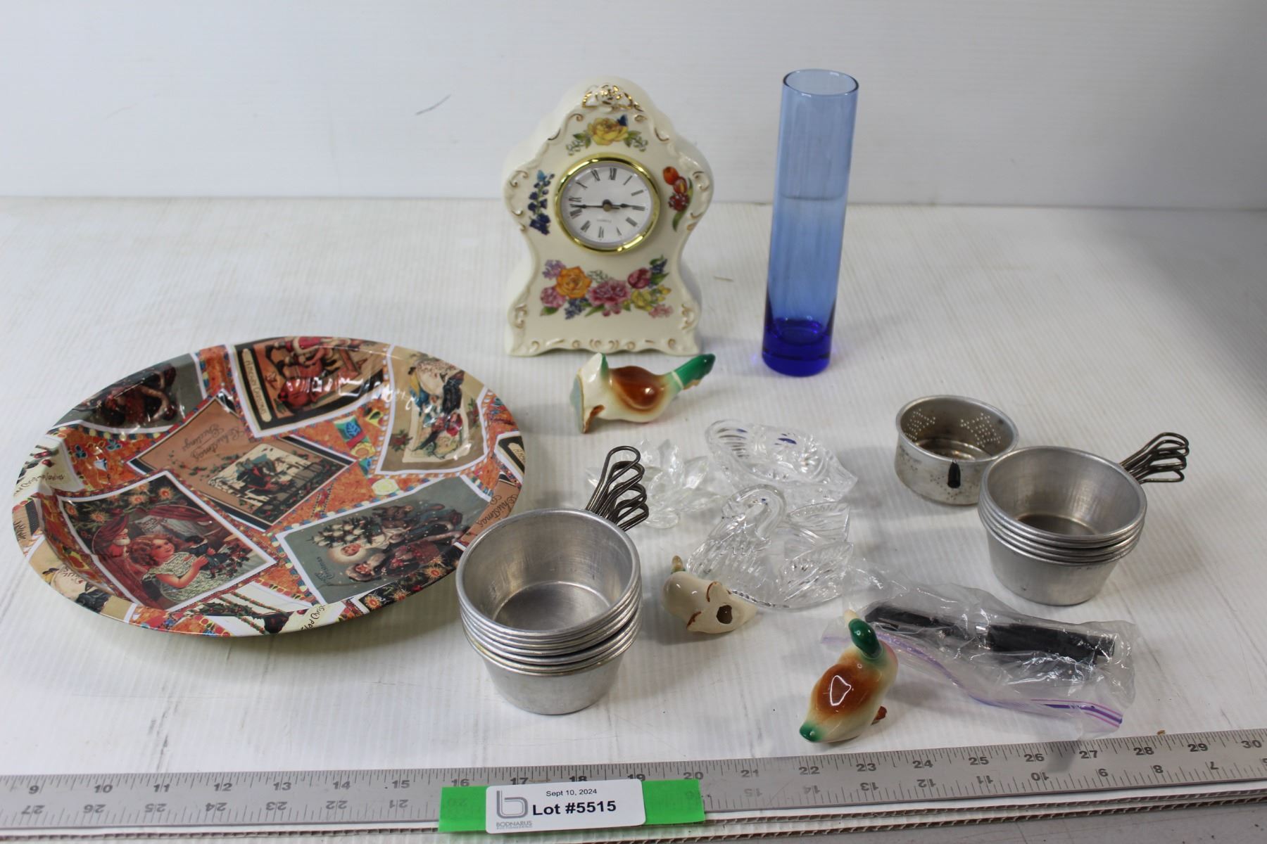 (3) Ceramic Duck Decor, Vase, Bowl, (3) Glass Desk/Shelf Decor, Party Picks, (12) Measuring Cups, Clock