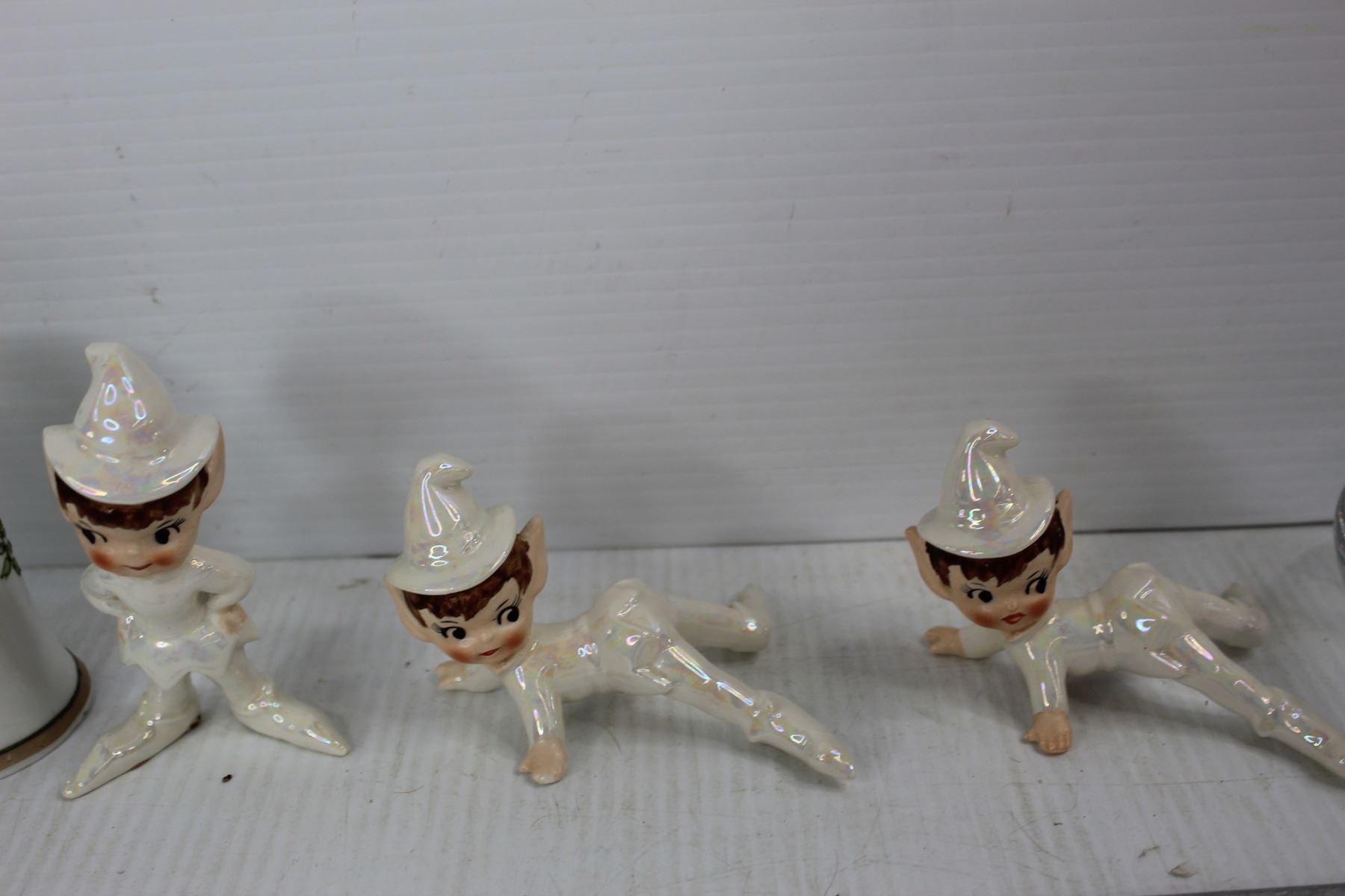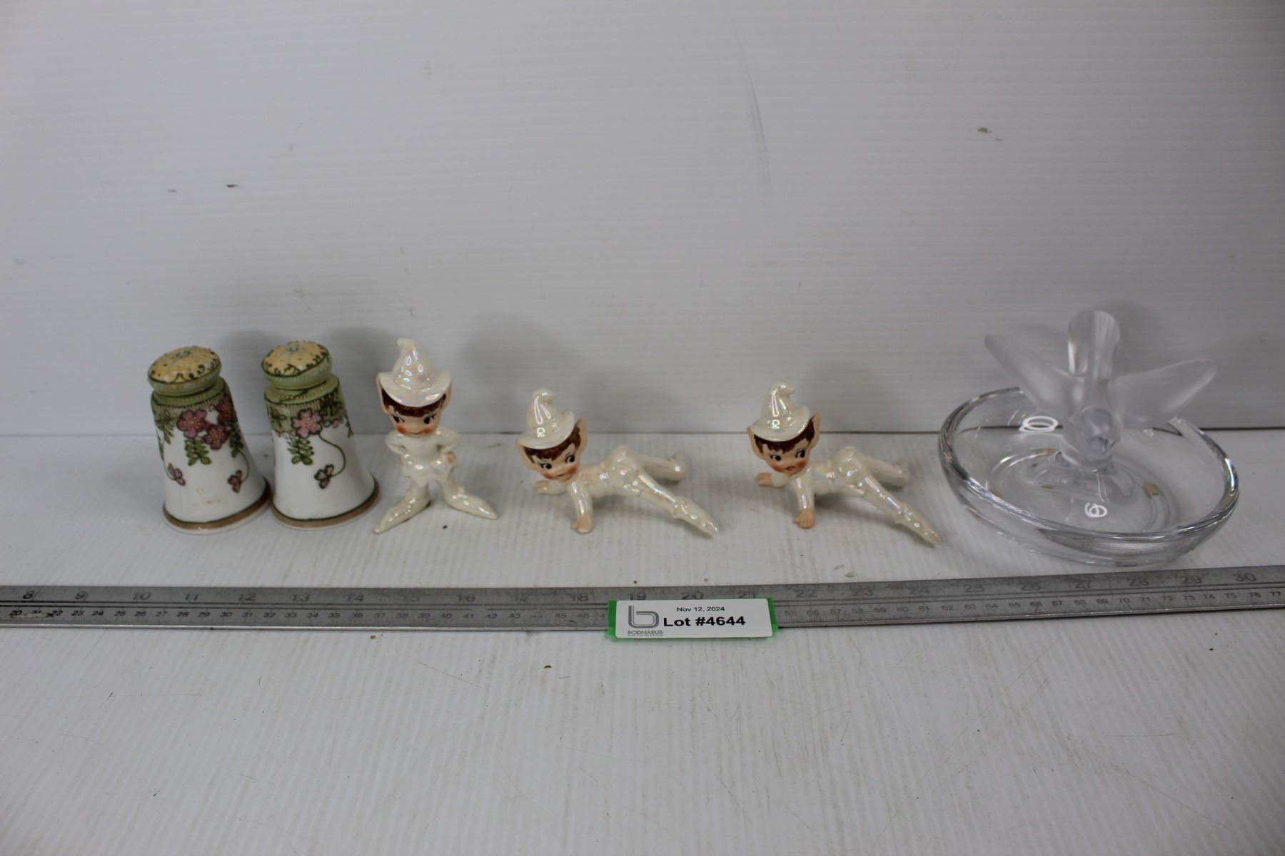 (3) Ceramic Elf Ornaments, Set Of Salt And Pepper Shakers, Misc.