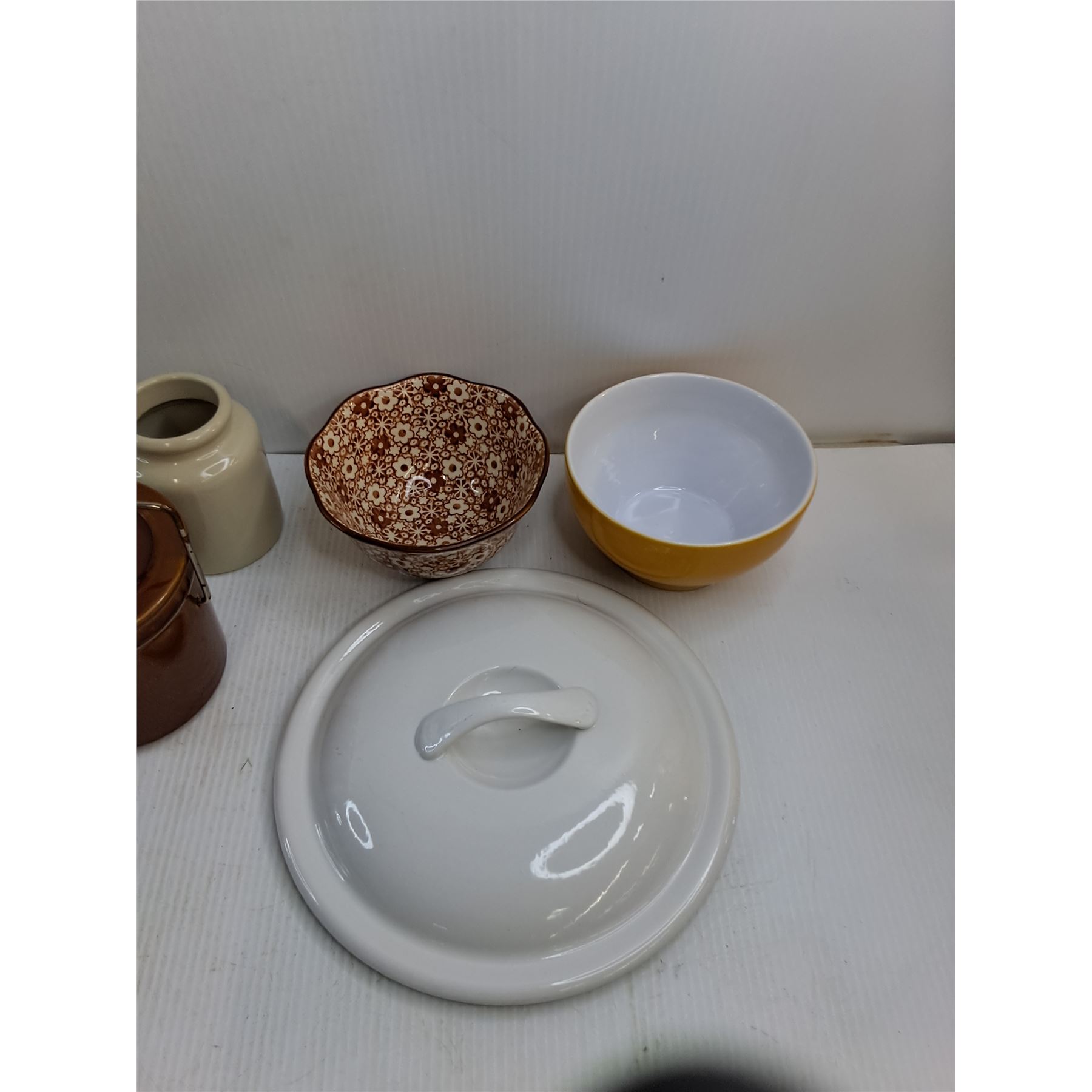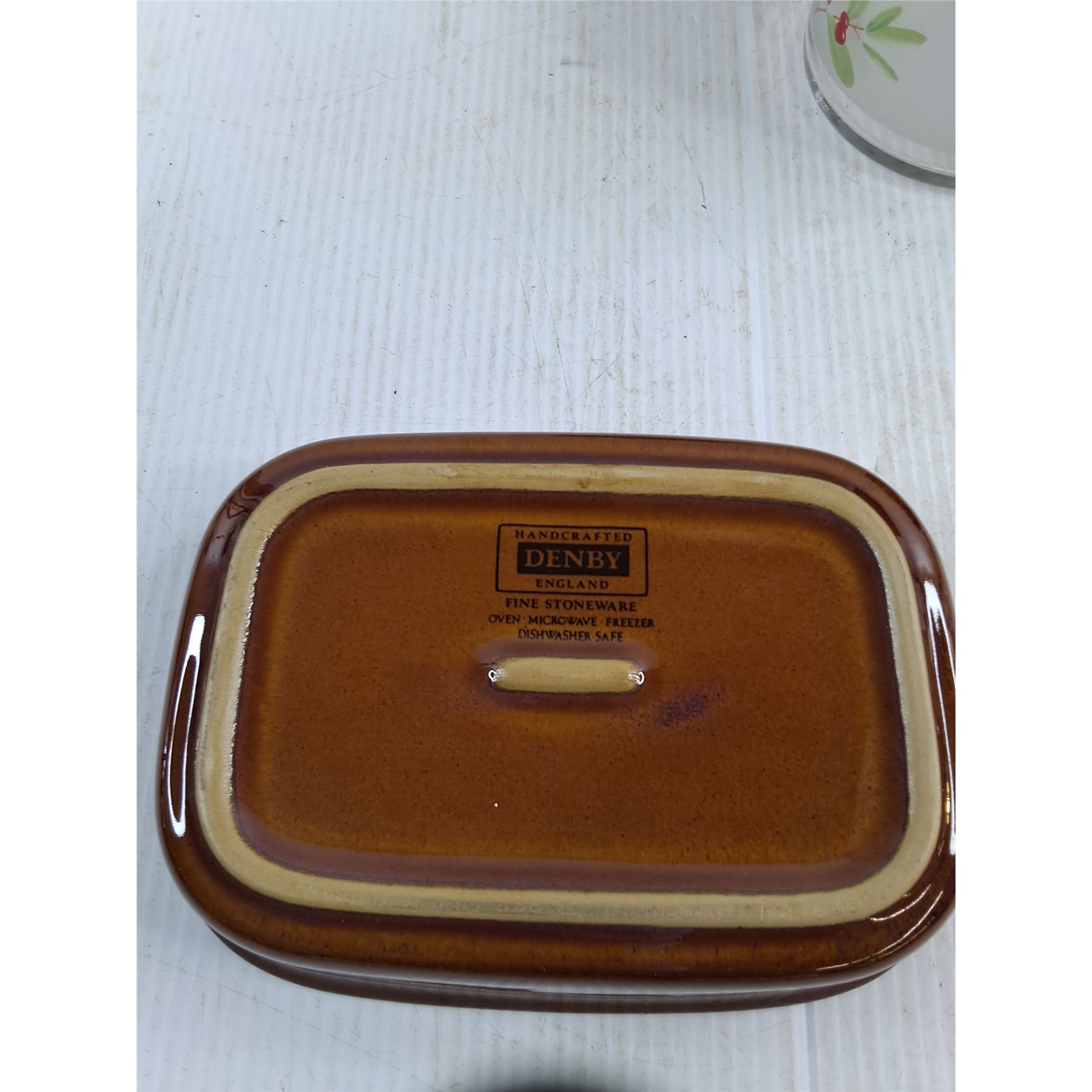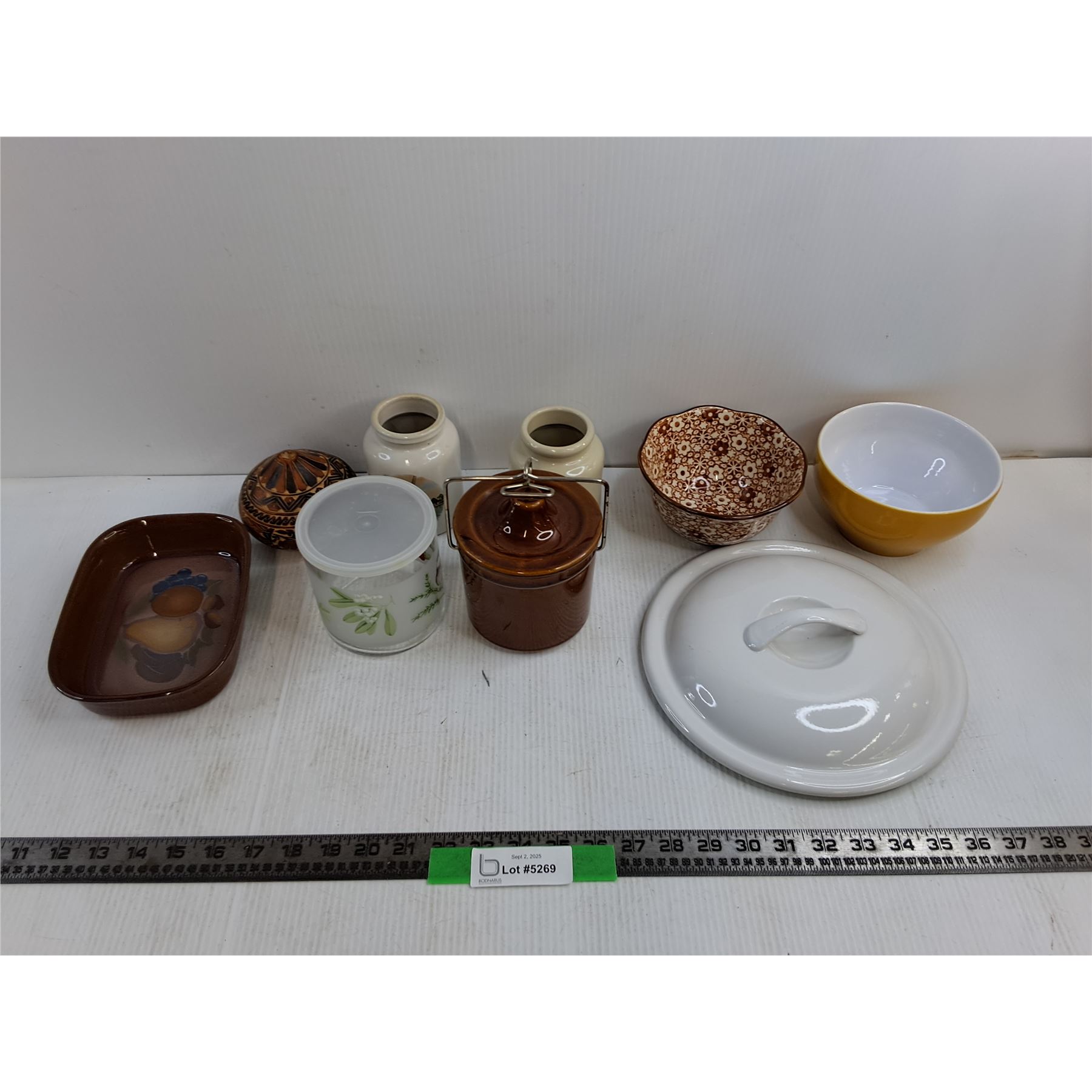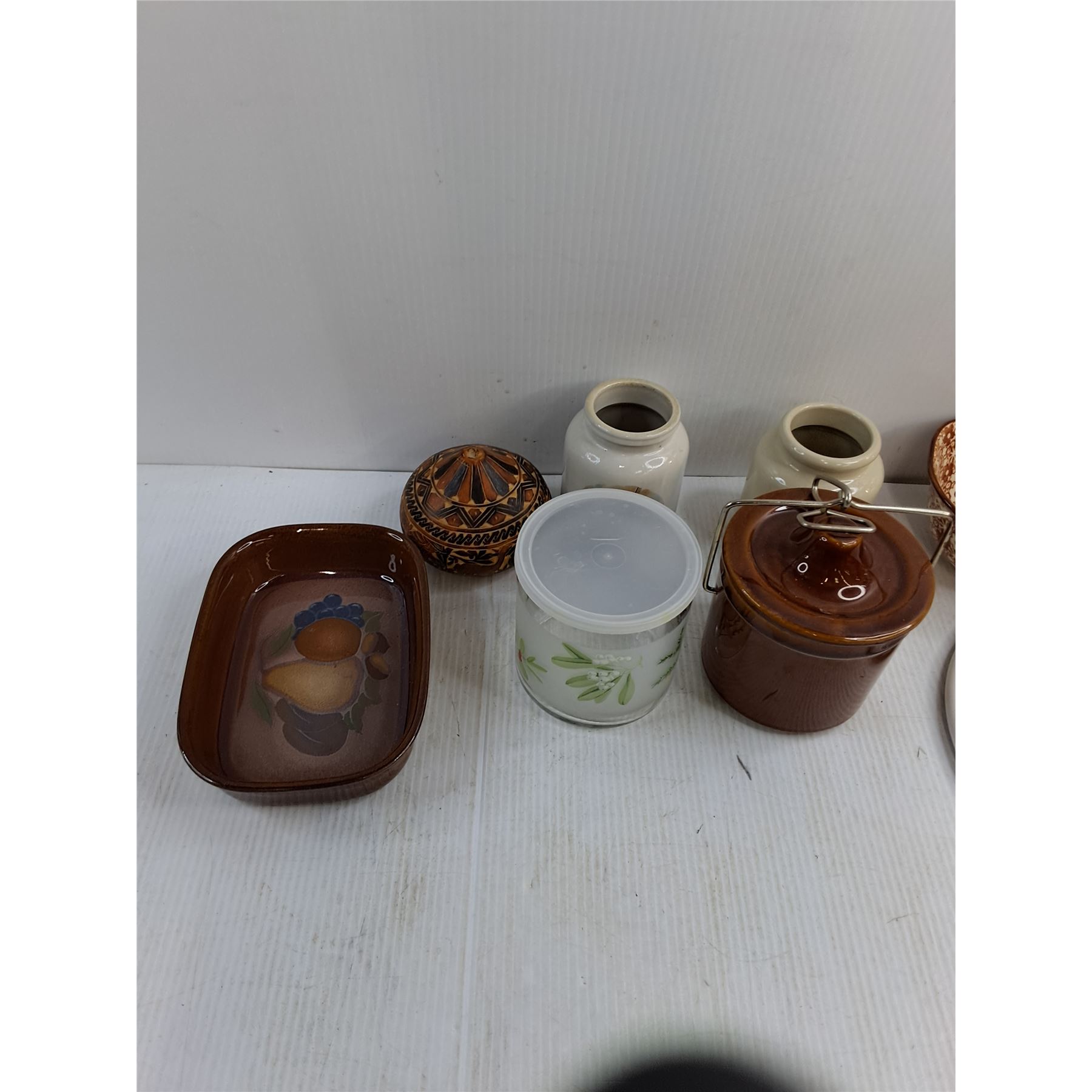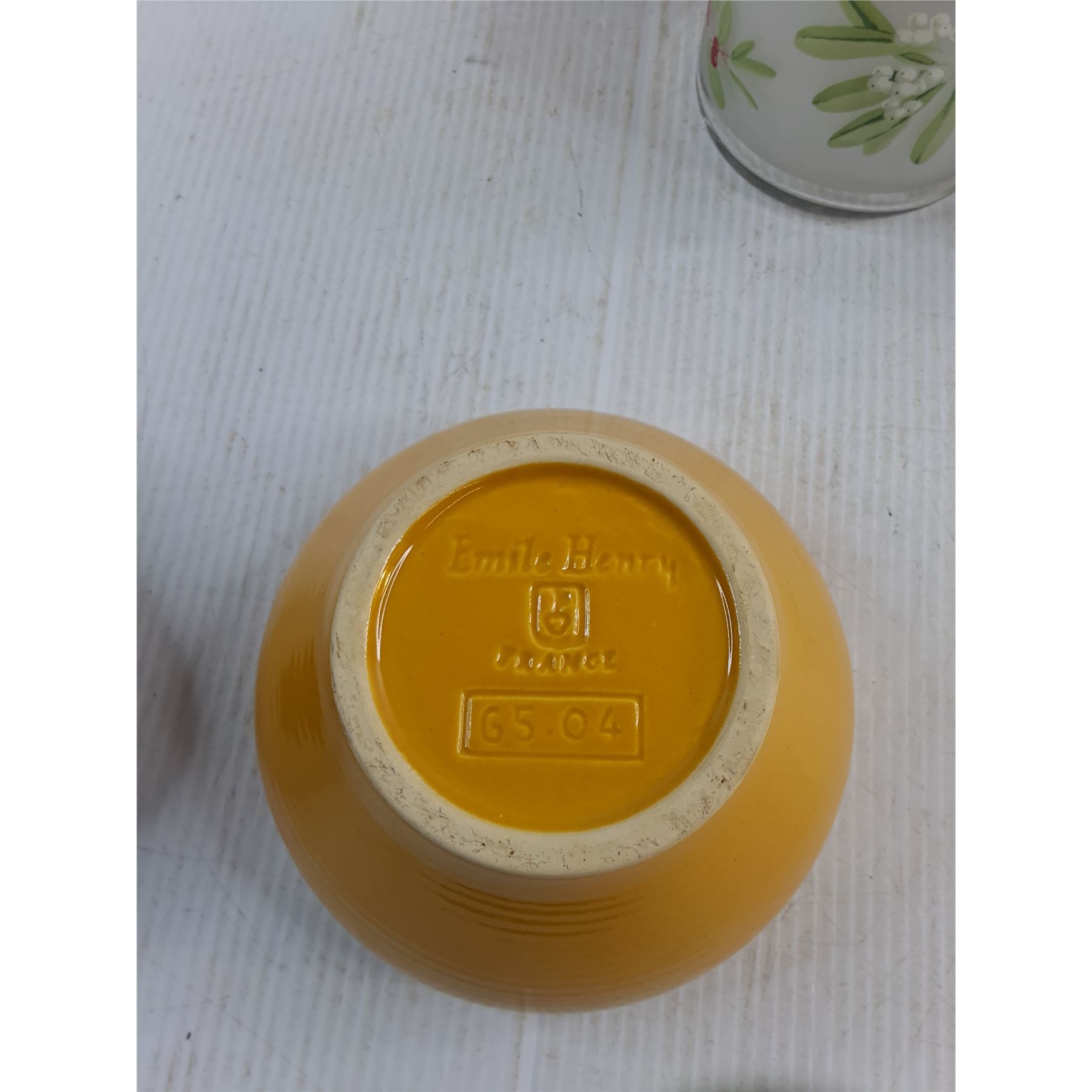 (3) Ceramic Jars, 8″ Ceramic Denby Tray, Yellow 6″ Emile Henry