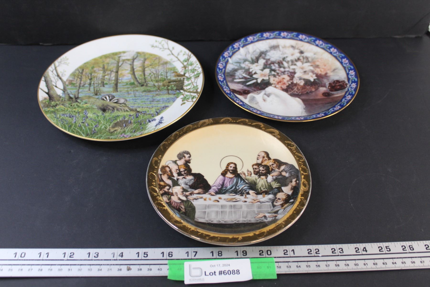 (3) Collector Plates: Jesus Last Supper, Badgers, Flowers