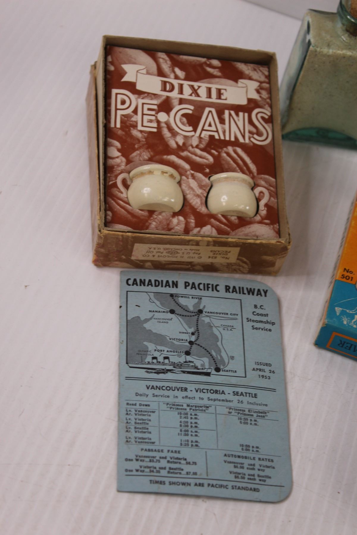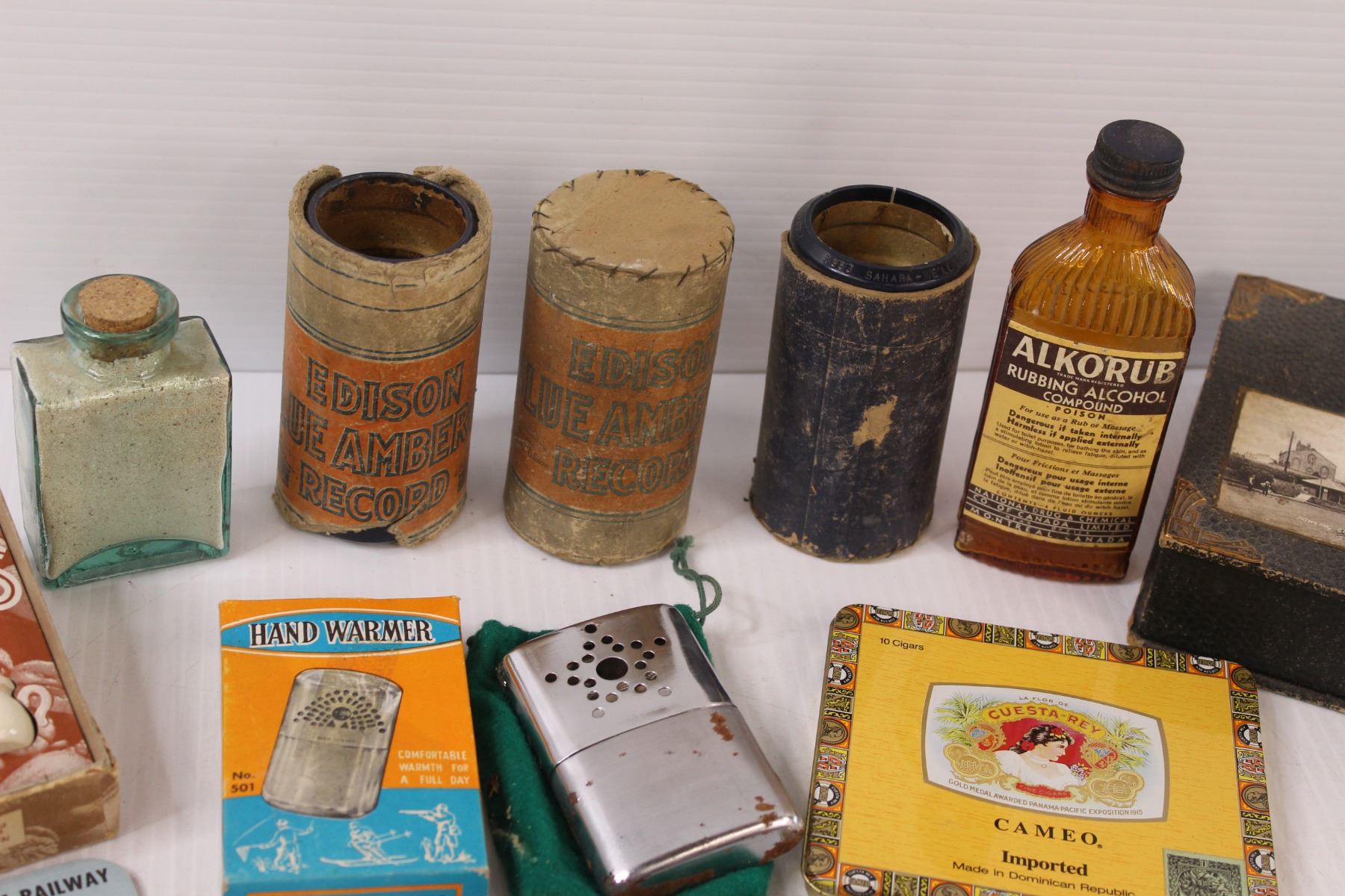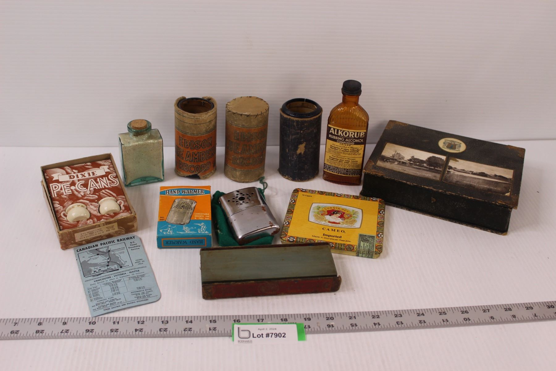 (3) Edison Blue Amber Record Tube, Vintage Hand Warmer, Sharpening Stone, Alkorub Glass Jar, Dixie Pe-Cans, Misc.