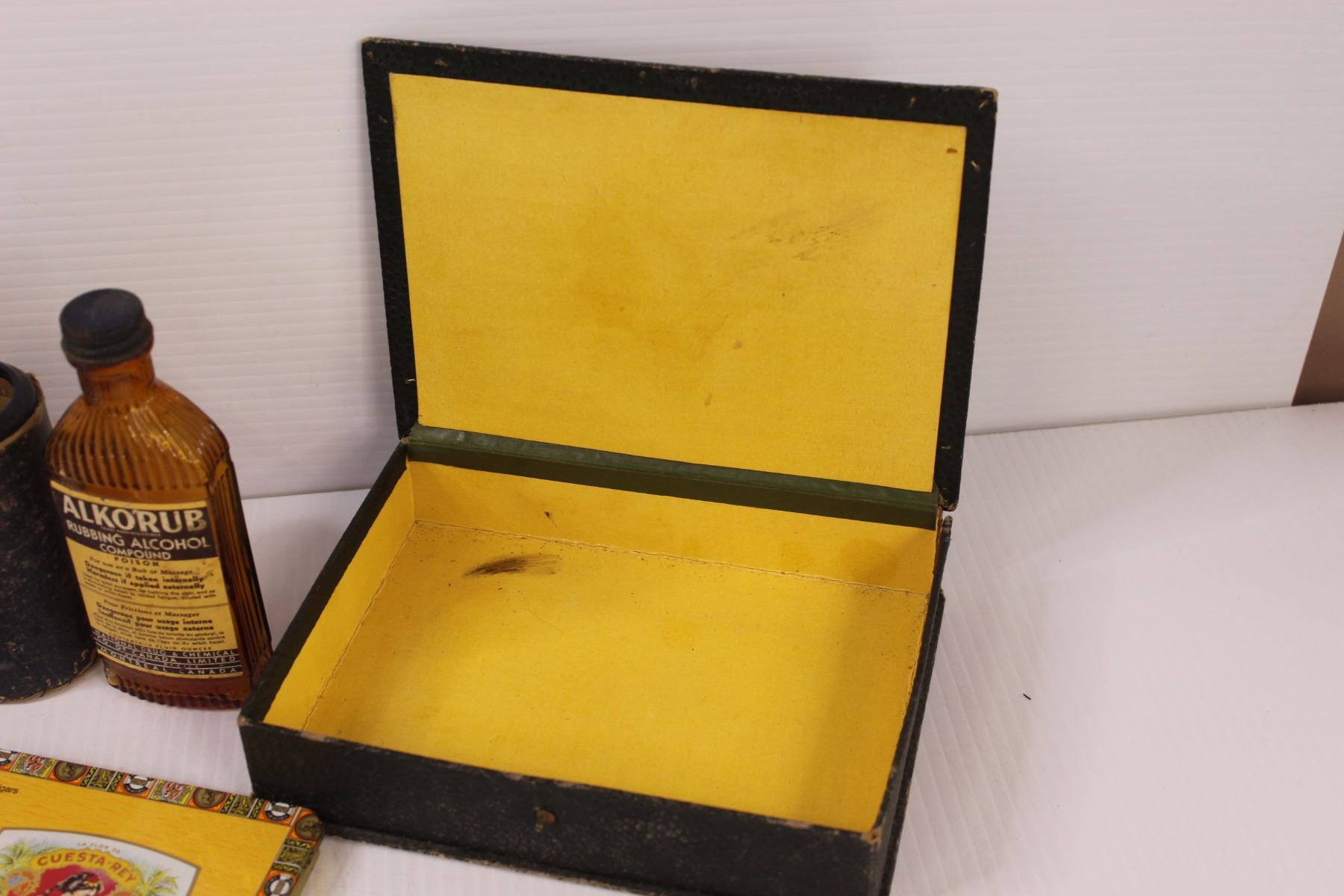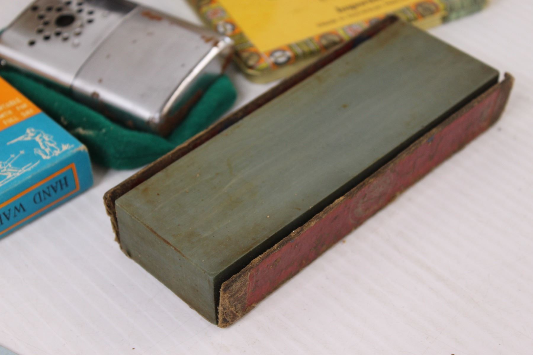 (3) Edison Blue Amber Record Tube, Vintage Hand Warmer, Sharpening Stone, Alkorub Glass Jar, Dixie P