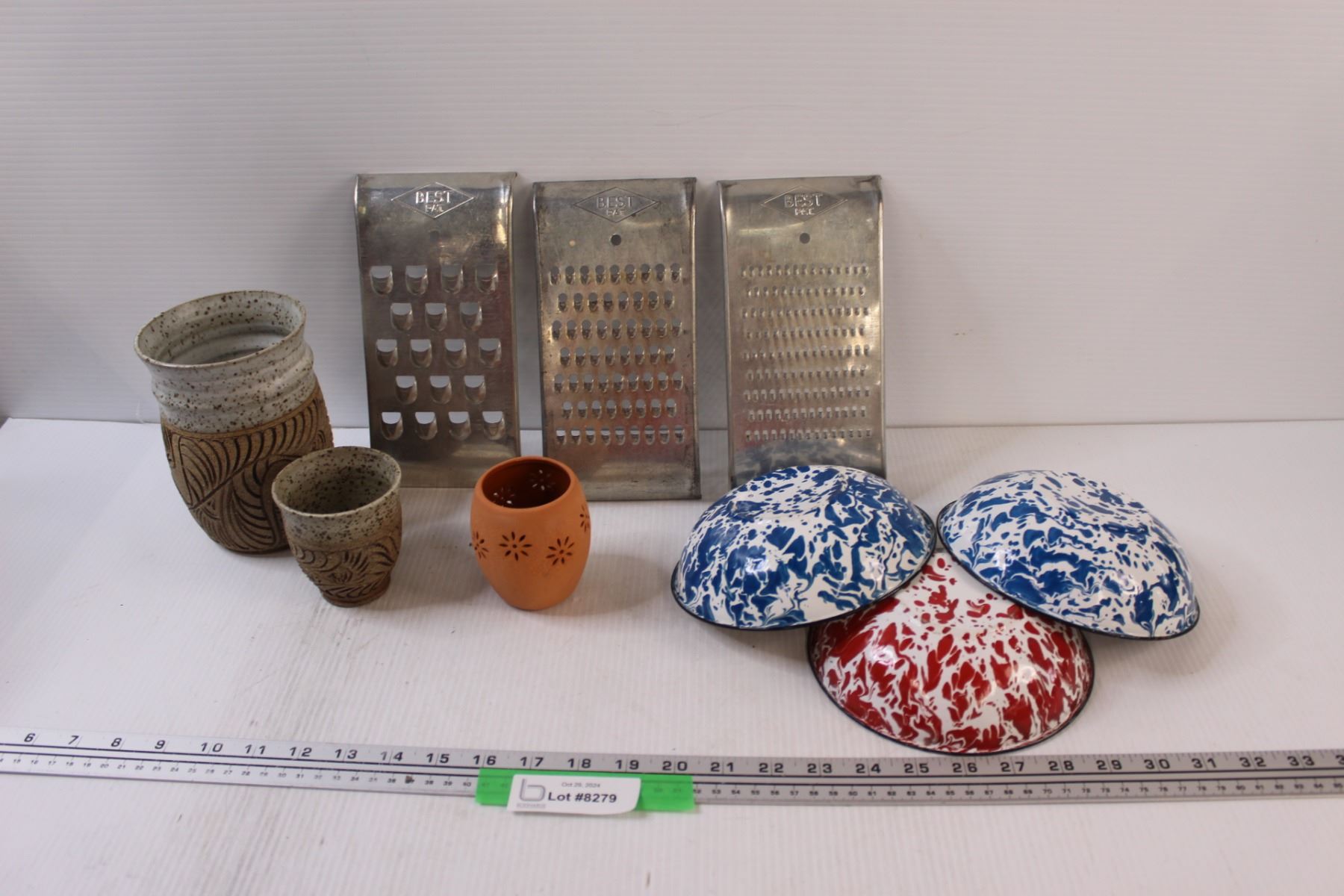 (3) Enamel Bowls, (3) Clay Pots, (3) Vintage Cheese Graders