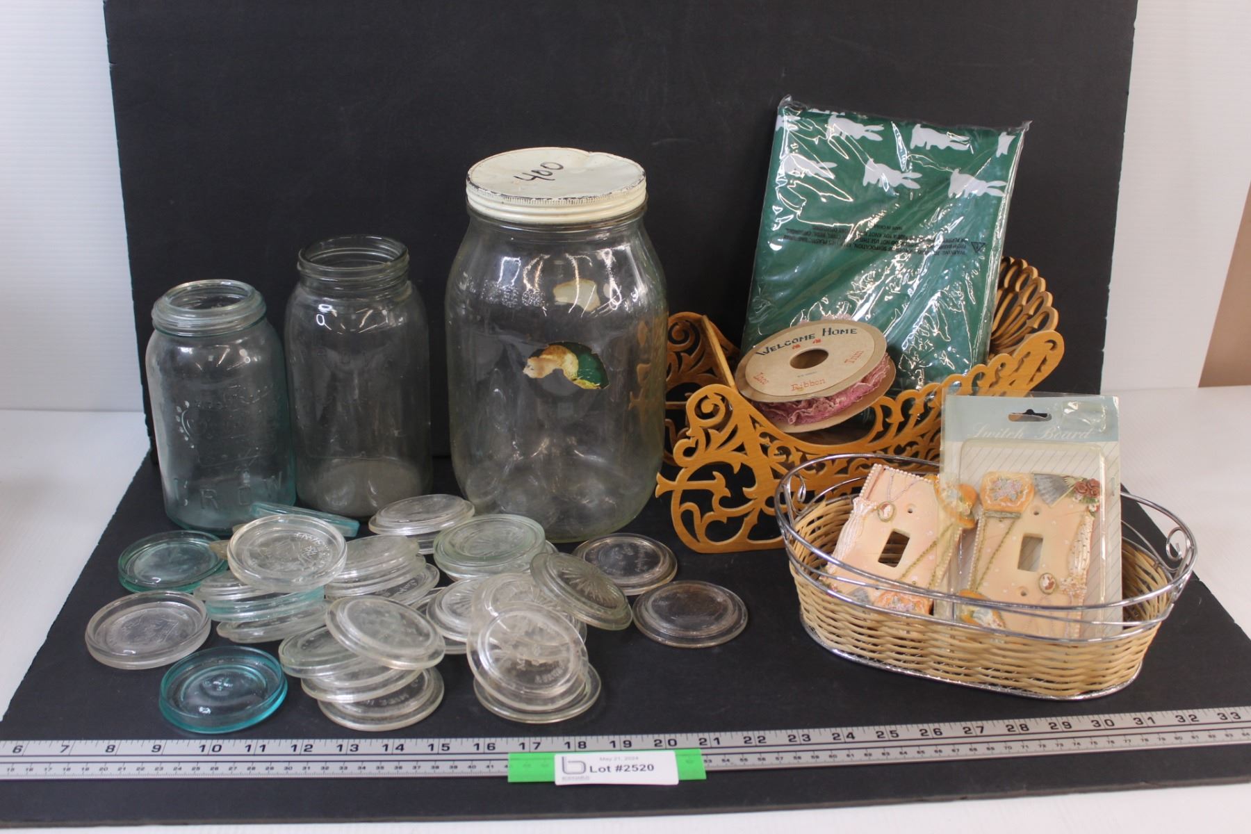 (3) Glass Jars & Glass Canning Lids, Metal Basket w/Themed Light Switches, Wooden Display Sleigh w/ Pilsner Flag & Lace Ribbon