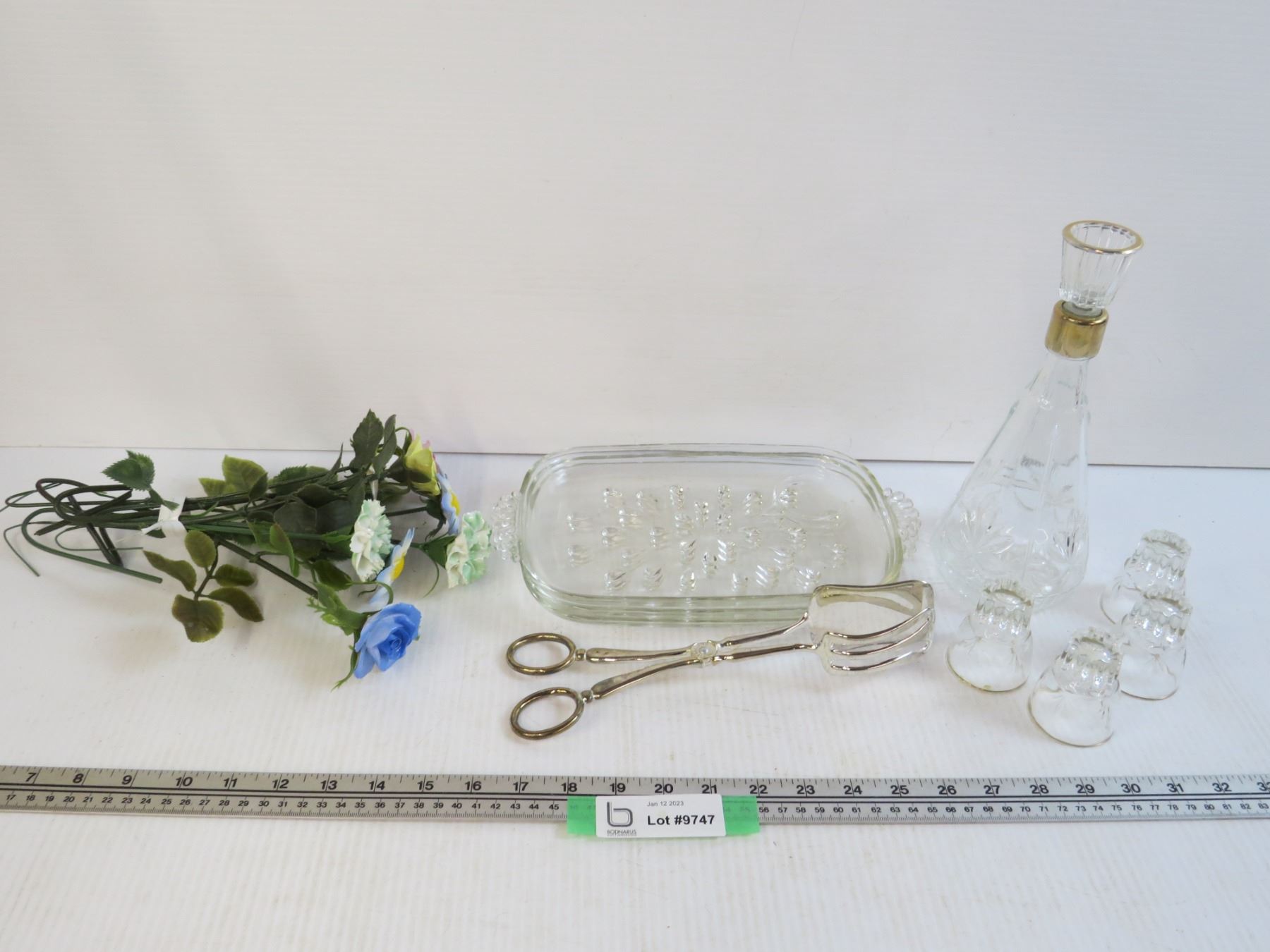(3) Glass Snack Plates - Ceramic Flowers (slight chipping) - Decanter - Tongs