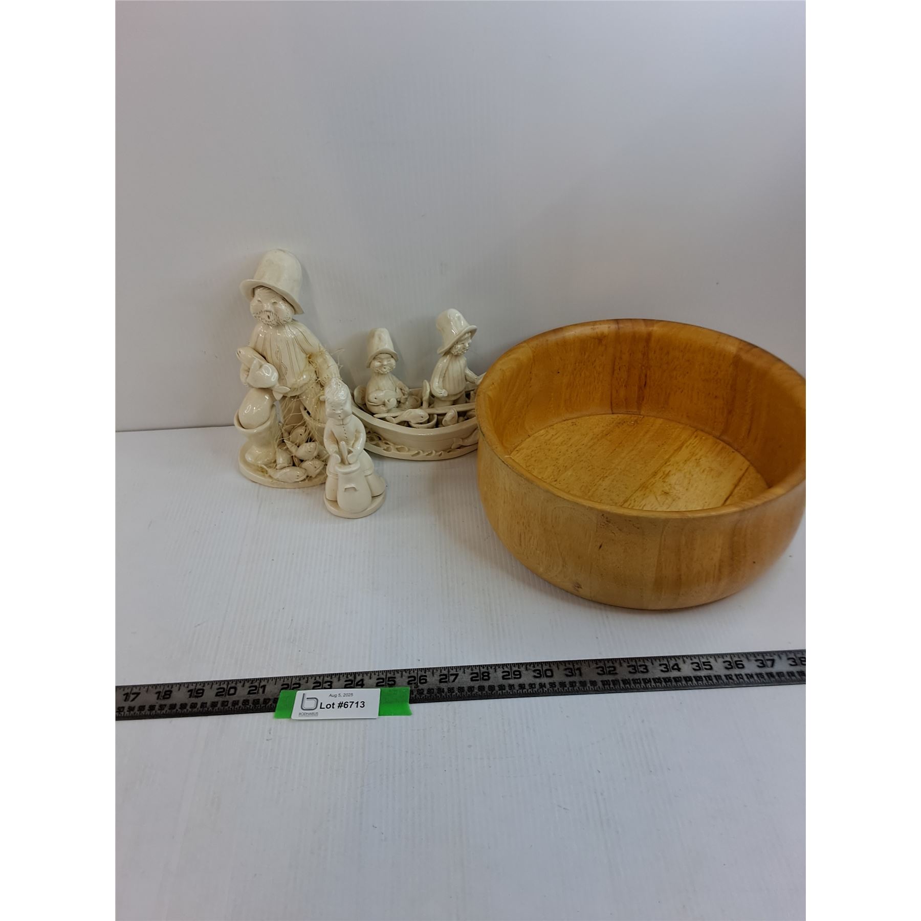 (3) Handmade Fishing Sculptures, 12" Wooden Bowl
