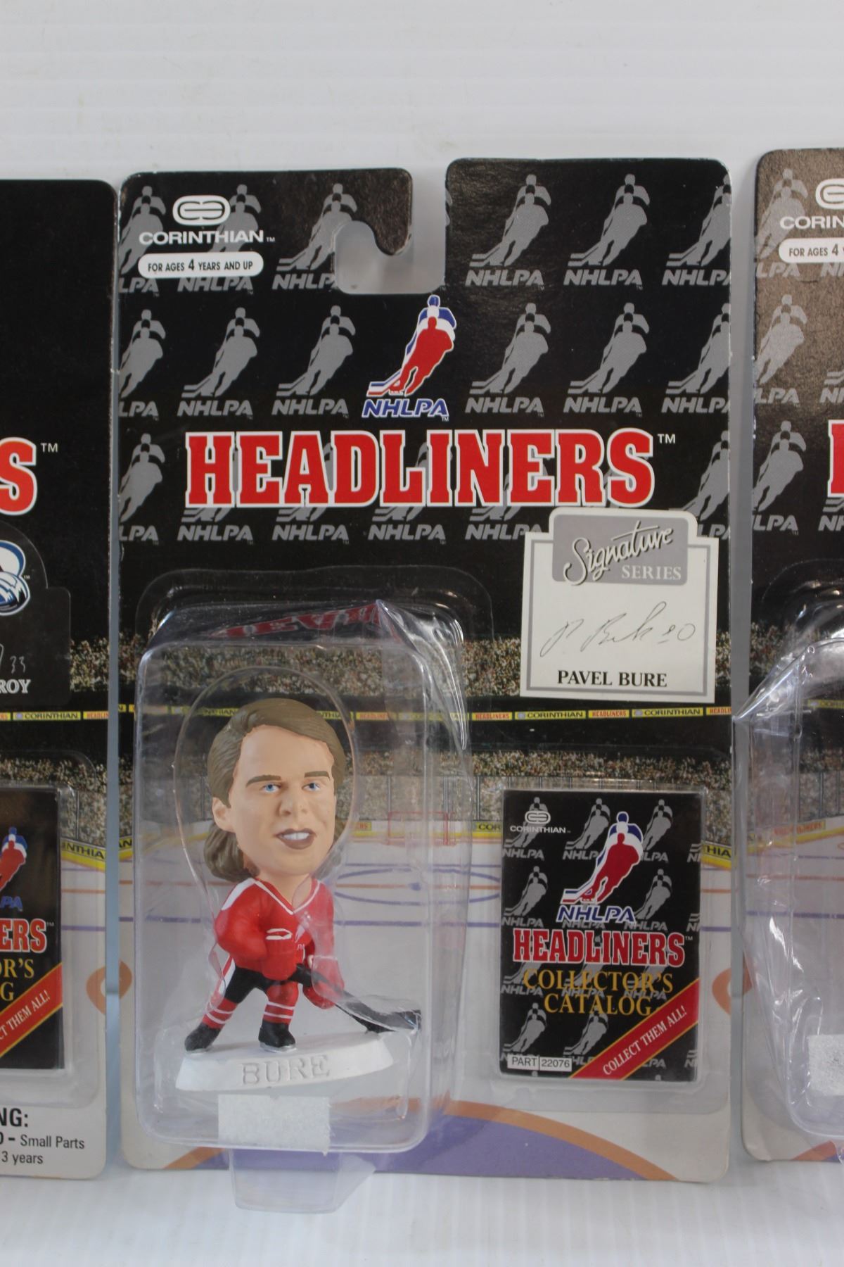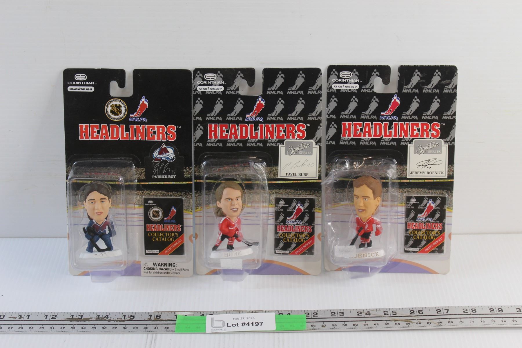 (3) Headliners NHL Collectible Figures and Catalogues - Patrick Roy, Pavel Bure and Jeremy Roenick
