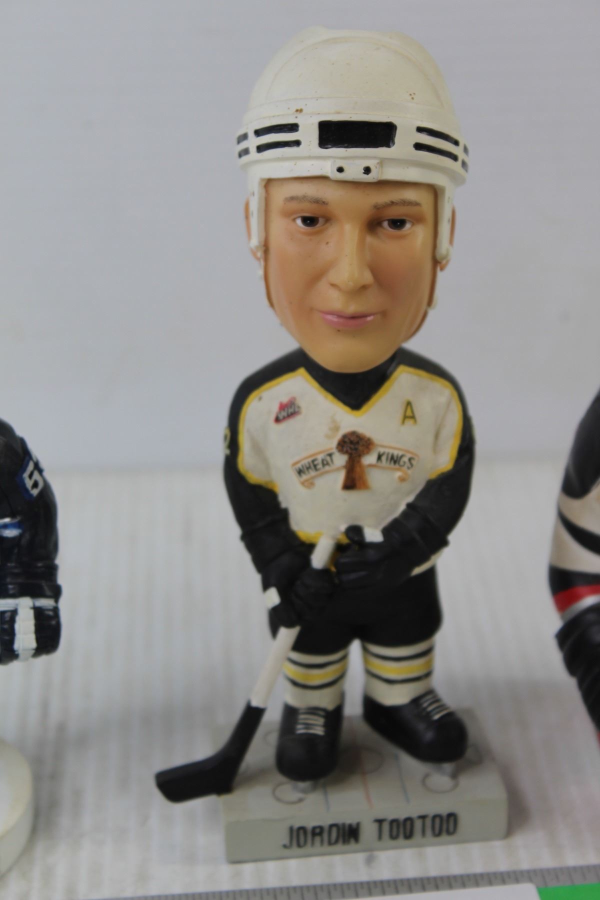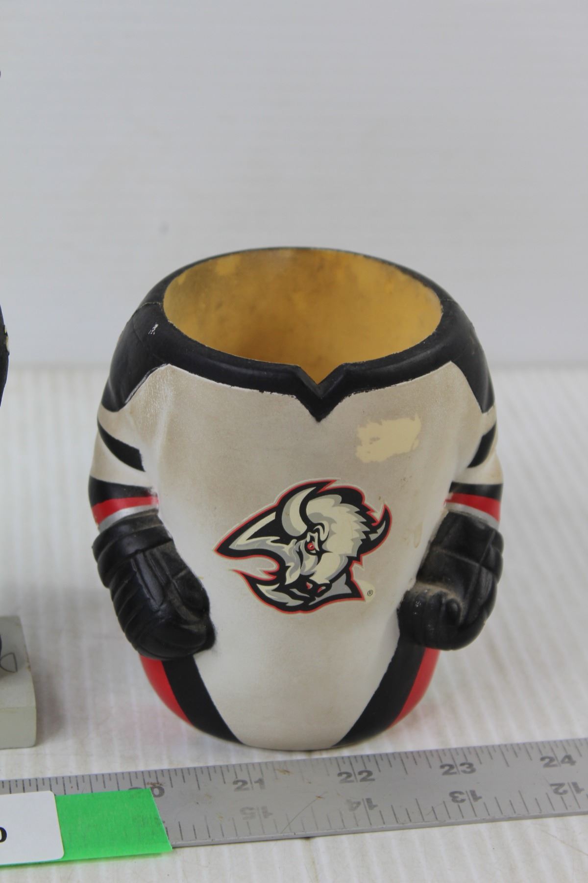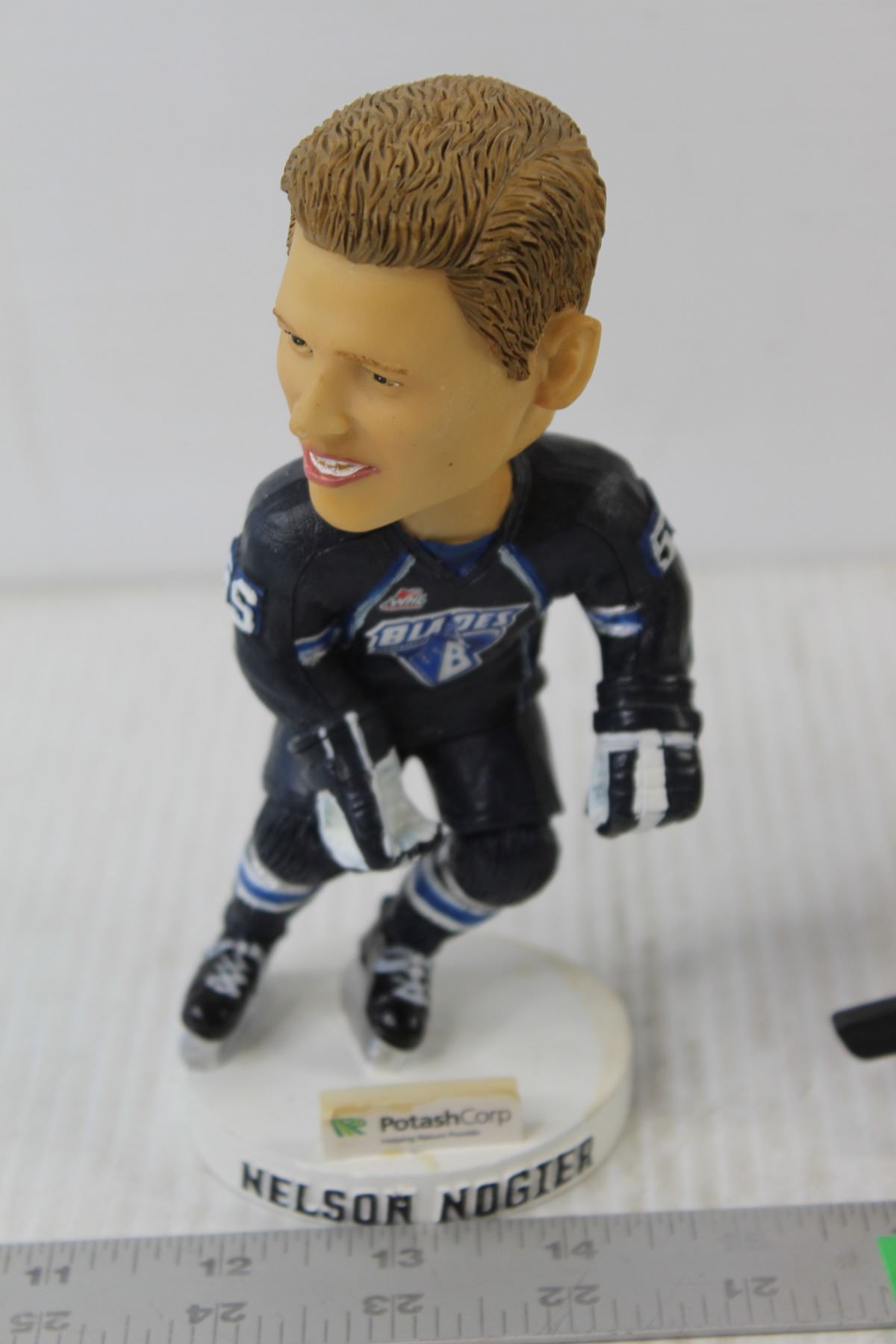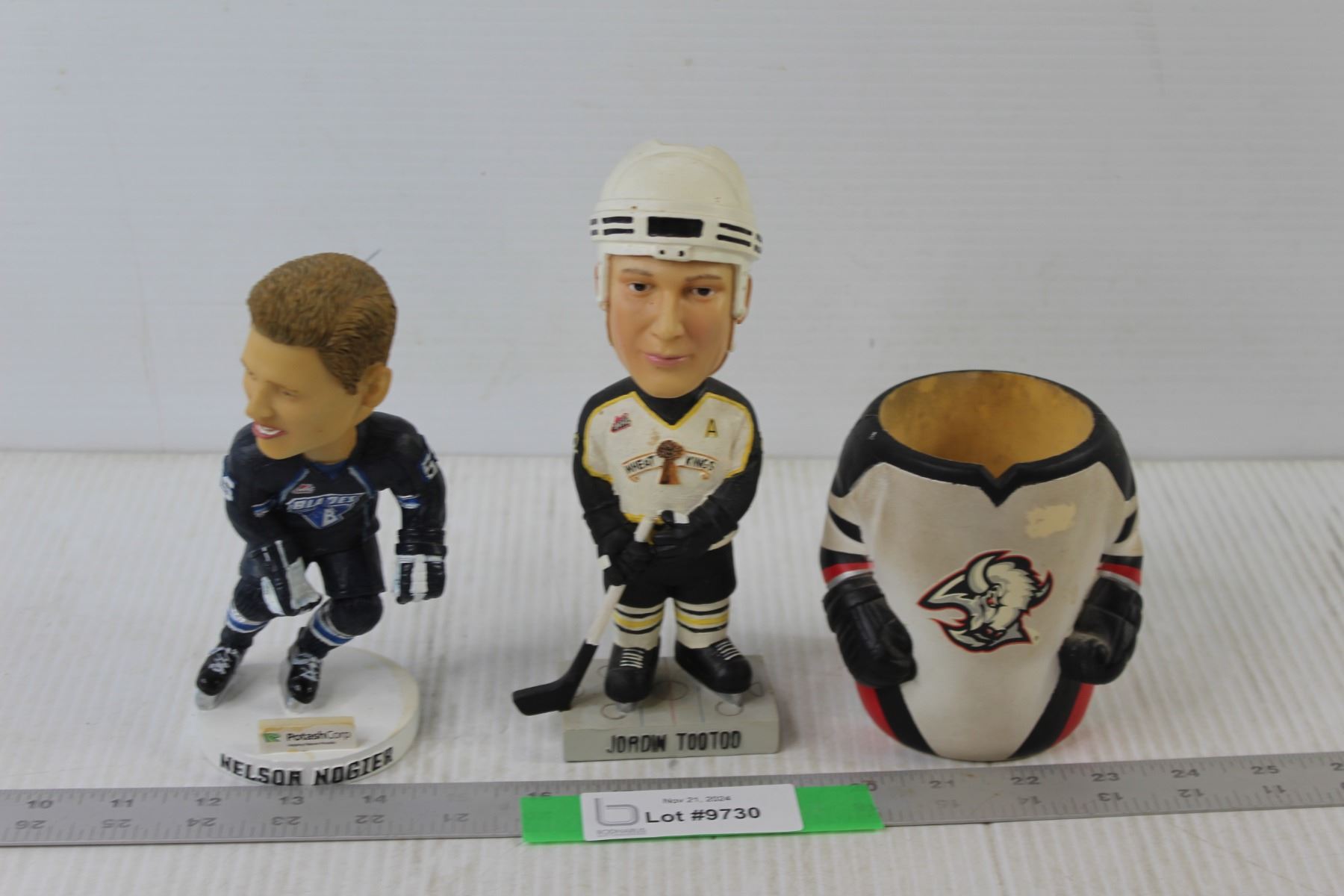 (3) Hockey Items - Jordin Tootoo Brandon Wheat Kings Bobble Head, Nelson Nogier Saskatoon Blades Bobble Head Missing Stick, Buffalo Sabres Beer Can Drink Holder