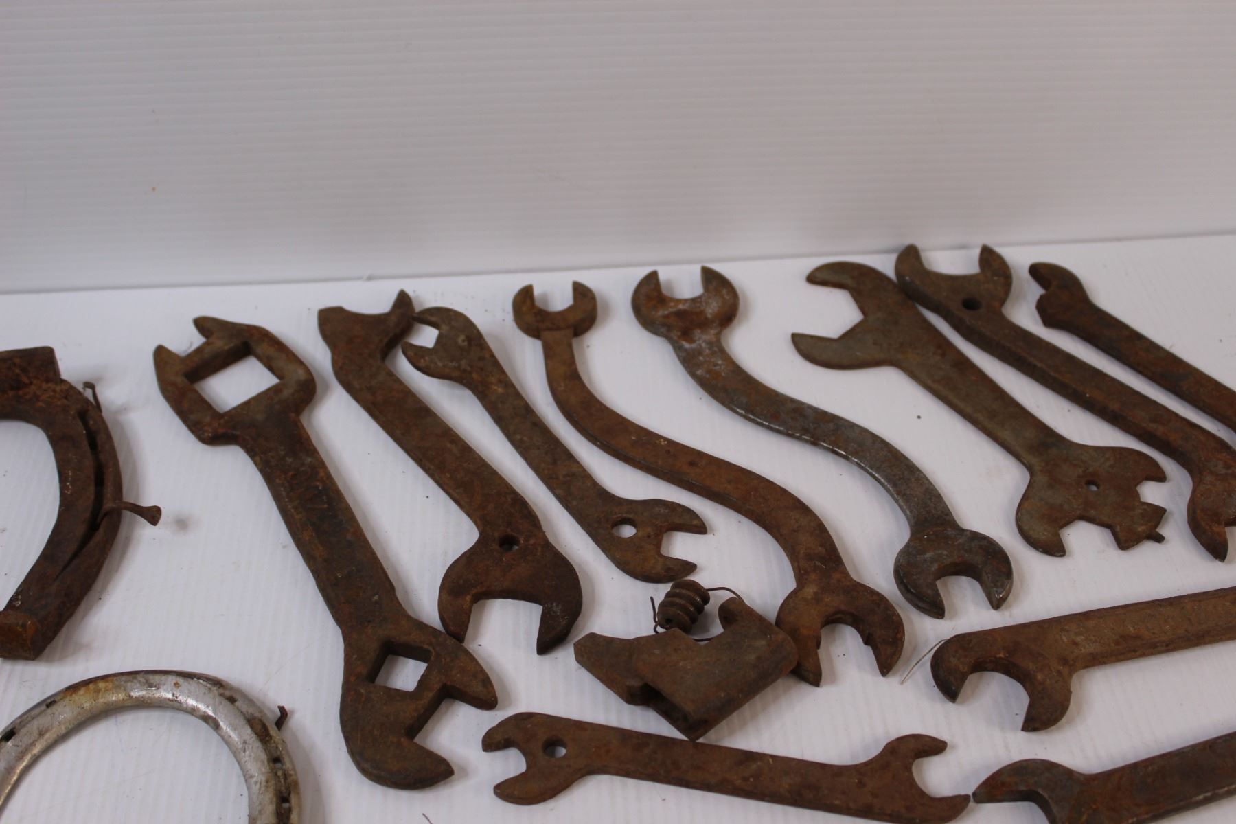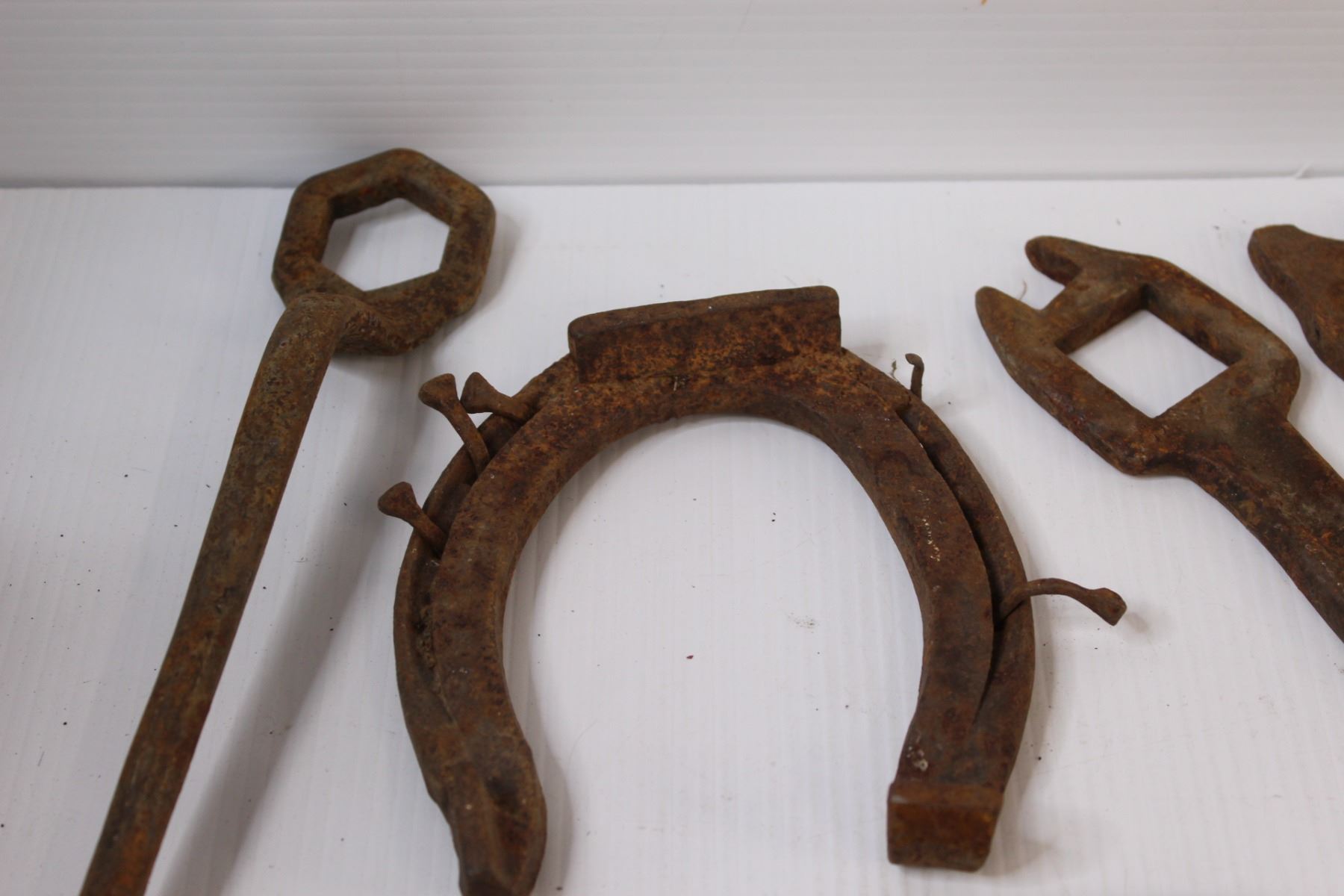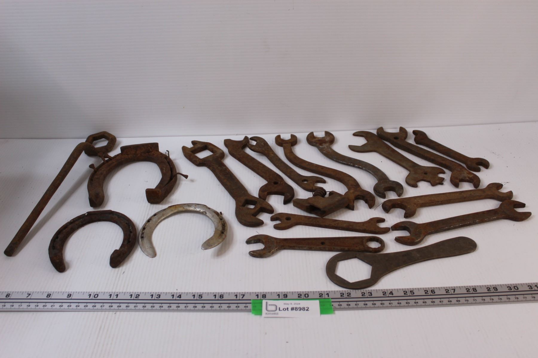 (3) Horse Shoes, (14) Antique Wrenches (Assorted)