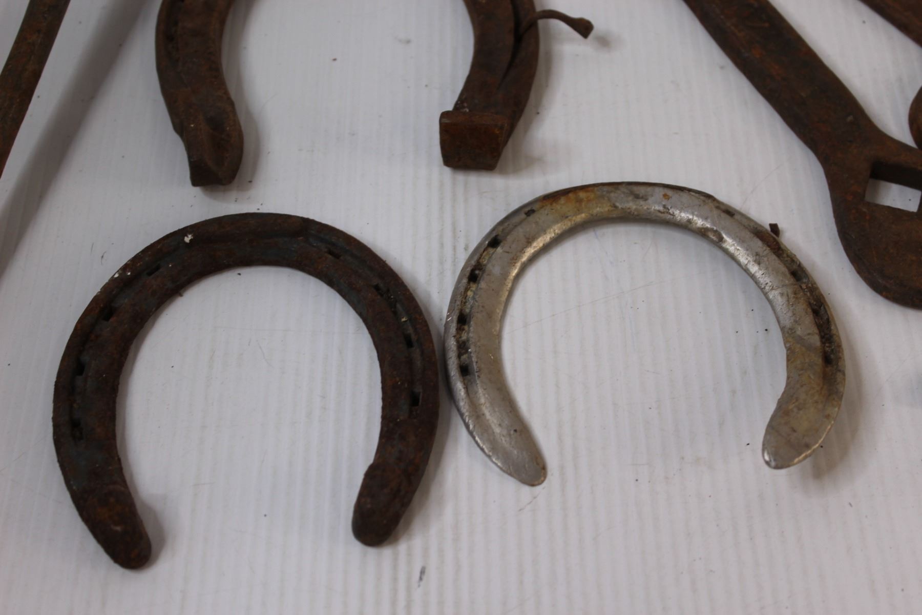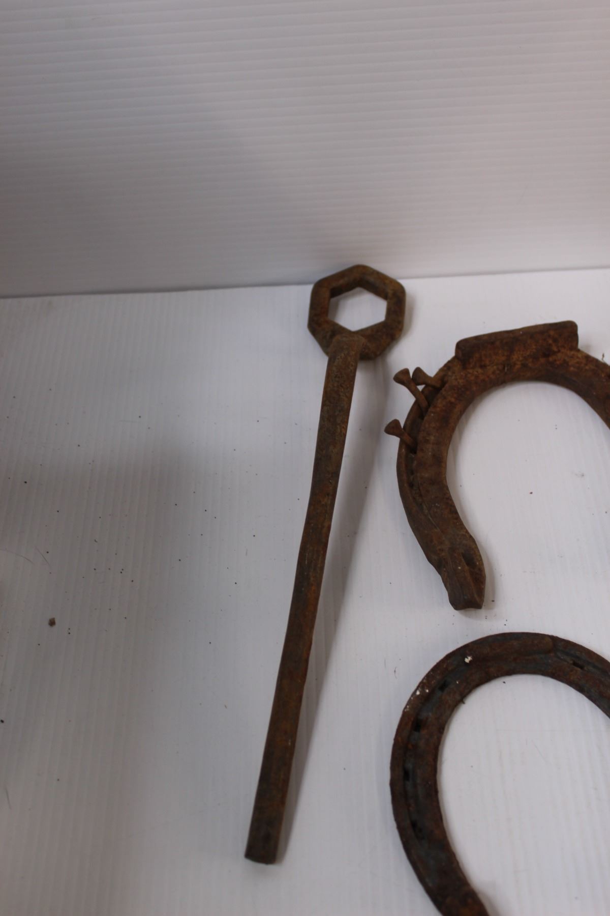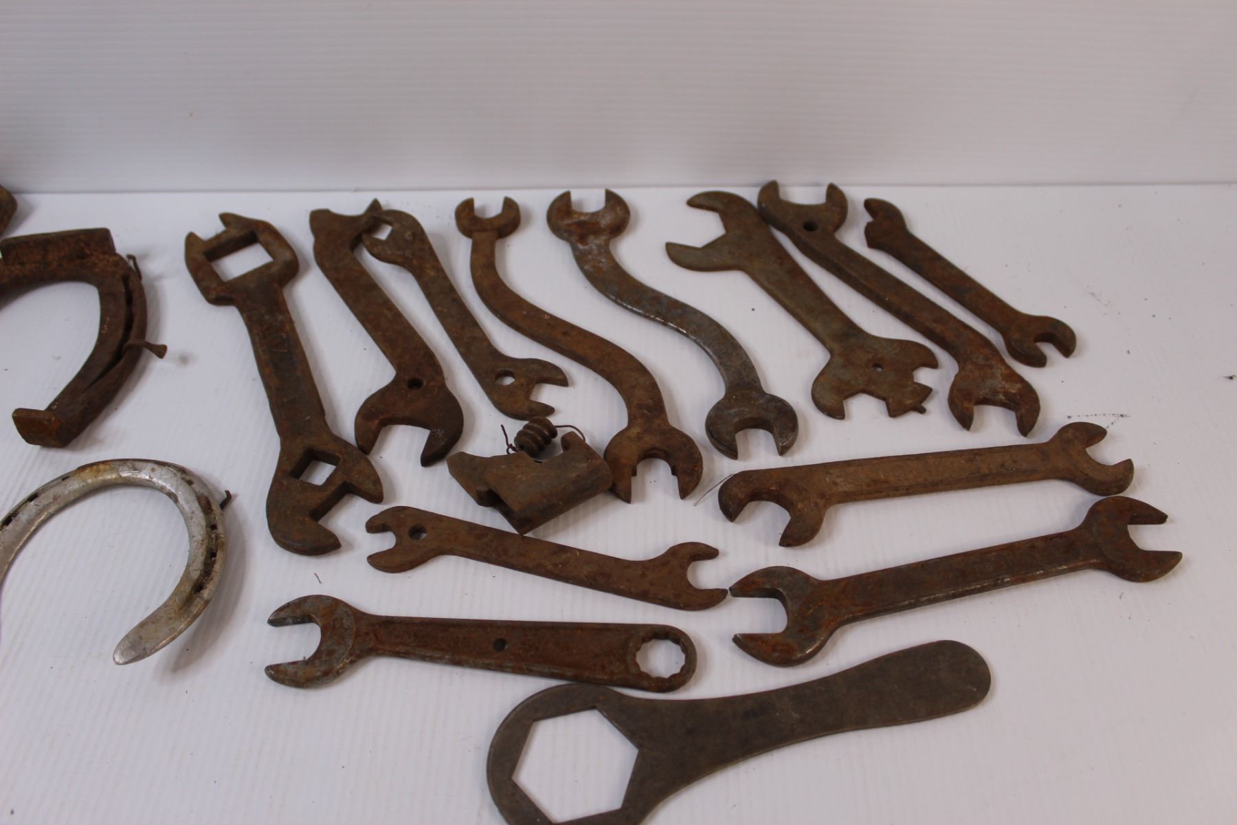 (3) Horse Shoes, (14) Antique Wrenches (Assorted)