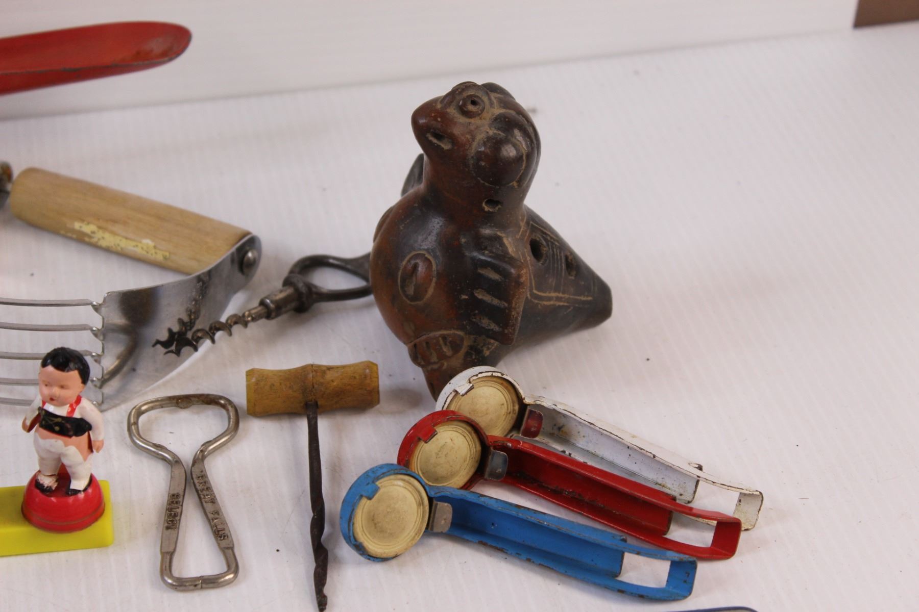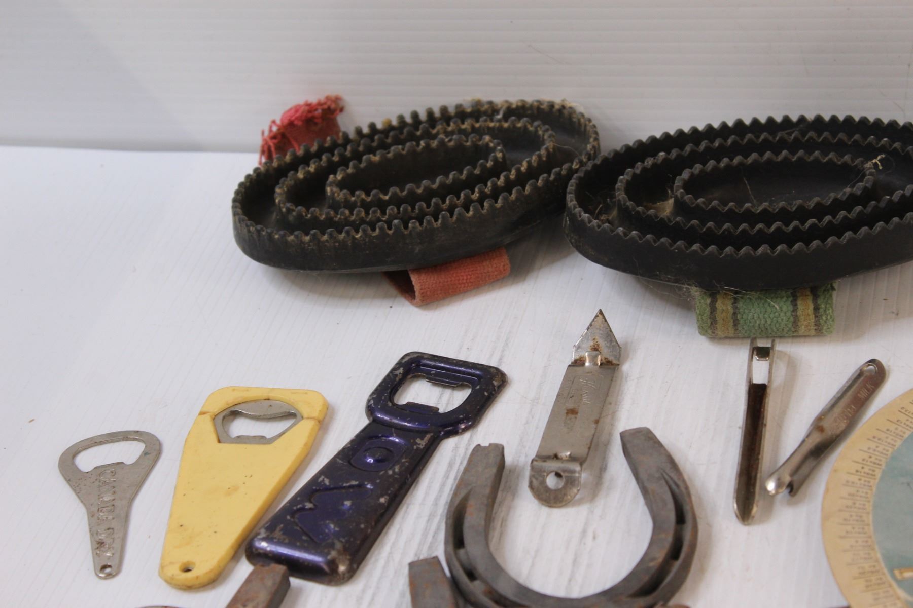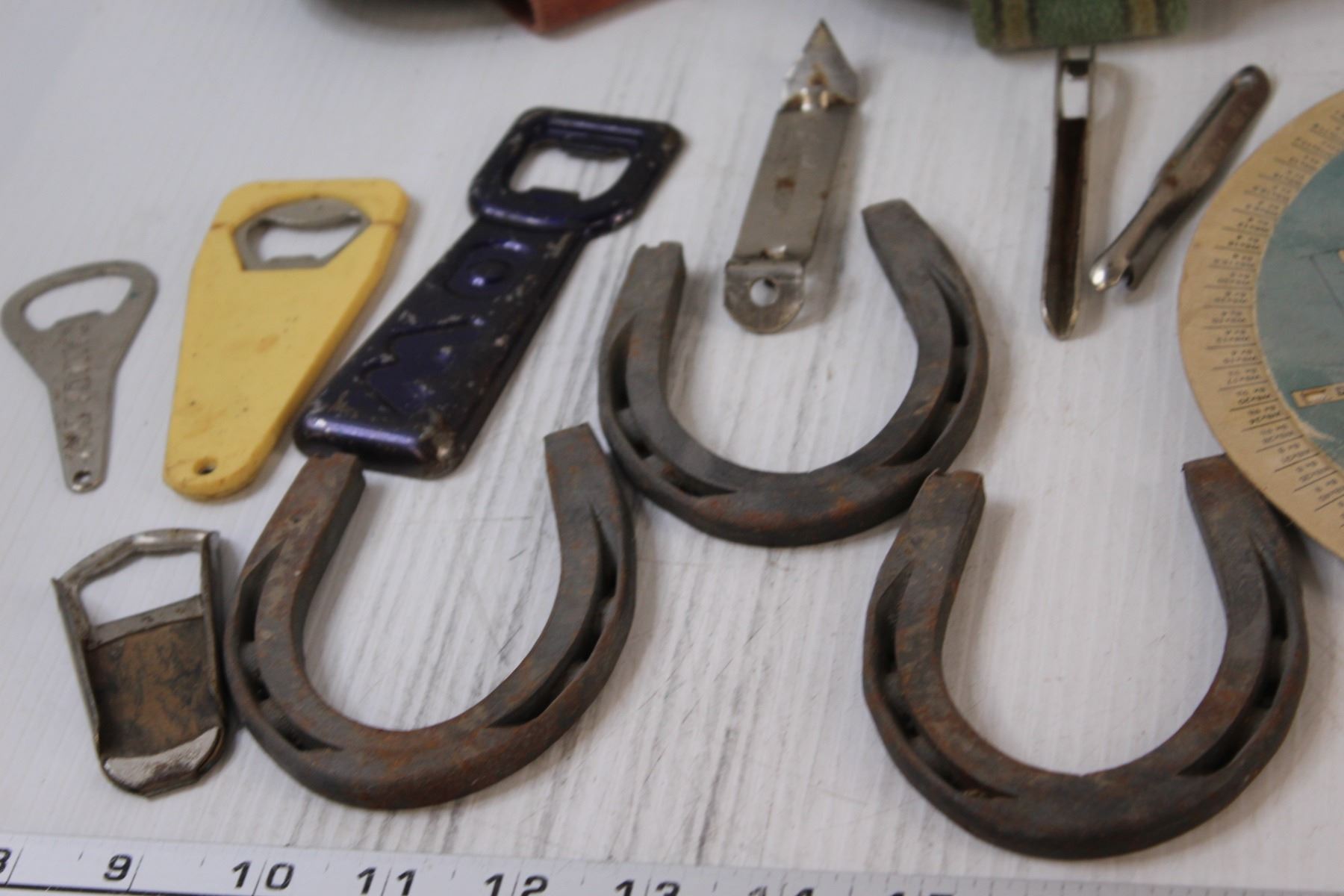 (3) Horse Shoes (4"), Bottle Openers, Horse Brushes, Juicer, Magnetic Dutch Children Figurines, Wood Flute, Misc.