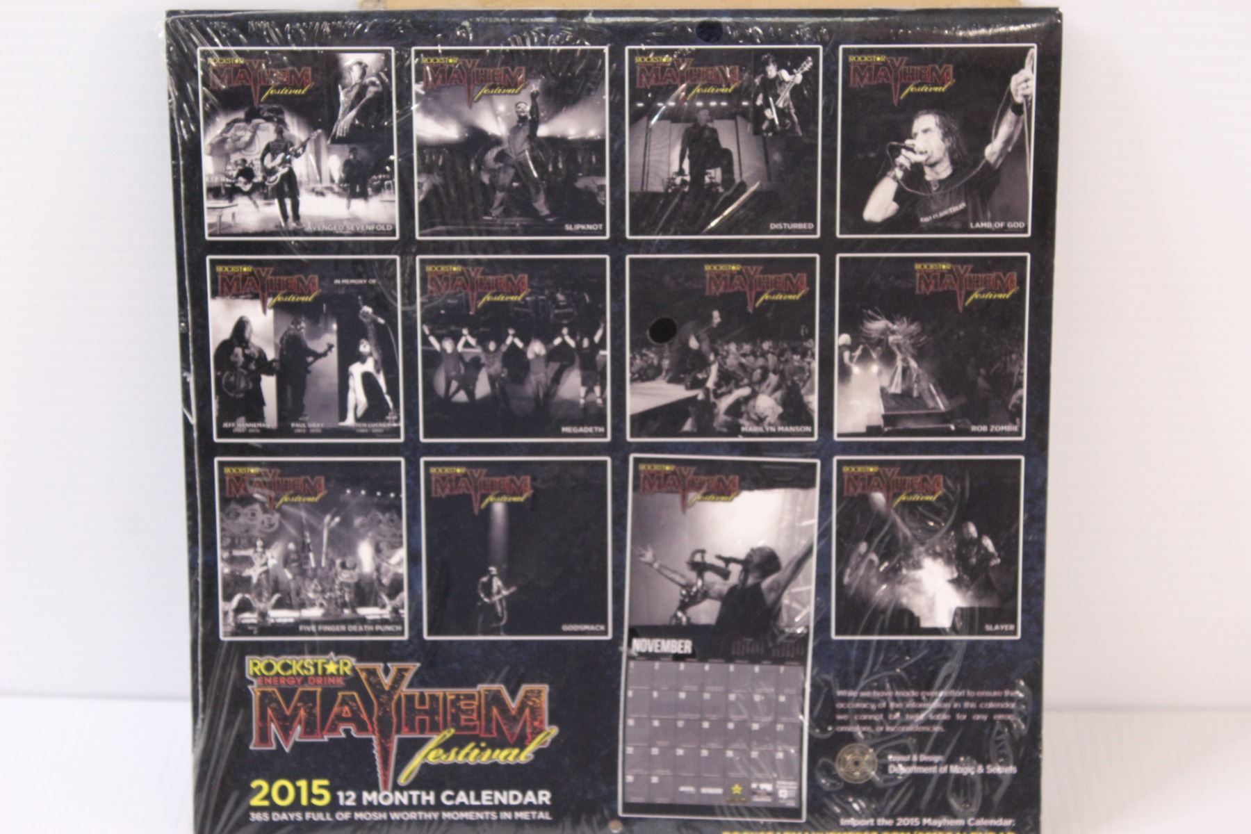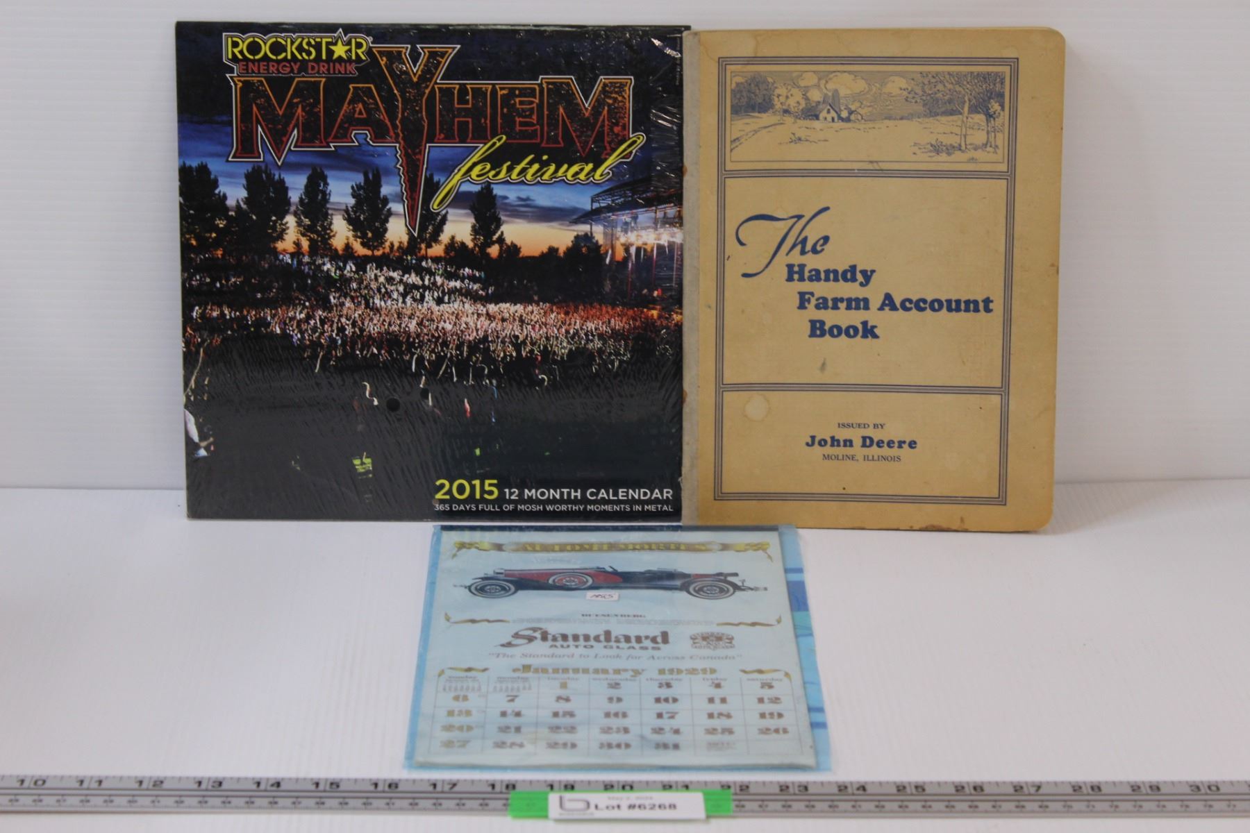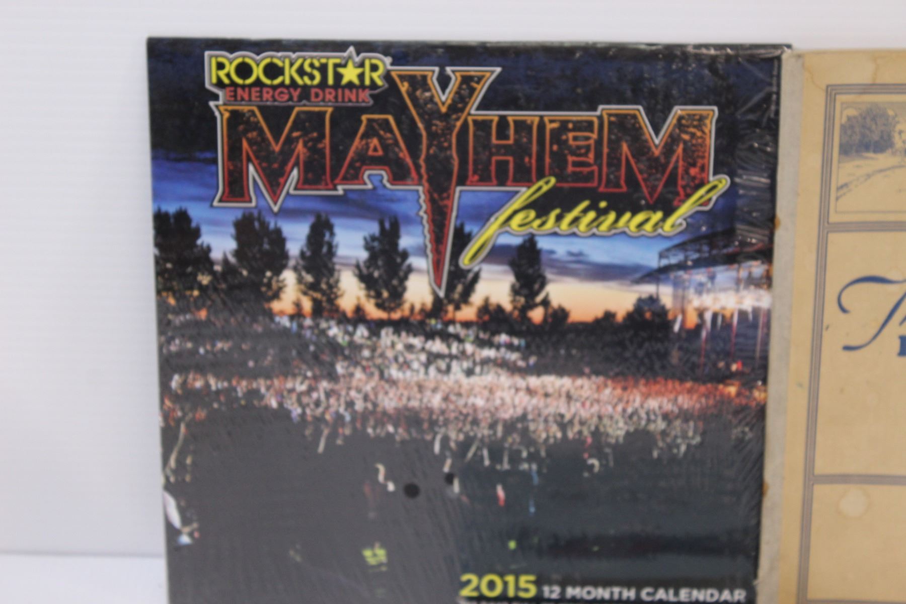 (3) Mayhem 2015 RockStar Energy Drinks Calendar; 1985 Vintage Looking Calendar; Farmers Handy Account Book
