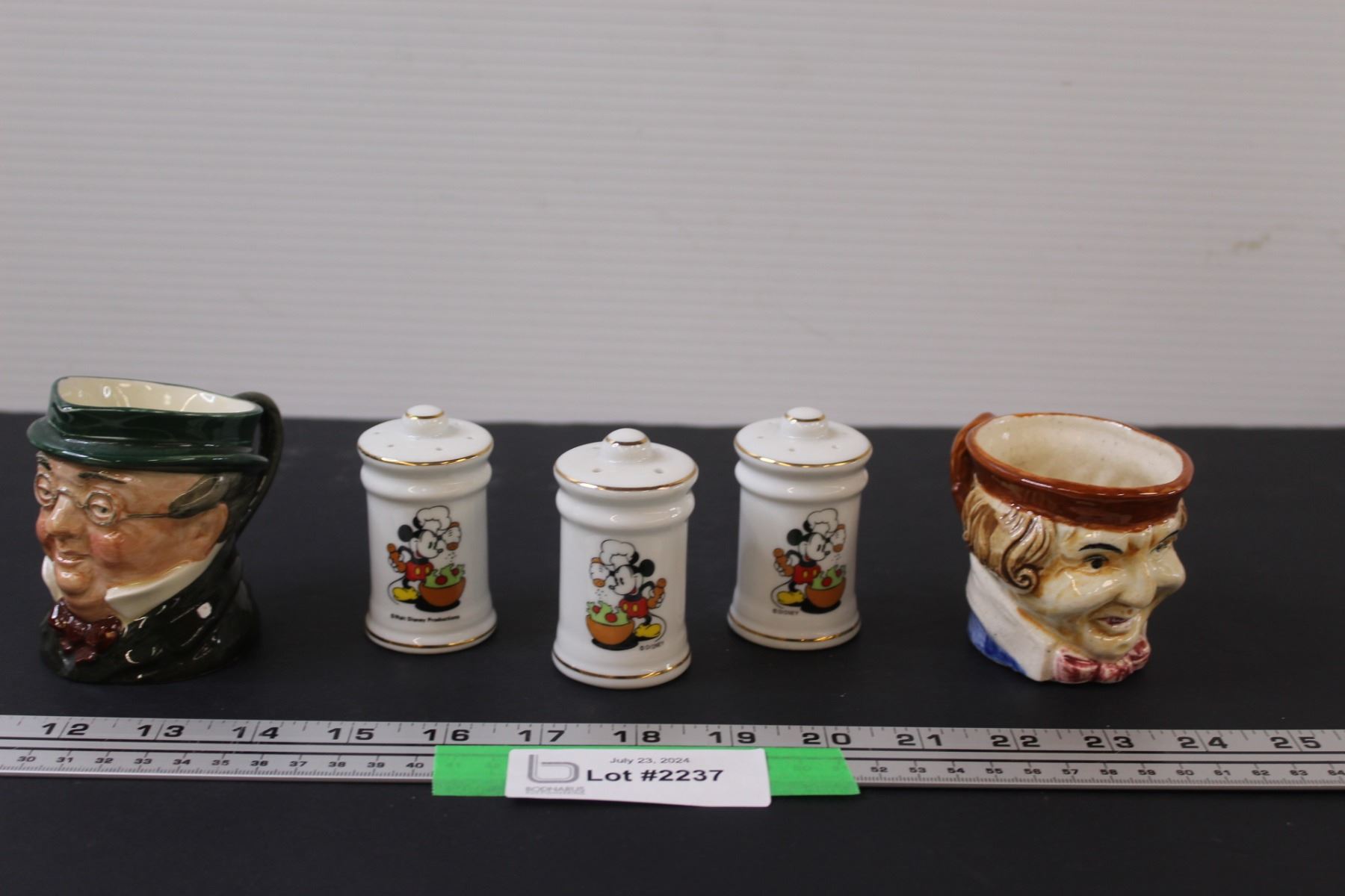 (3) Mickey Mouse Salt & Pepper Shakers, (2) Gentleman's Mugs