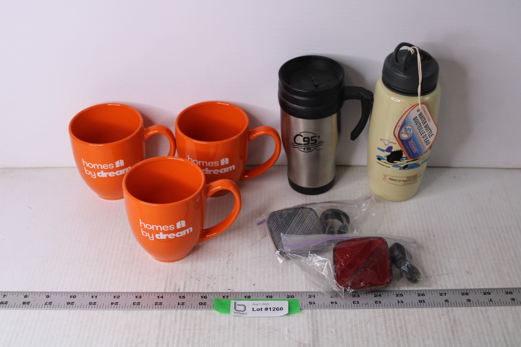 (3) Mugs, Travel Mug, and New Canada Goose Stainless Steel Water Bottle & reflectors
