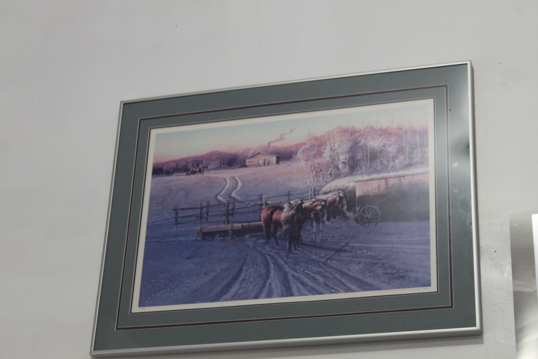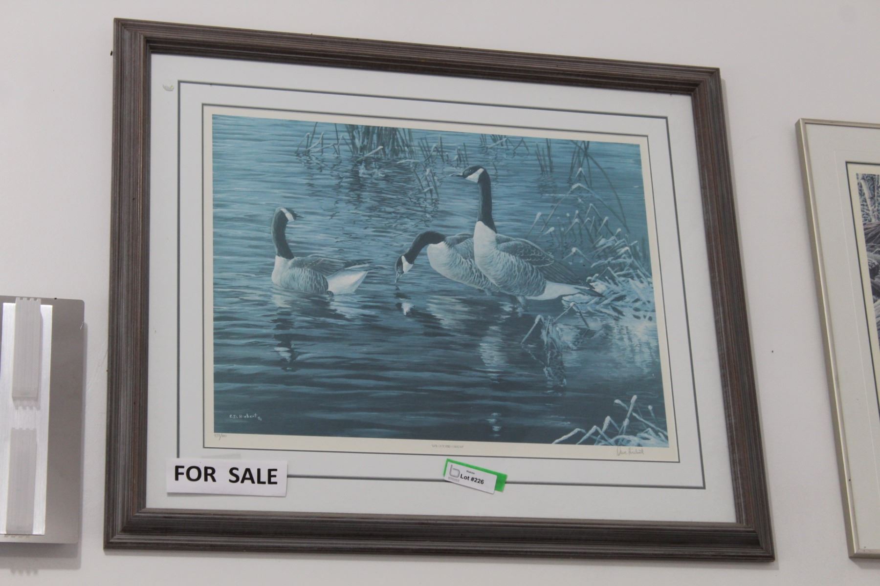 (3) Pictures: Goose Print in Frame - 35" x 29", Prairie Chicken, Horse Scene