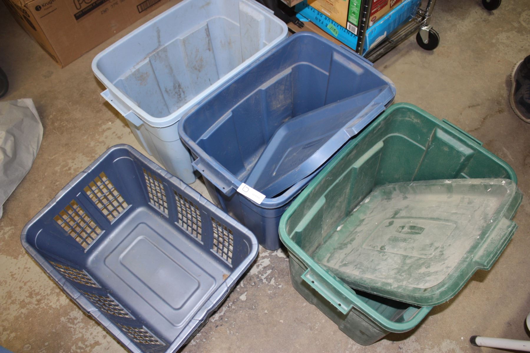 3 Plastic Storage Tubs (2 With Lids) and Laundry Basket