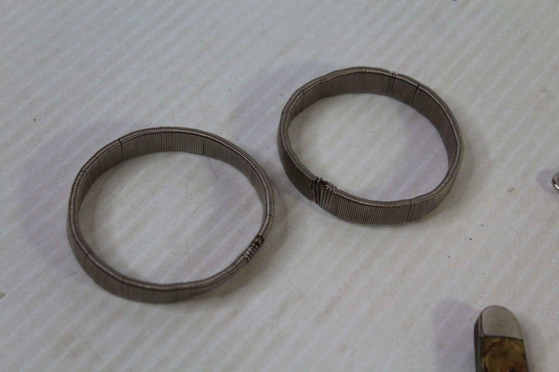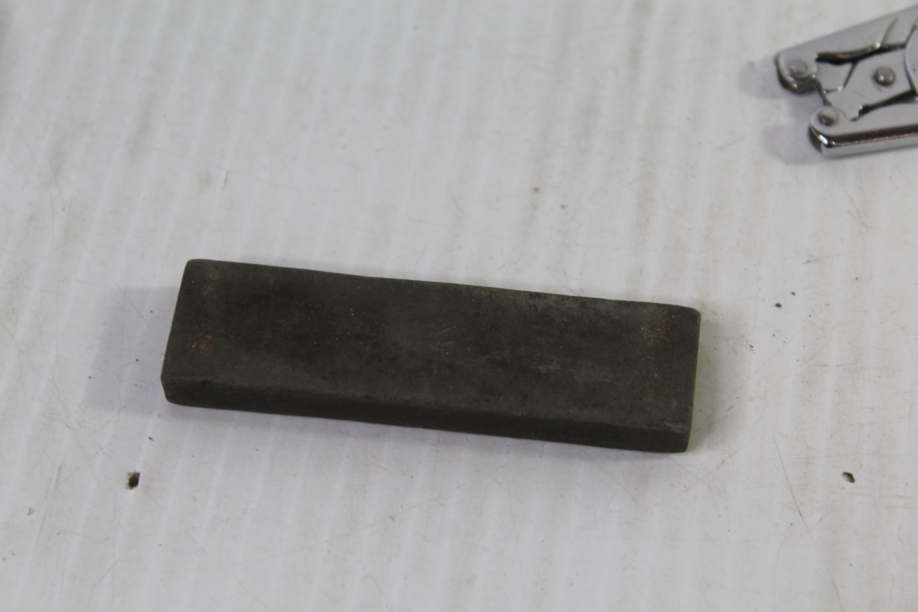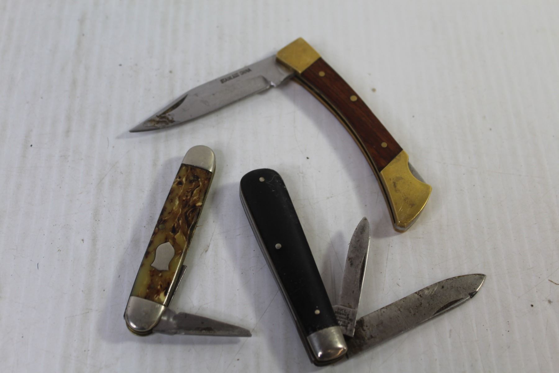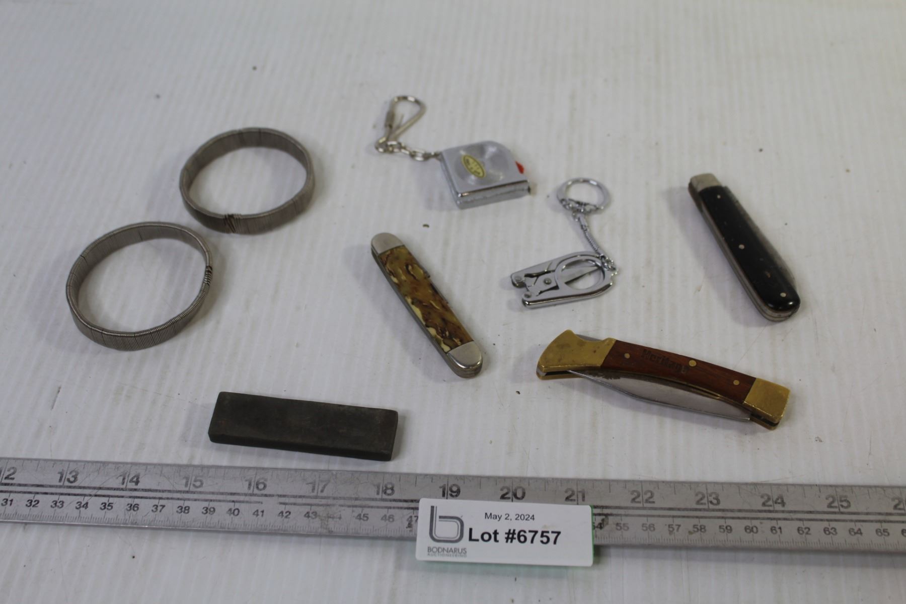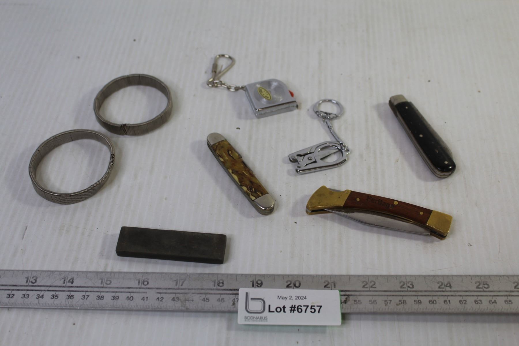 (3) Pocket Knives - Sleeve Bands - Small Measuring Tape - Folding Scissors - Honing Stone