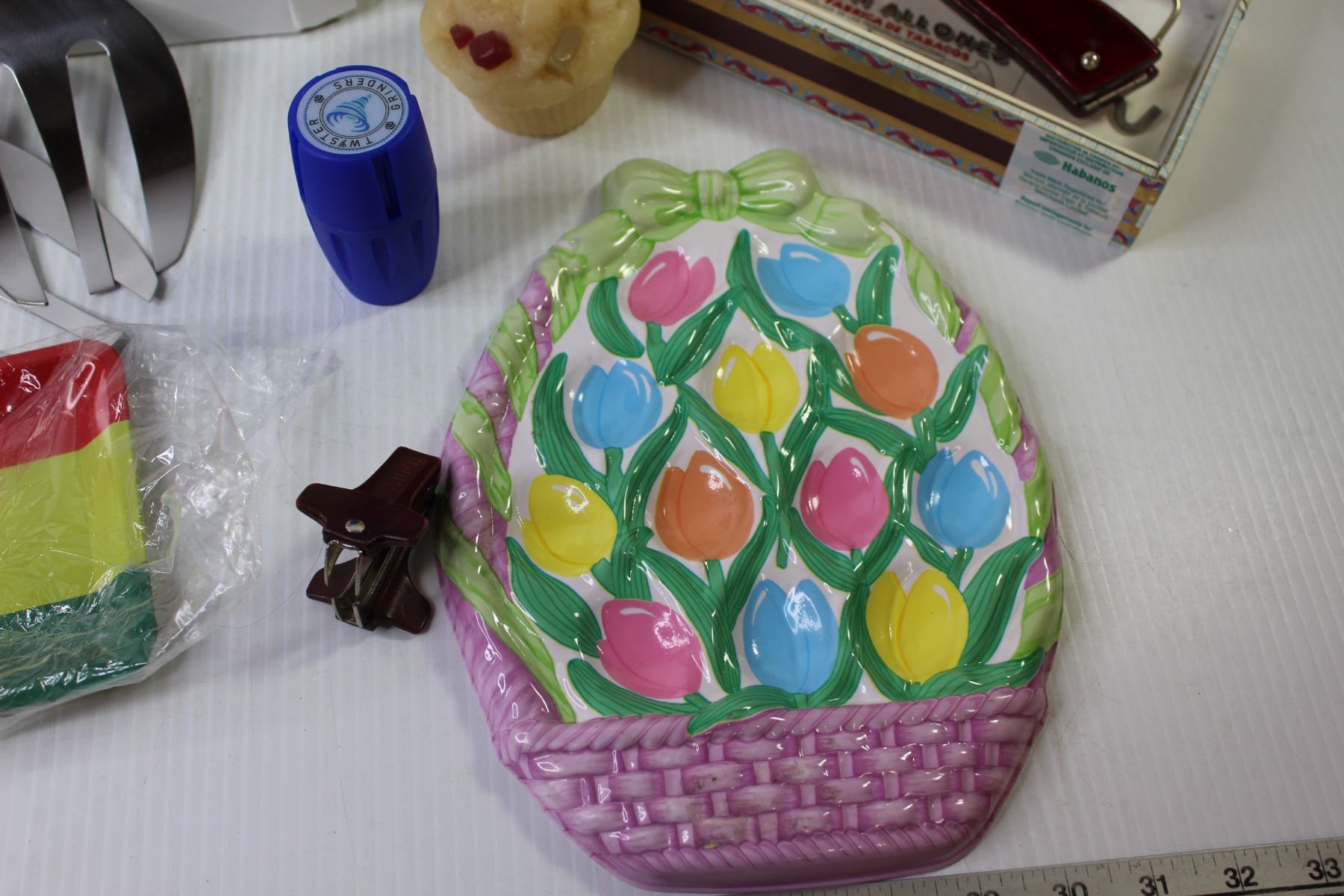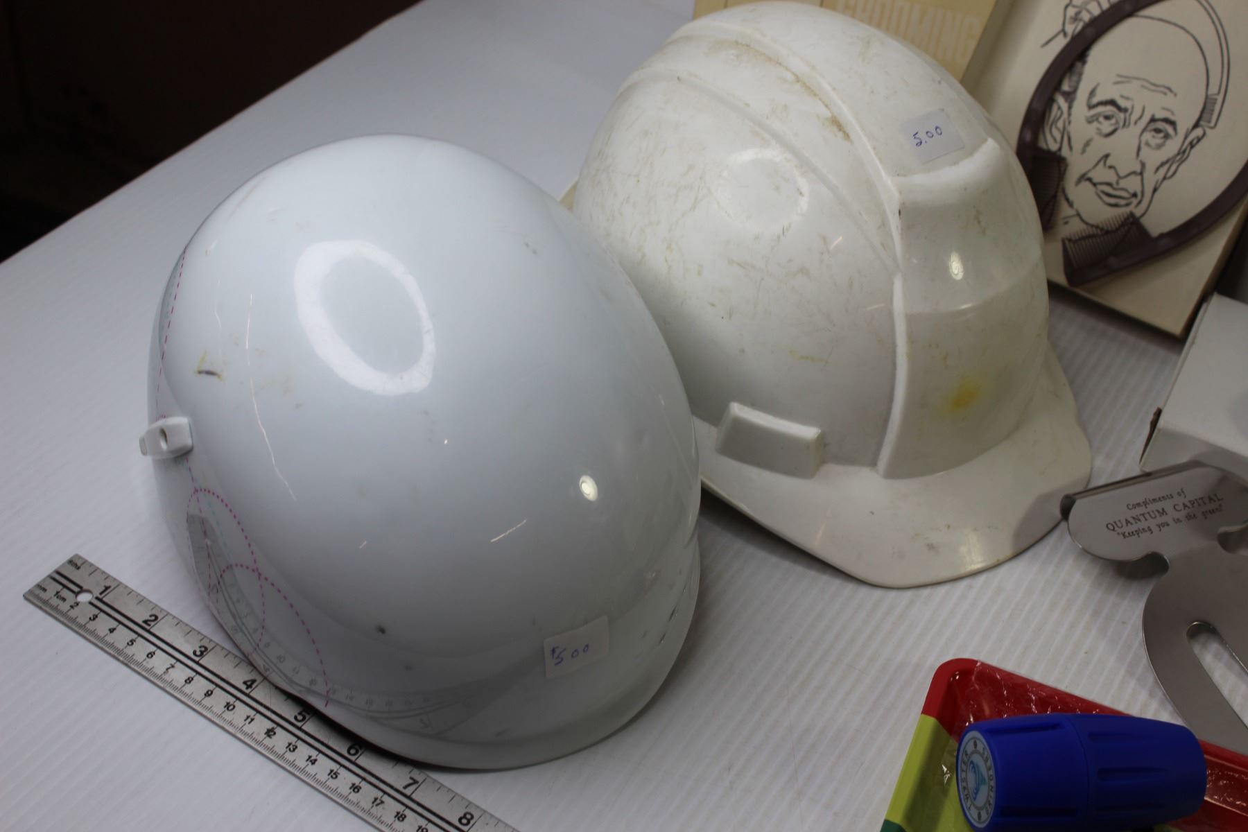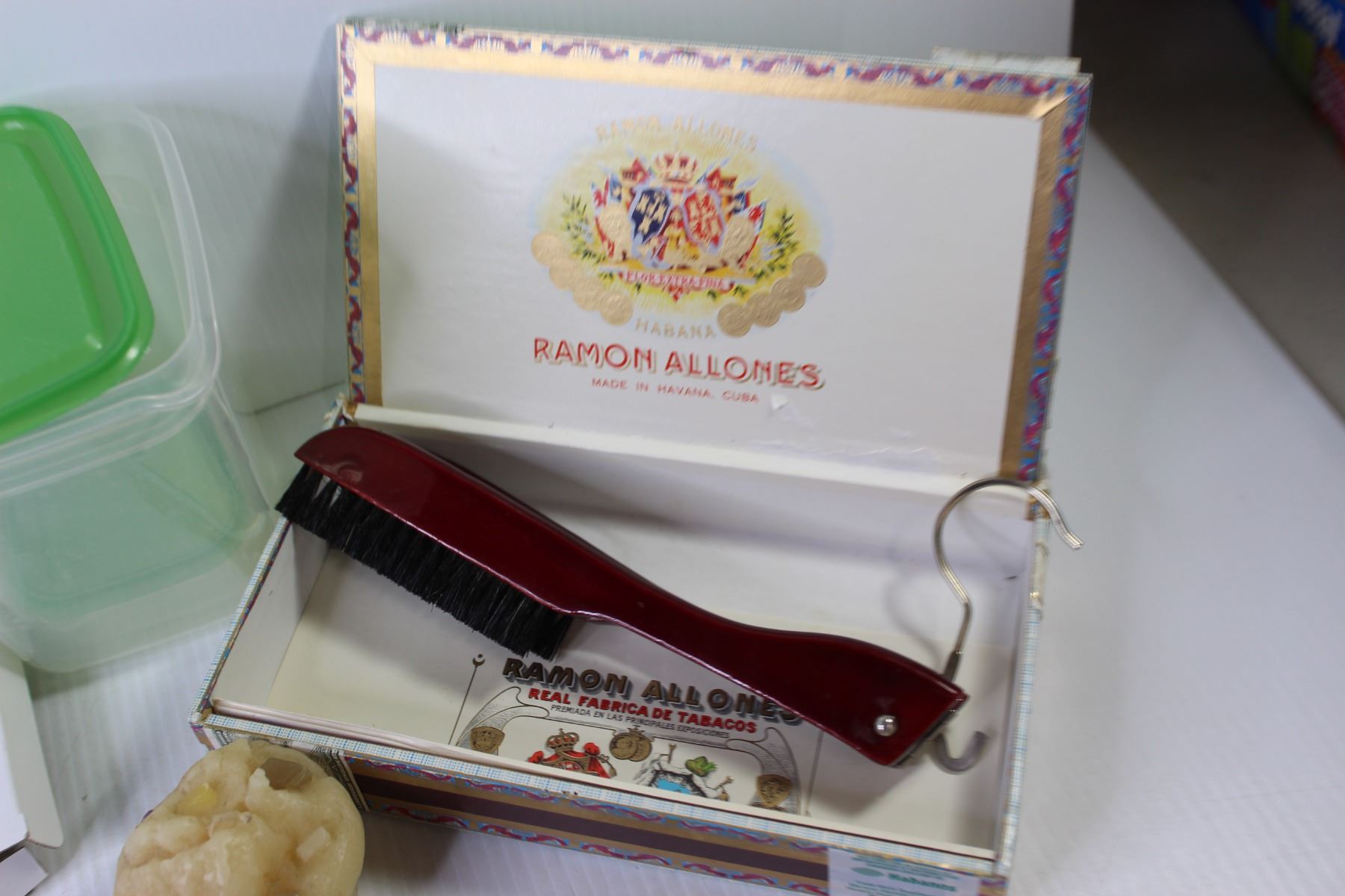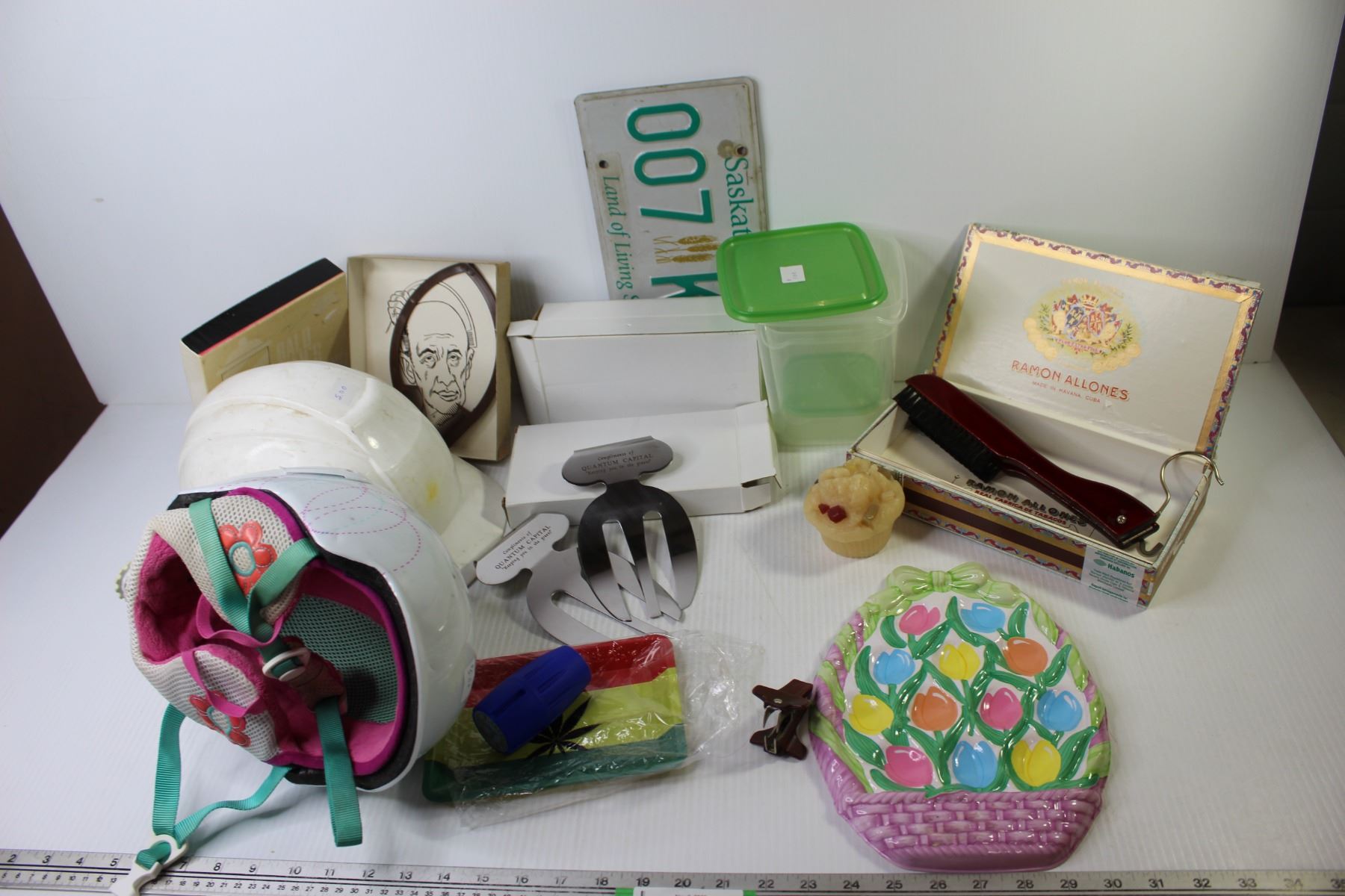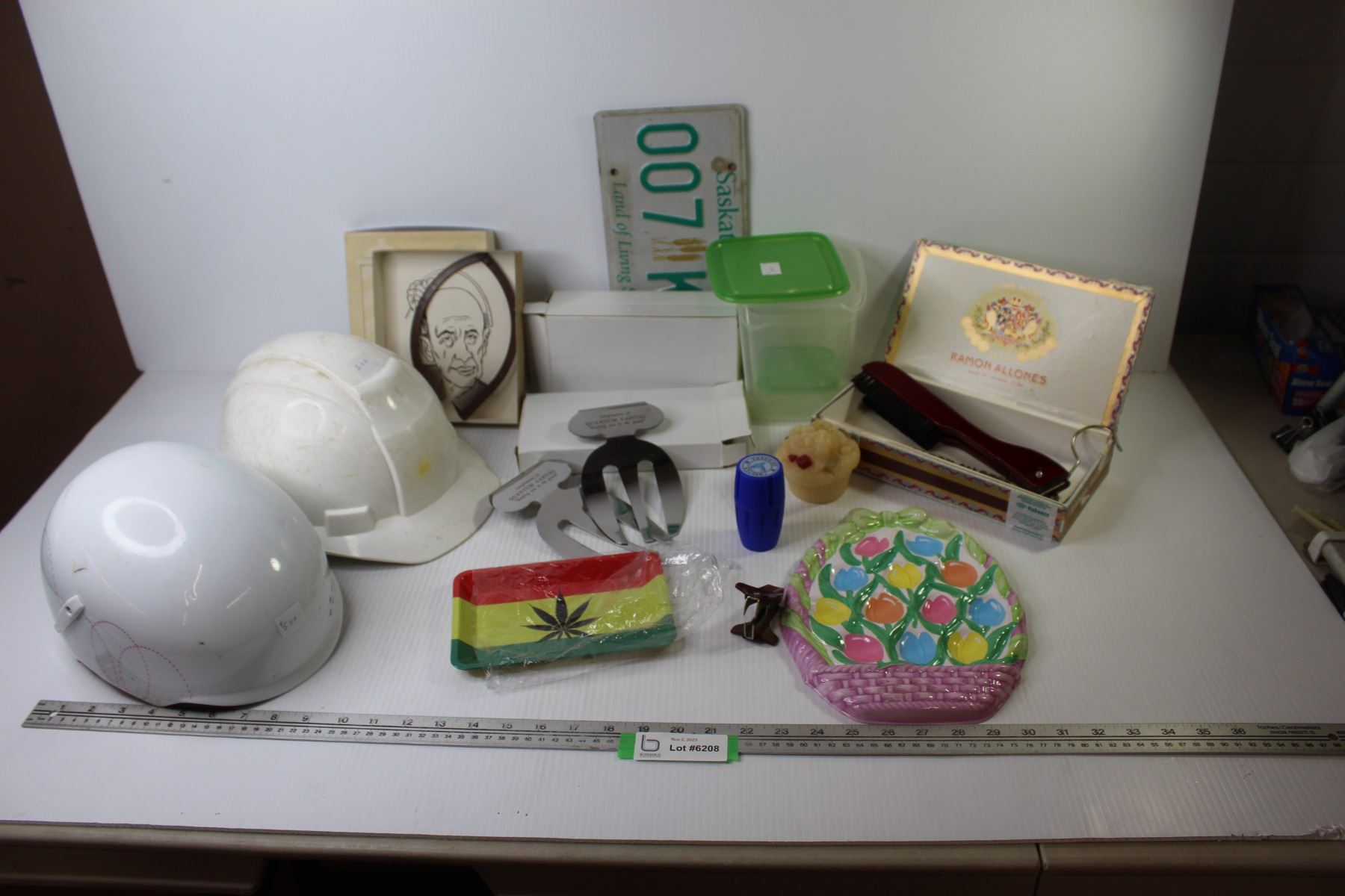 (3) Sets Salad Tongs - Hard Hat - Vintage Clothes Brushes - Cigar Box - Metal Tray w/Leaf - Vintage Bald Man's Grooming Kit - Misc. Items