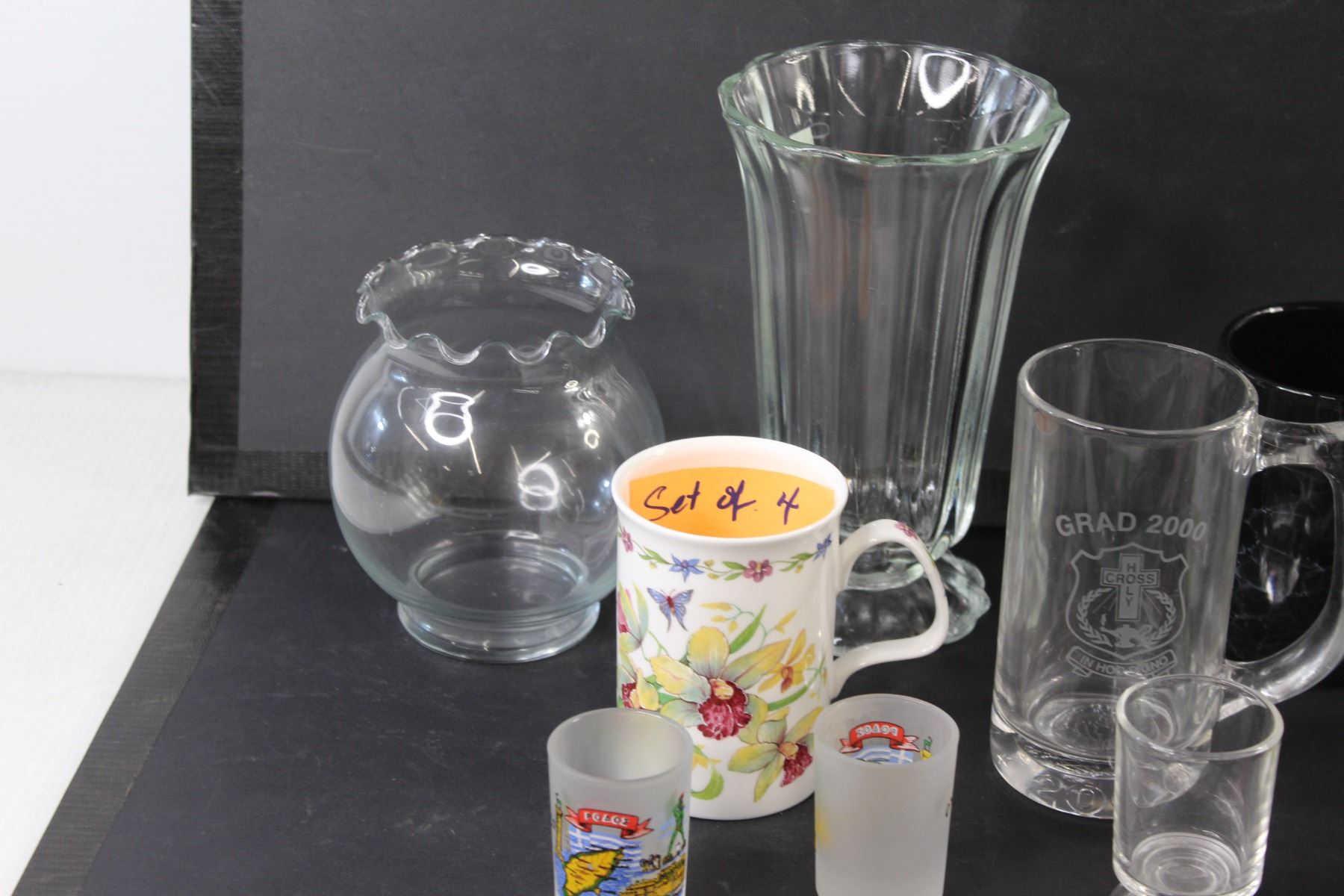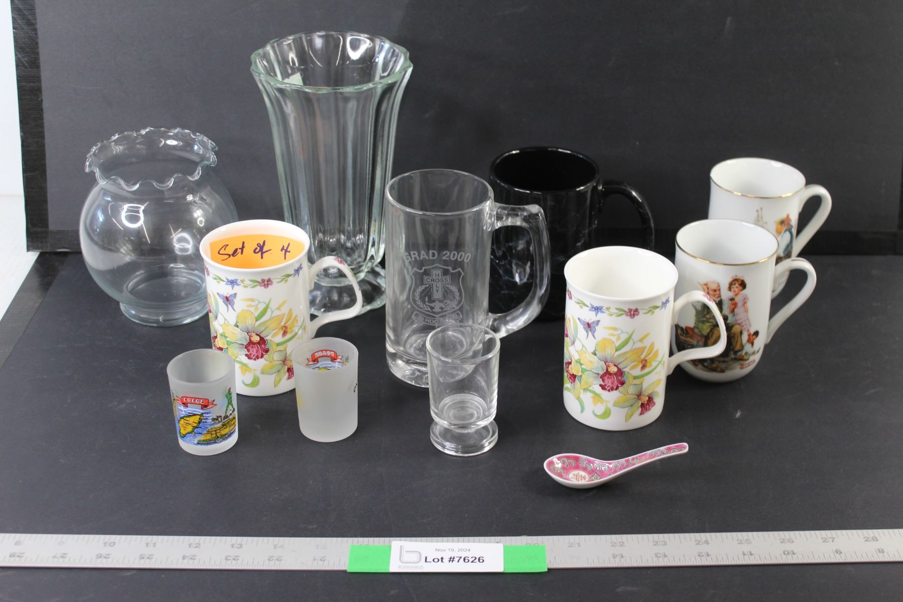 (3) Shot Glasses, (6) Cups/Mugs, (2) Vases
