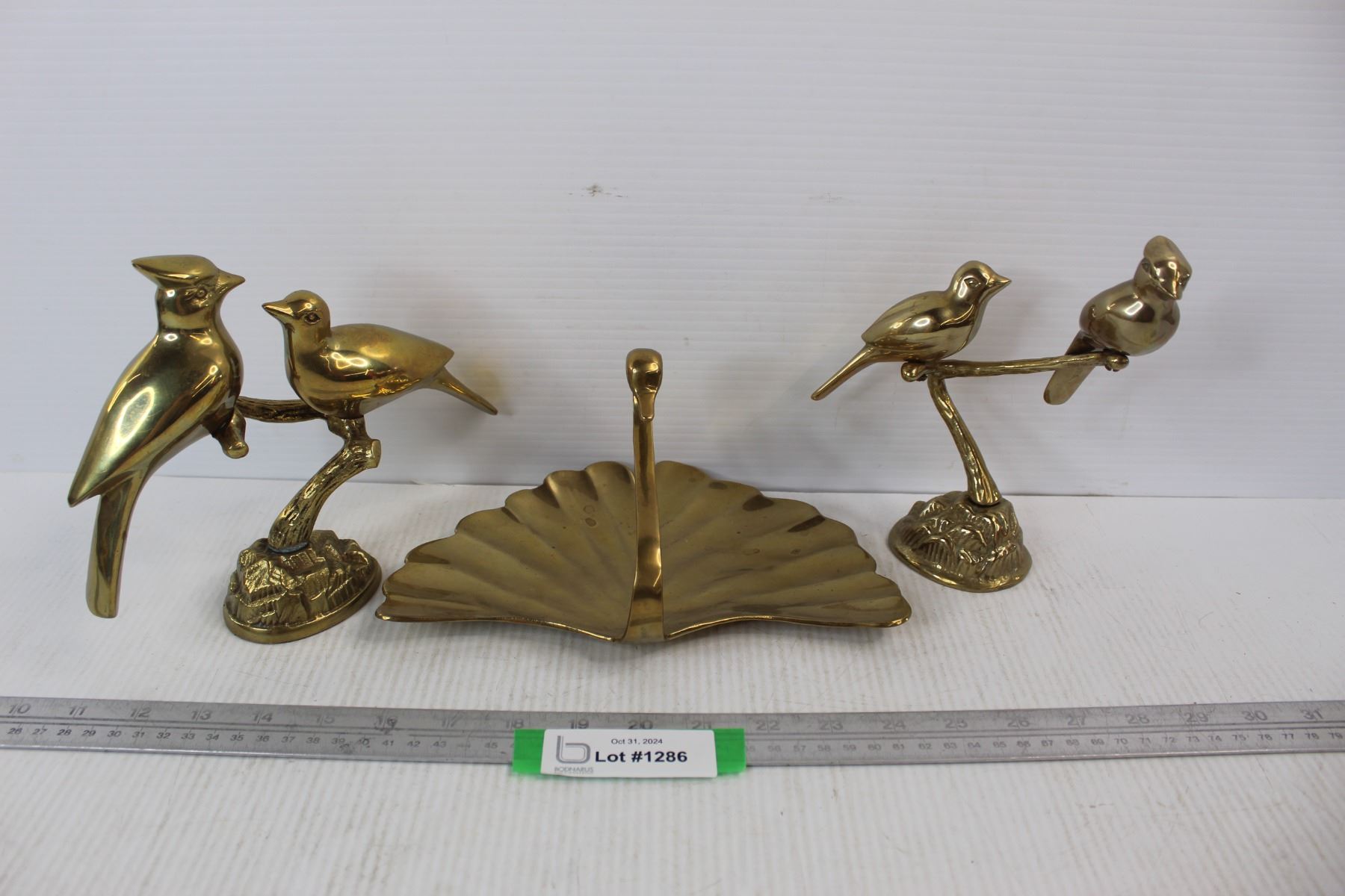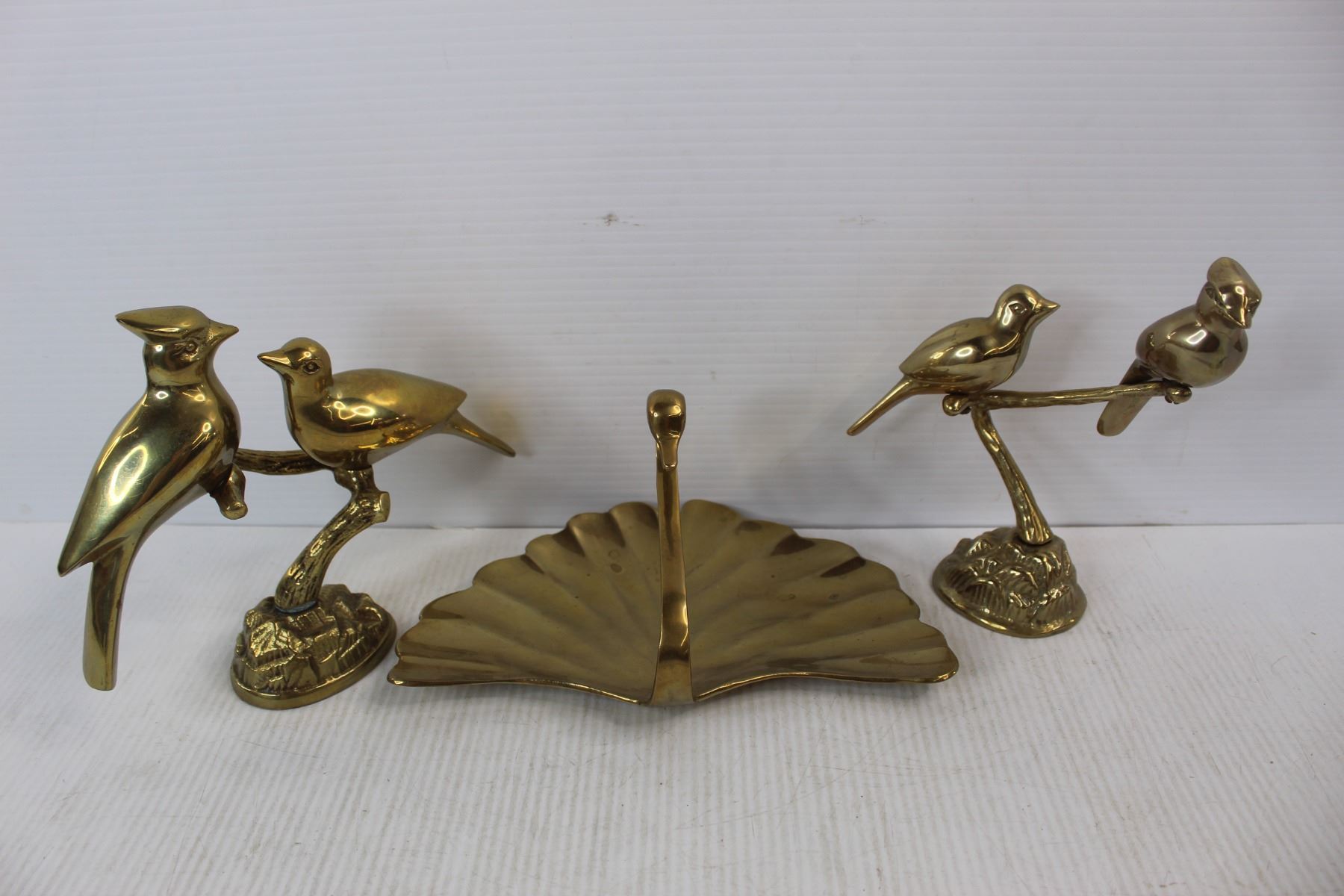 (3) Solid Brass Ornaments, Birds On Branches, Brass Swan Dish