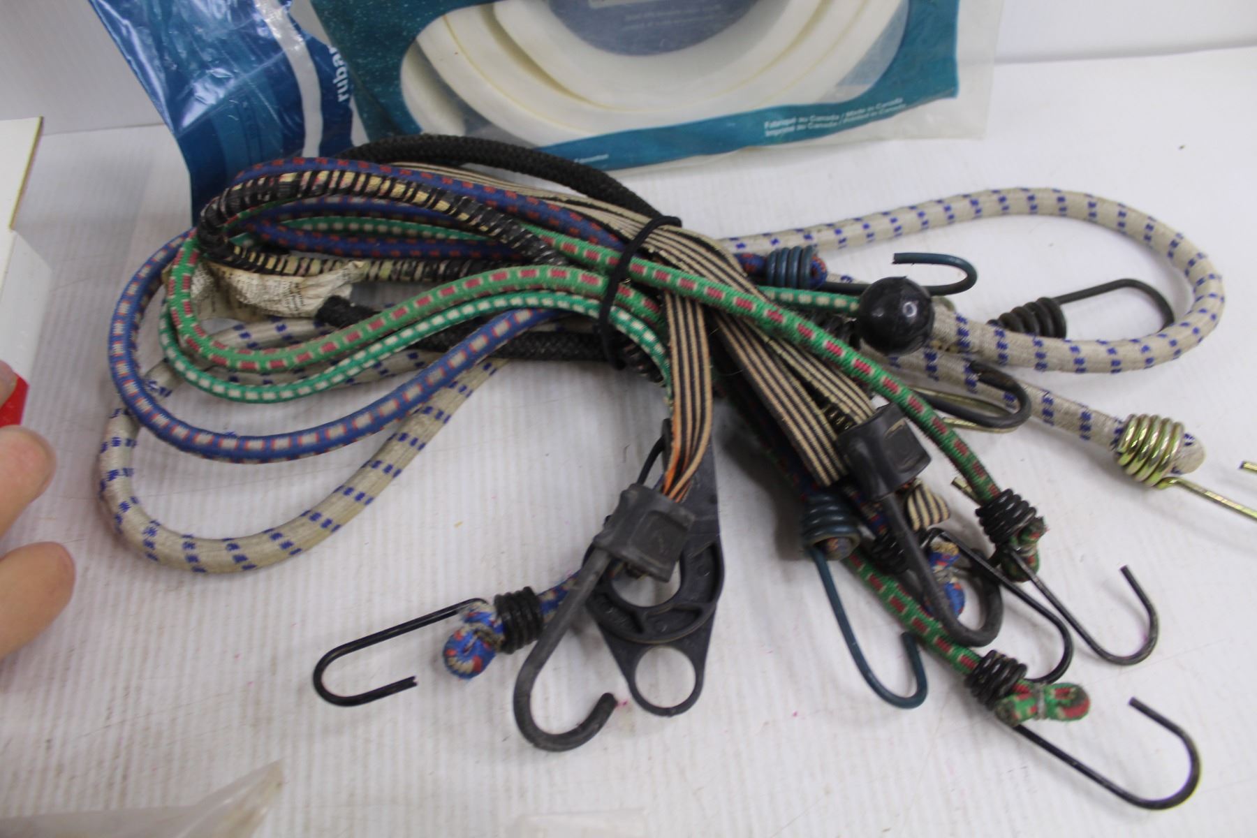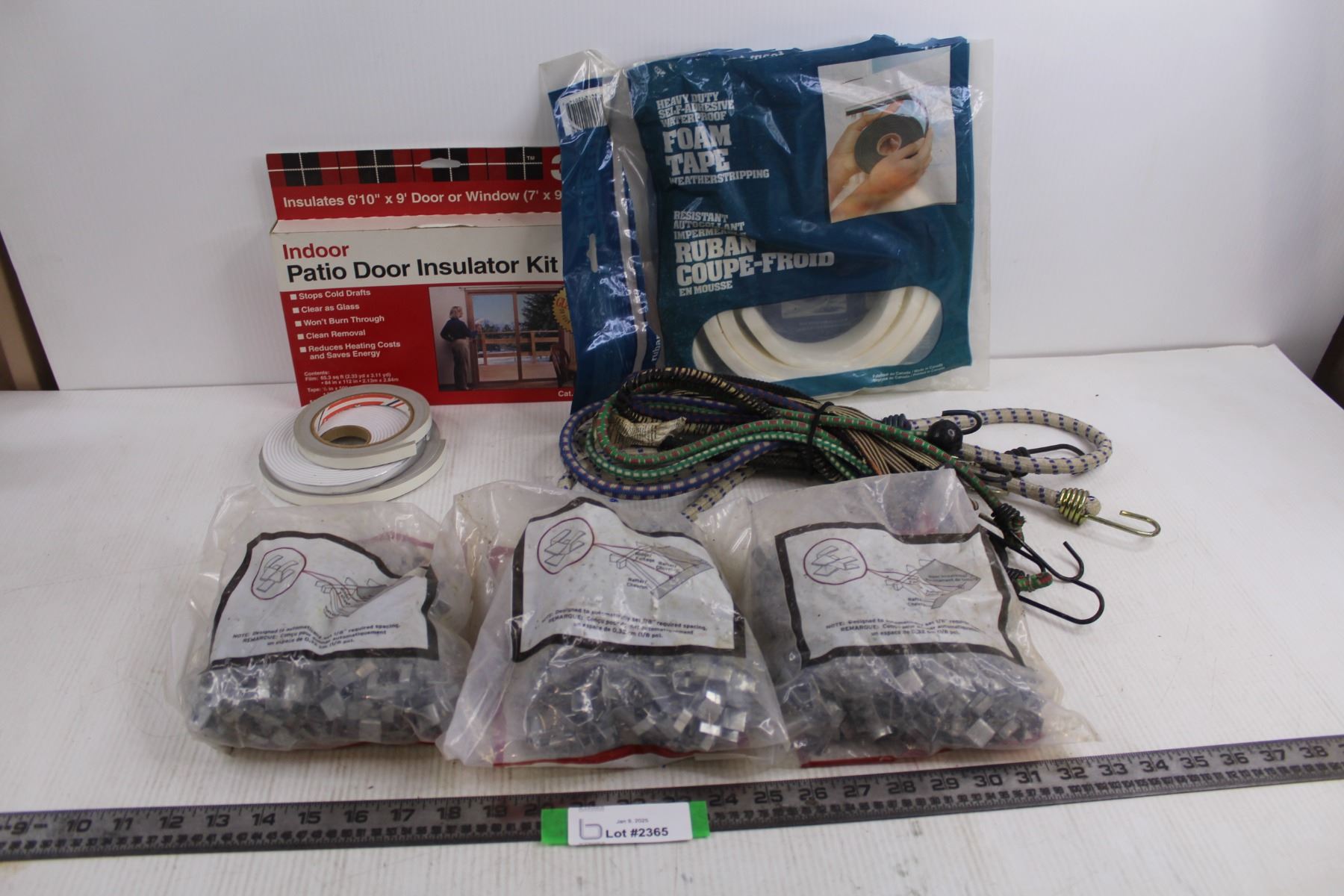 (3) USP Roof Clips - Bags 100 - NIB, 3M Indoor Patio Door Insulator Kit - NIB, Assorted Foam Tape Weatherstripping, Assorted Bungee Cords