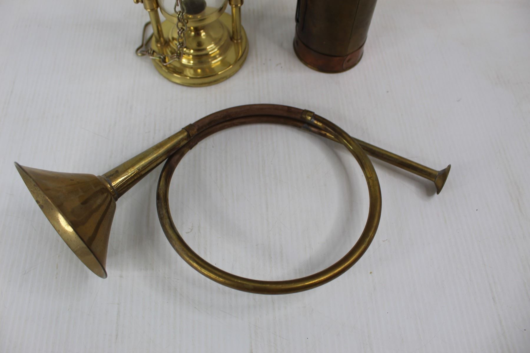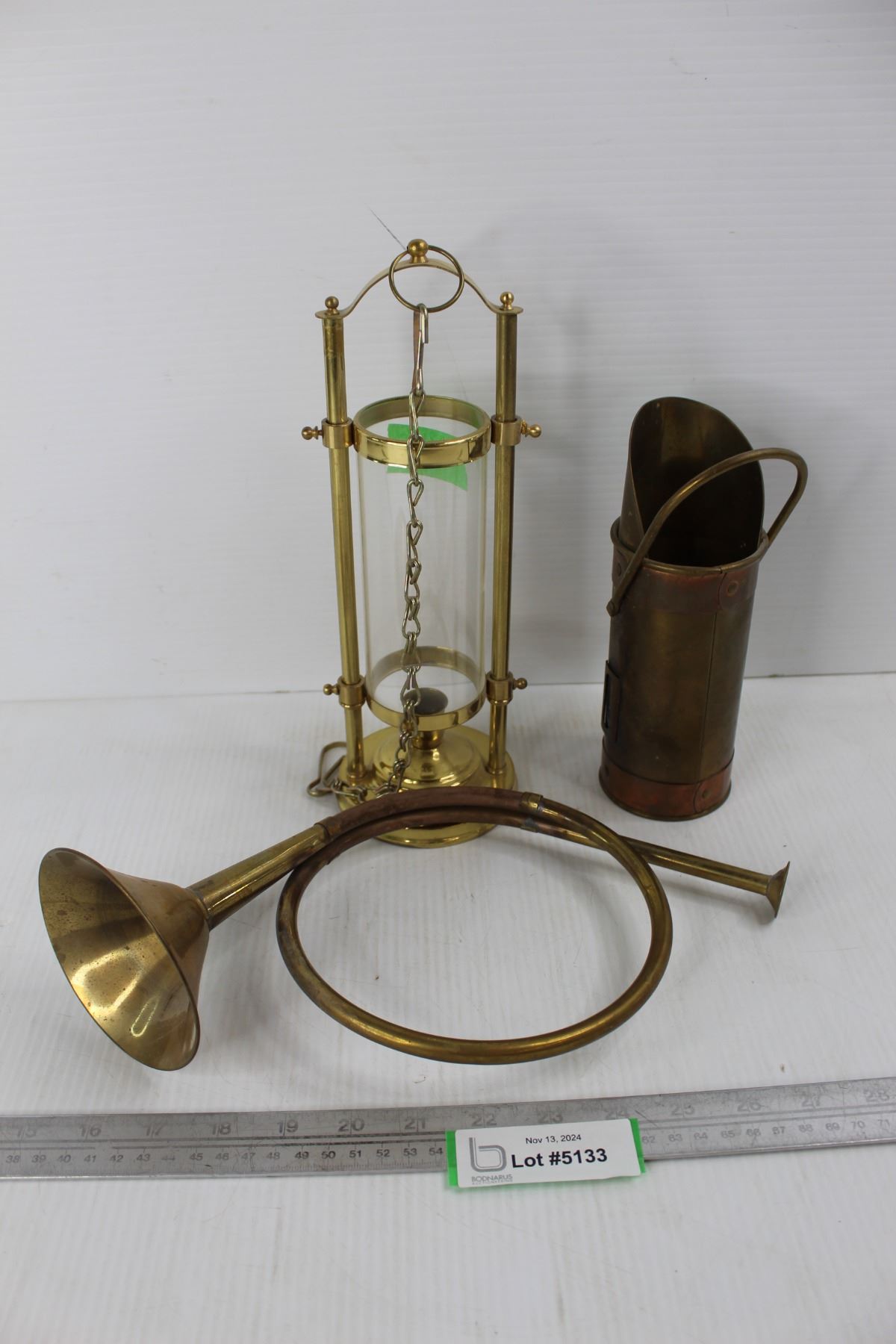 (3) Various Solid Brass Items, Candle Holder, Horn Like Ornament, Misc