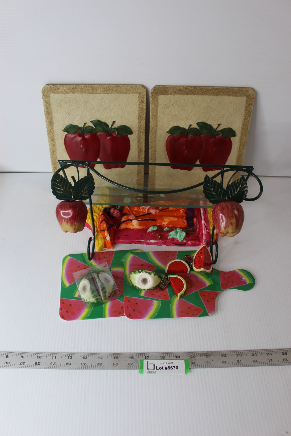 (3) Wall Hangings, (2) Watermelon Cutting Boards, (2) Sets Watermelon Salt & Pepper Shakers, Apple Wall Shelf With Glass Top