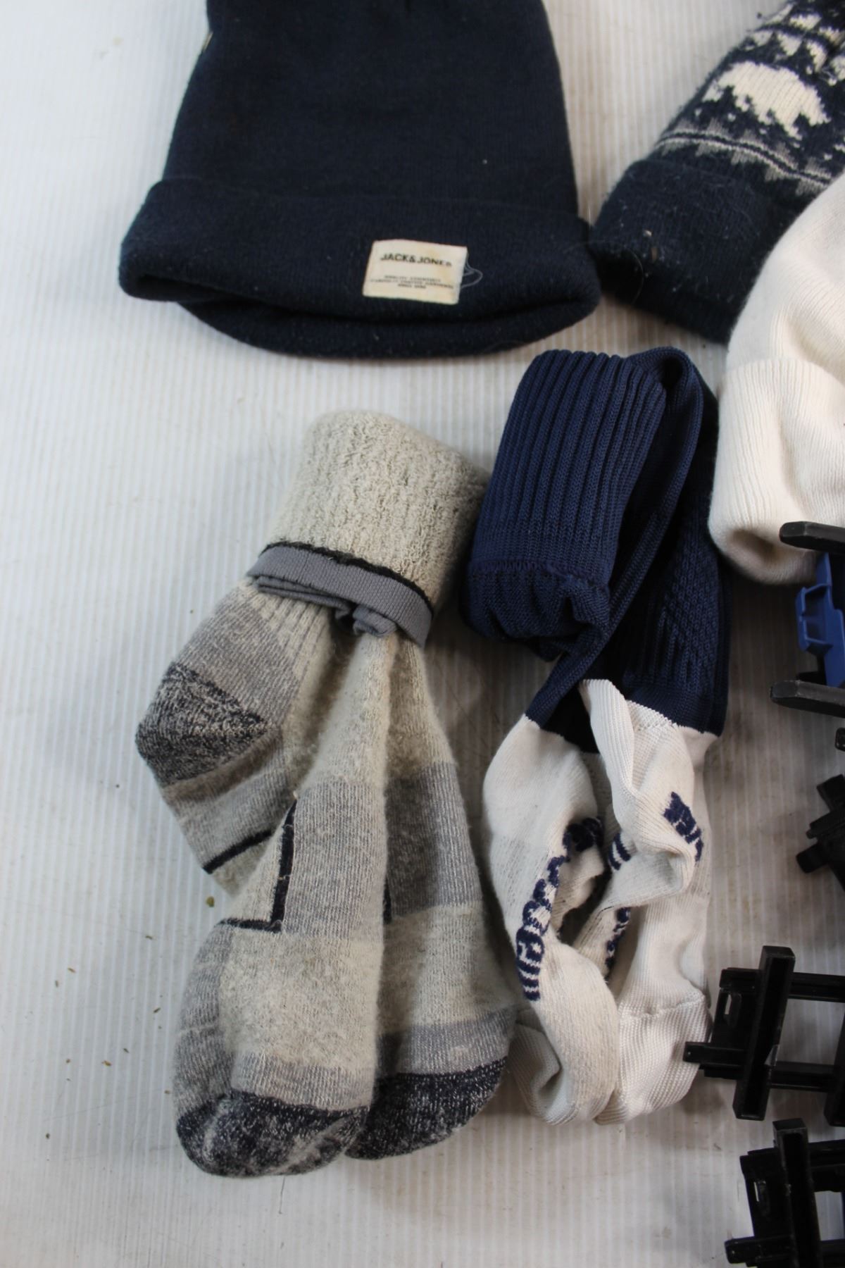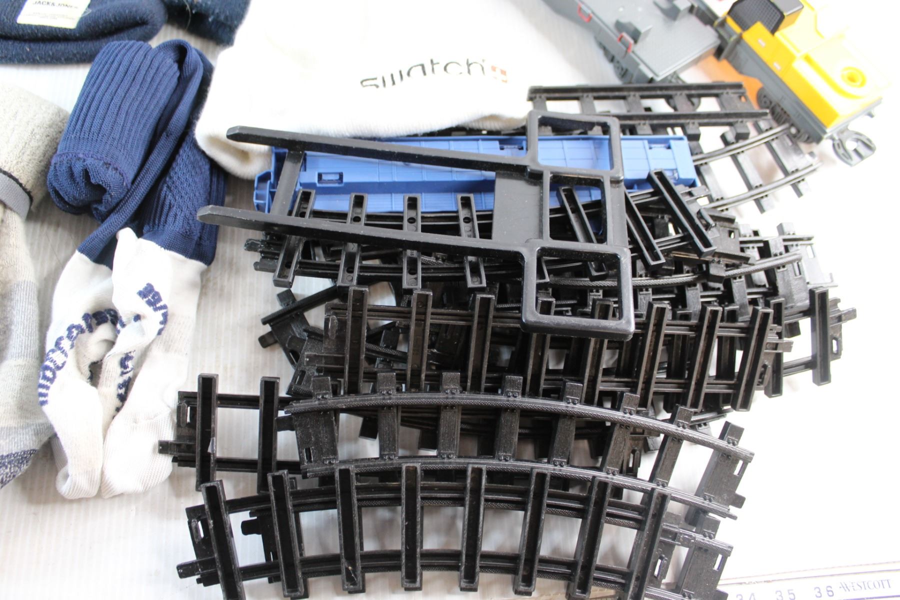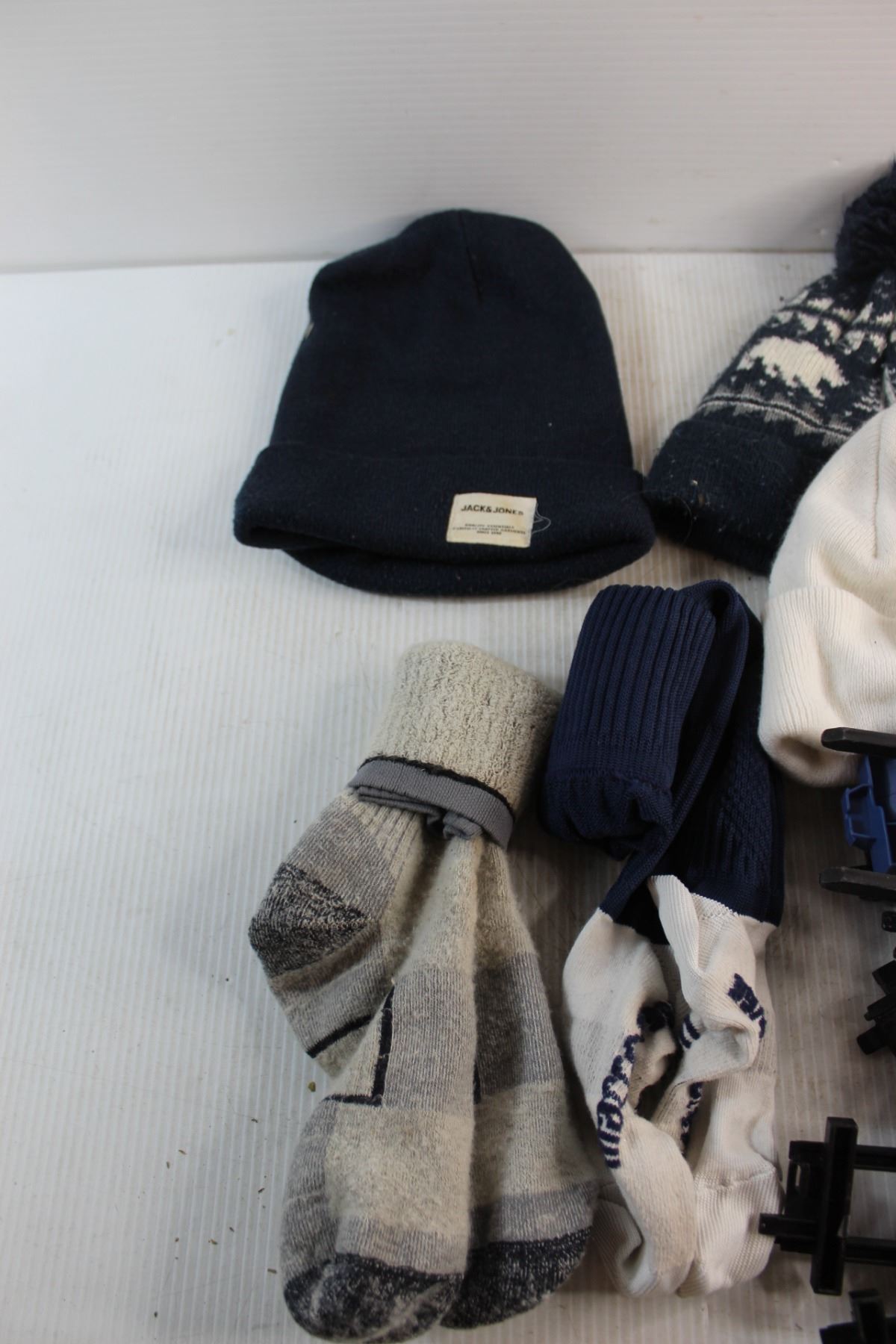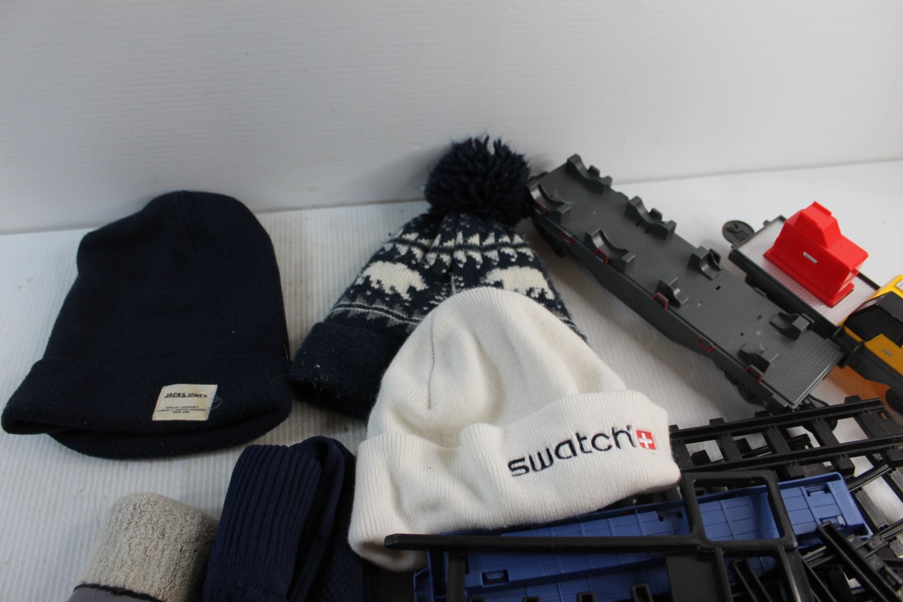 (3) Winter Hats, (2) Pairs of Socks and Train Toys & Rail Tracks
