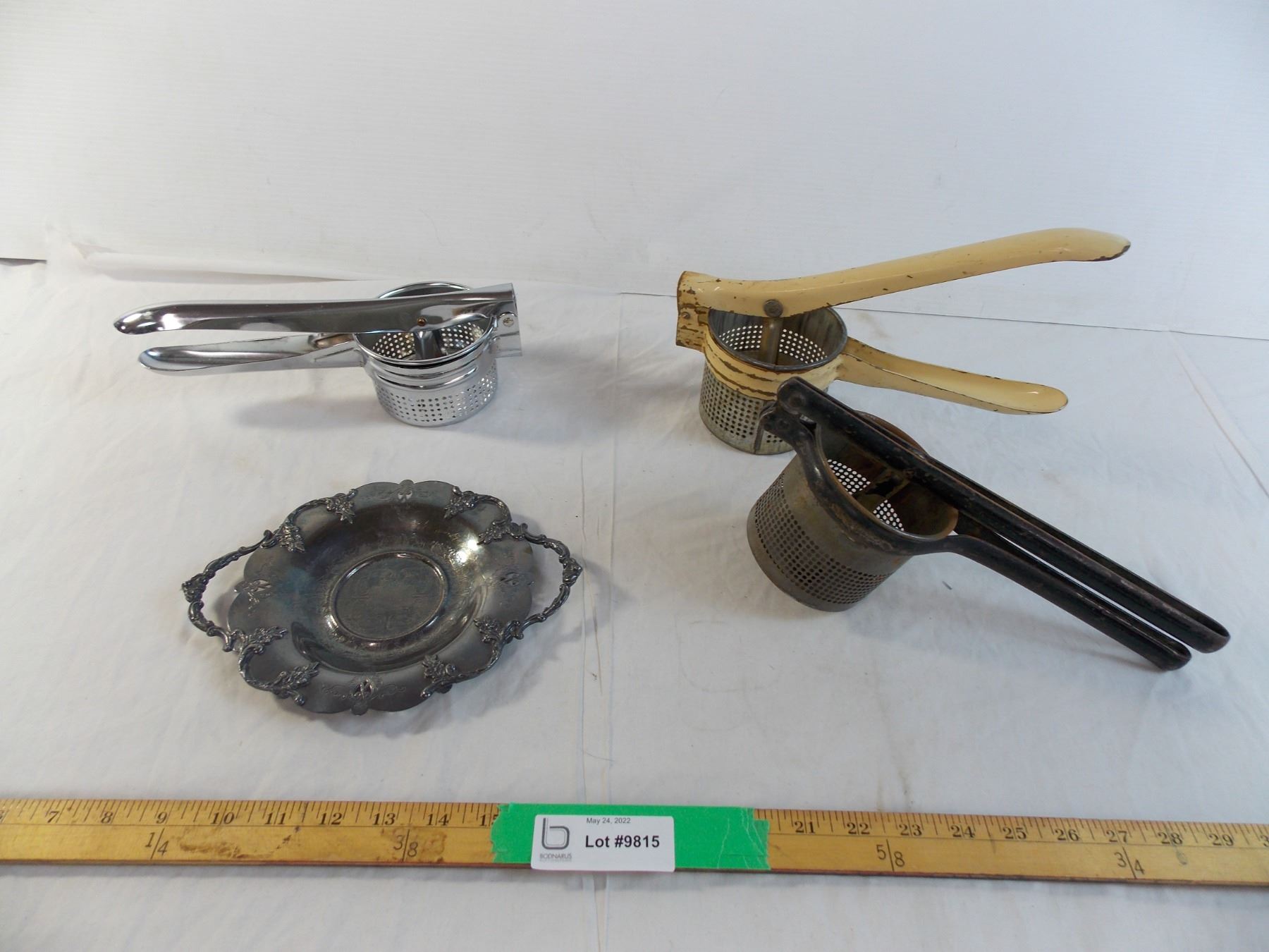 (3) vintage hand mash tools (ricers) + silver plated handled dish