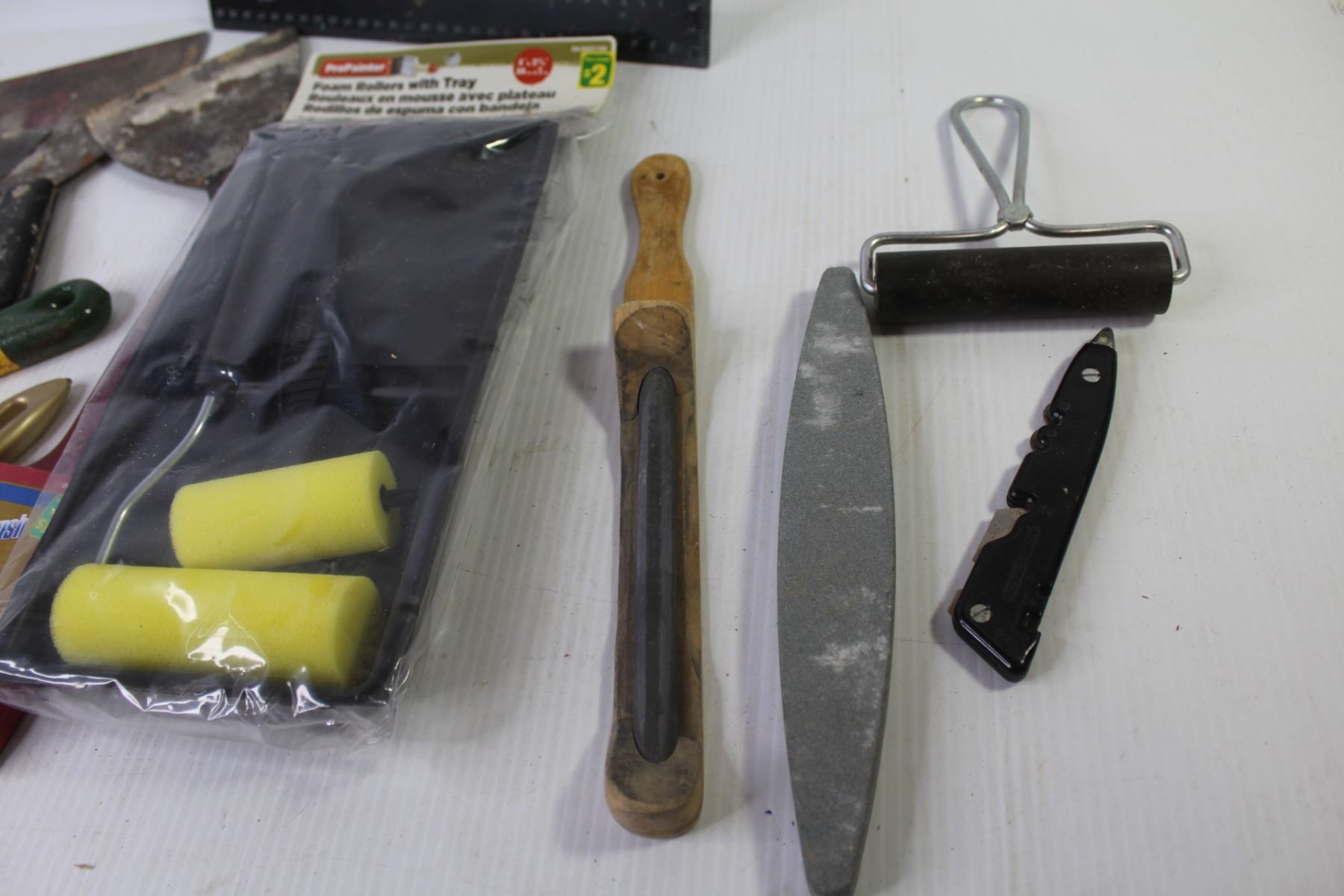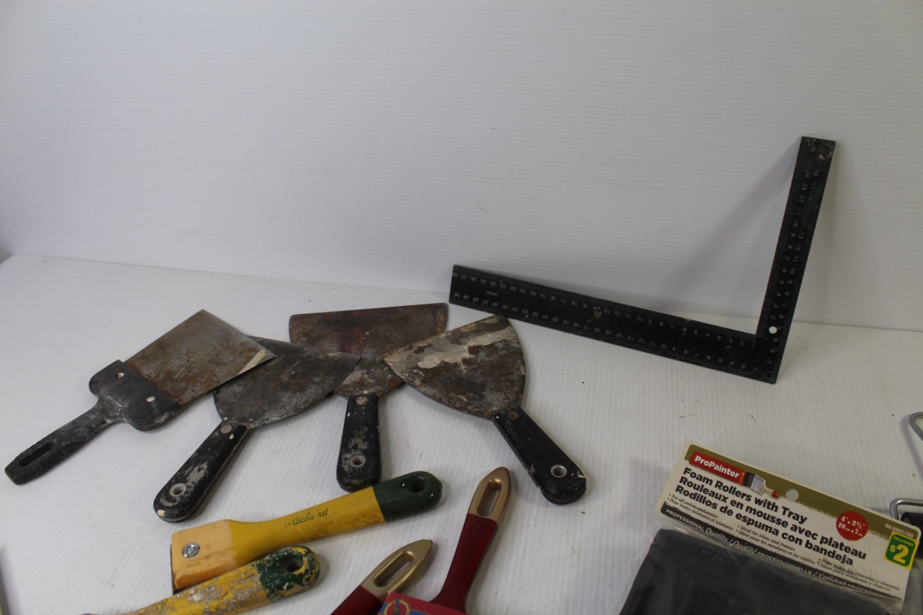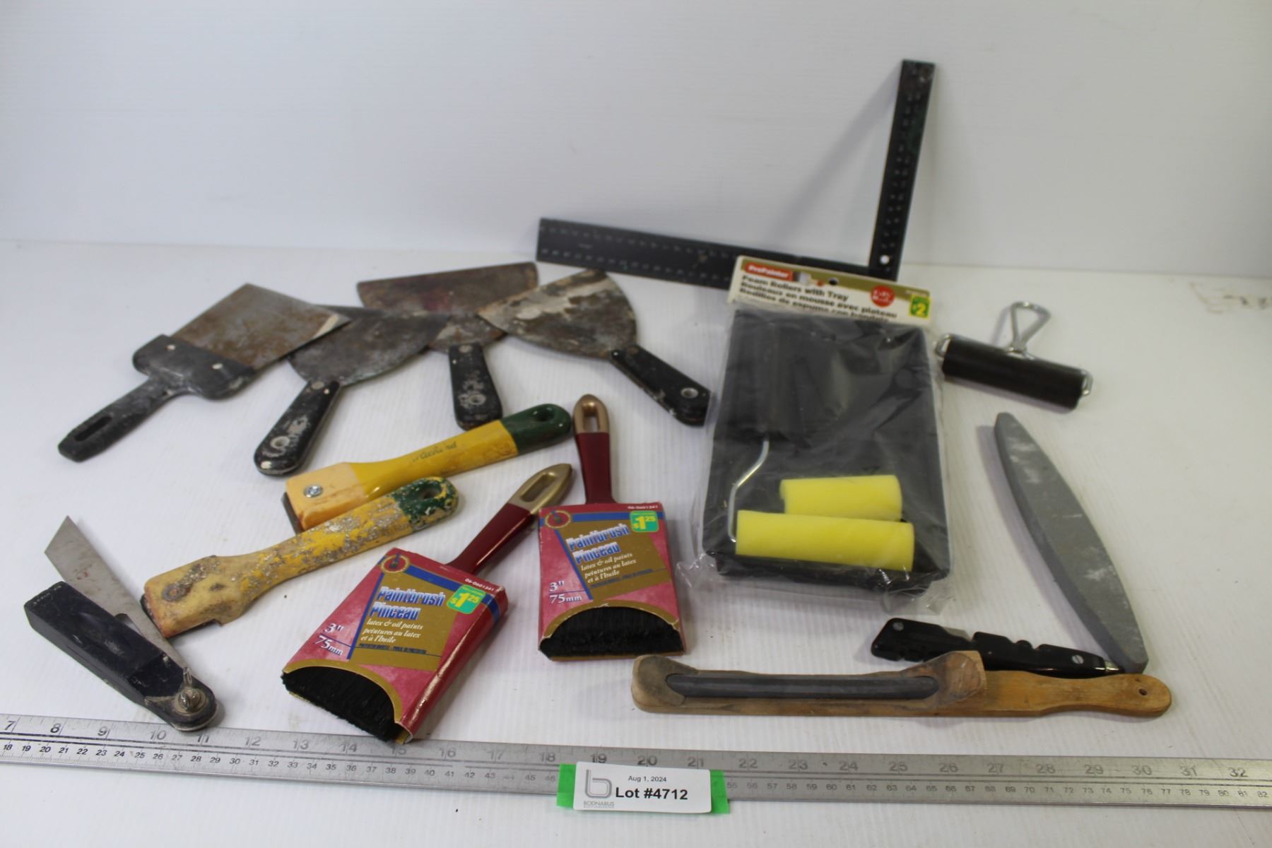 (4) 12" Square - (4) Drywall Mud Knives - Paint Brushes - Varathane Sponge Rollers in Tray - Honing Stone - Scrapers - Vintage File