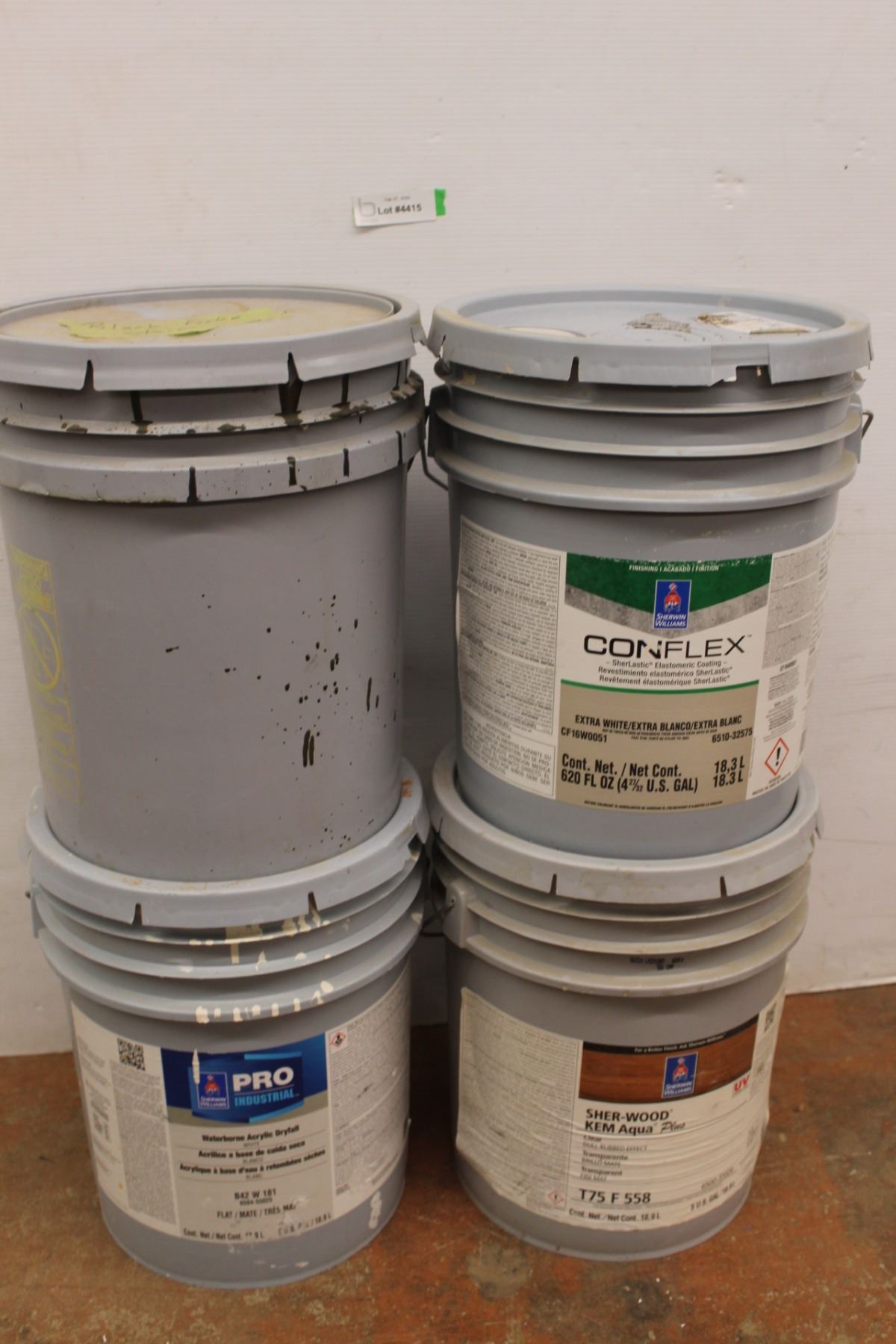** (4) 18.9L Pails - Partials - All 1/2 or Less (Black Fence Stain, Acrylic Dryfall, Sherwood Clear
