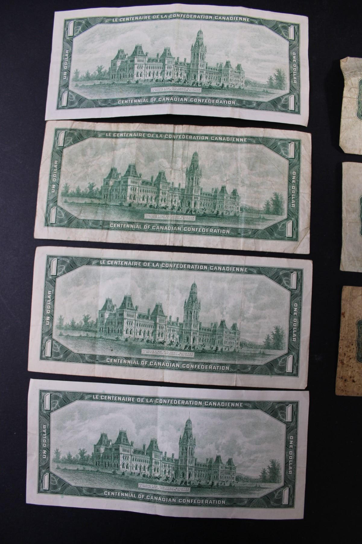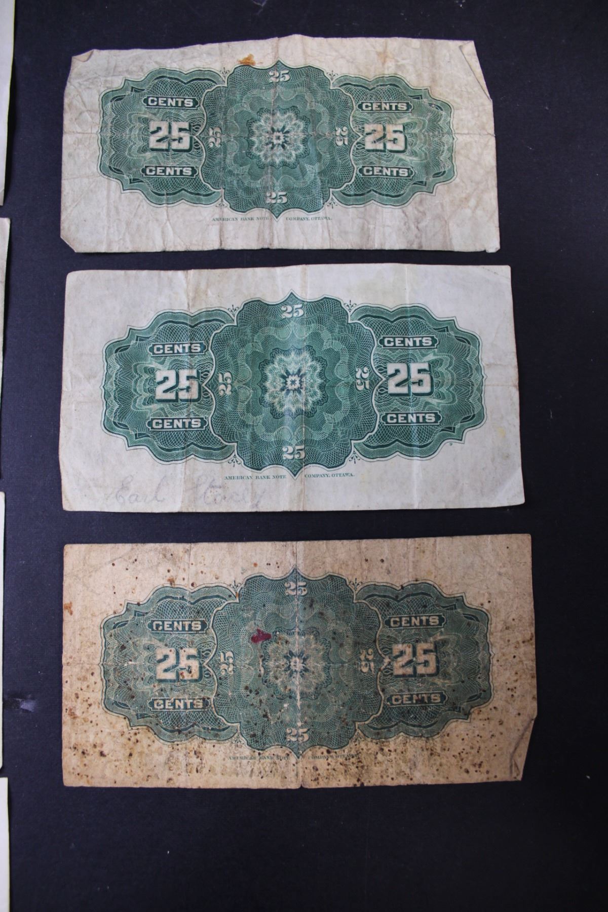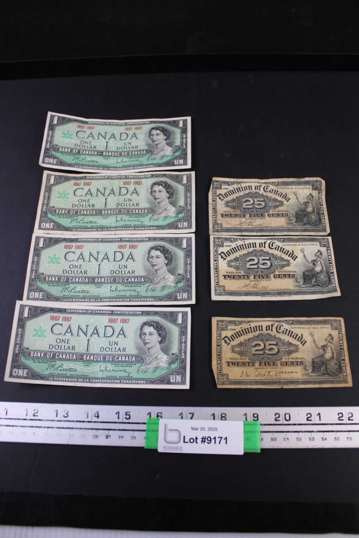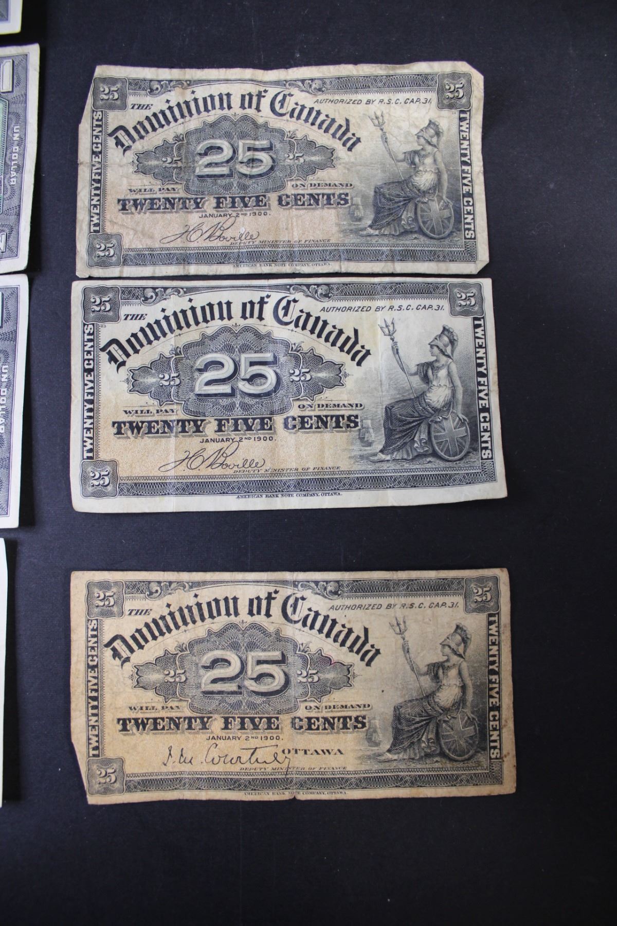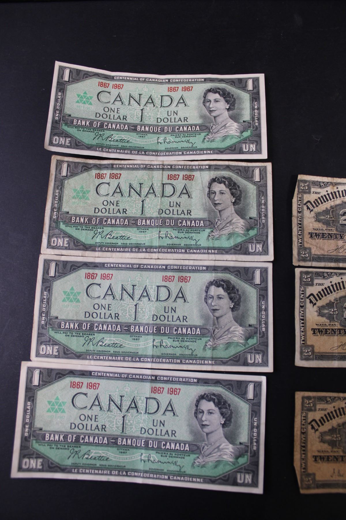 (4) - 1967 Centennial Canadian Dollar Bills with dates, 2 -1900 Boville signed 25 cent Shinplasters and 1 1900 Courtney Signed 25 cent Shinplaster