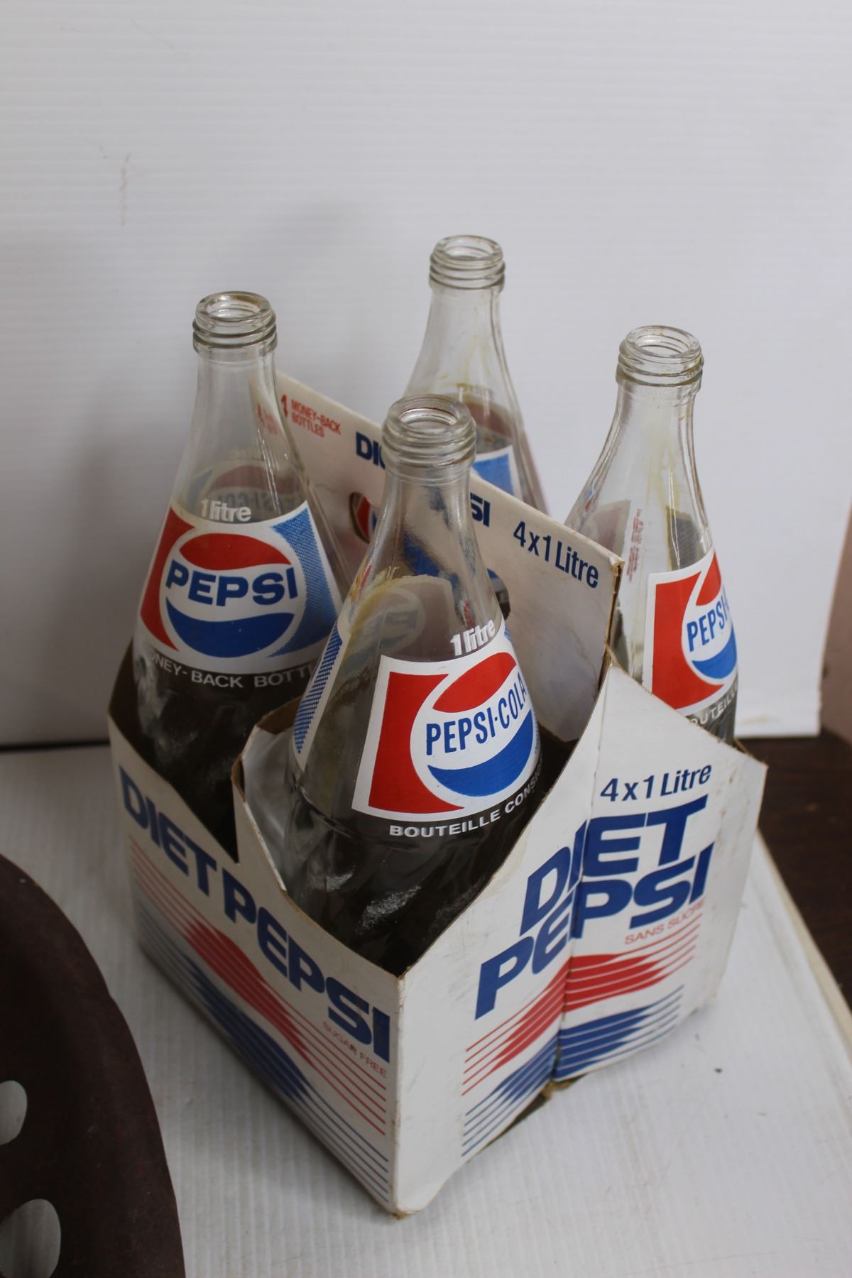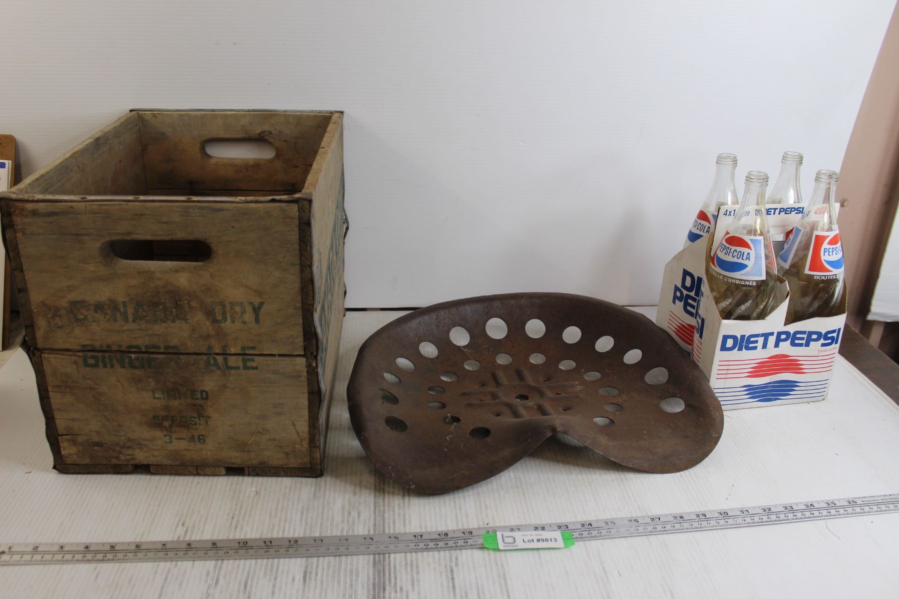 (4) 1L Diet Pepsi Glass Bottles, Canada Dry Wooden Box, Tractor Seat