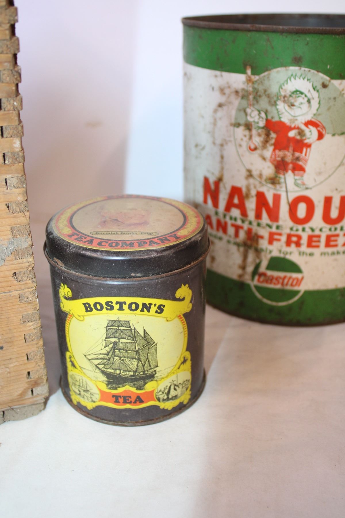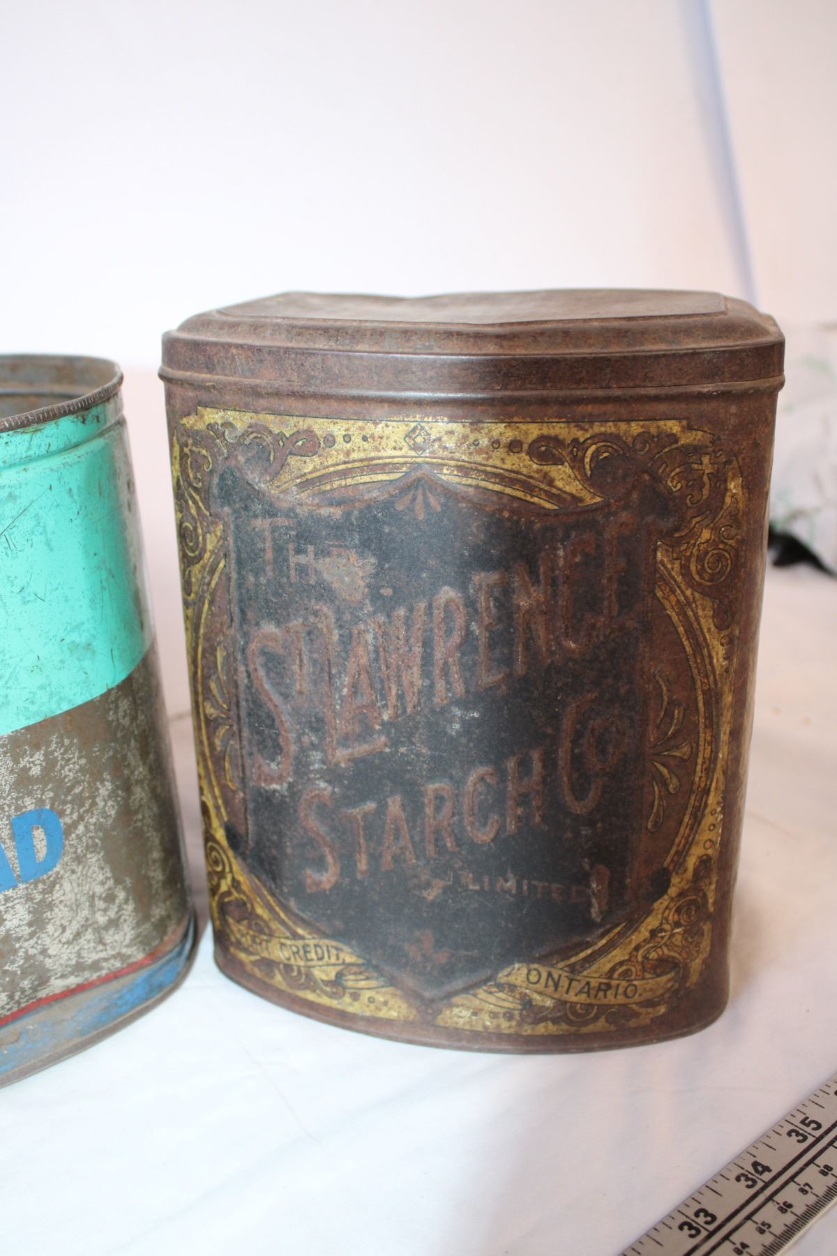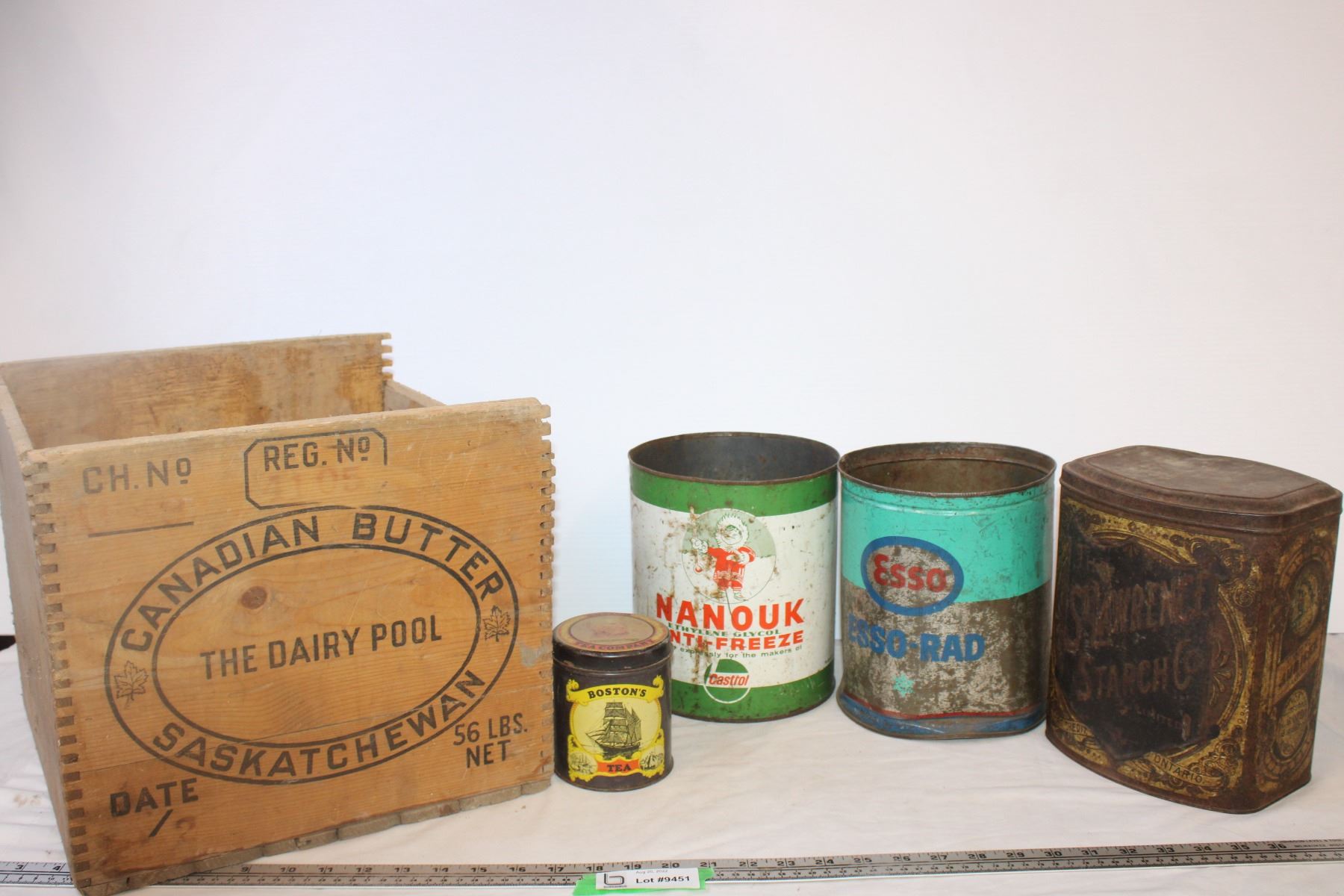 *(4) Antique Tins + Wooden (Saskatchewan) Butter Crate